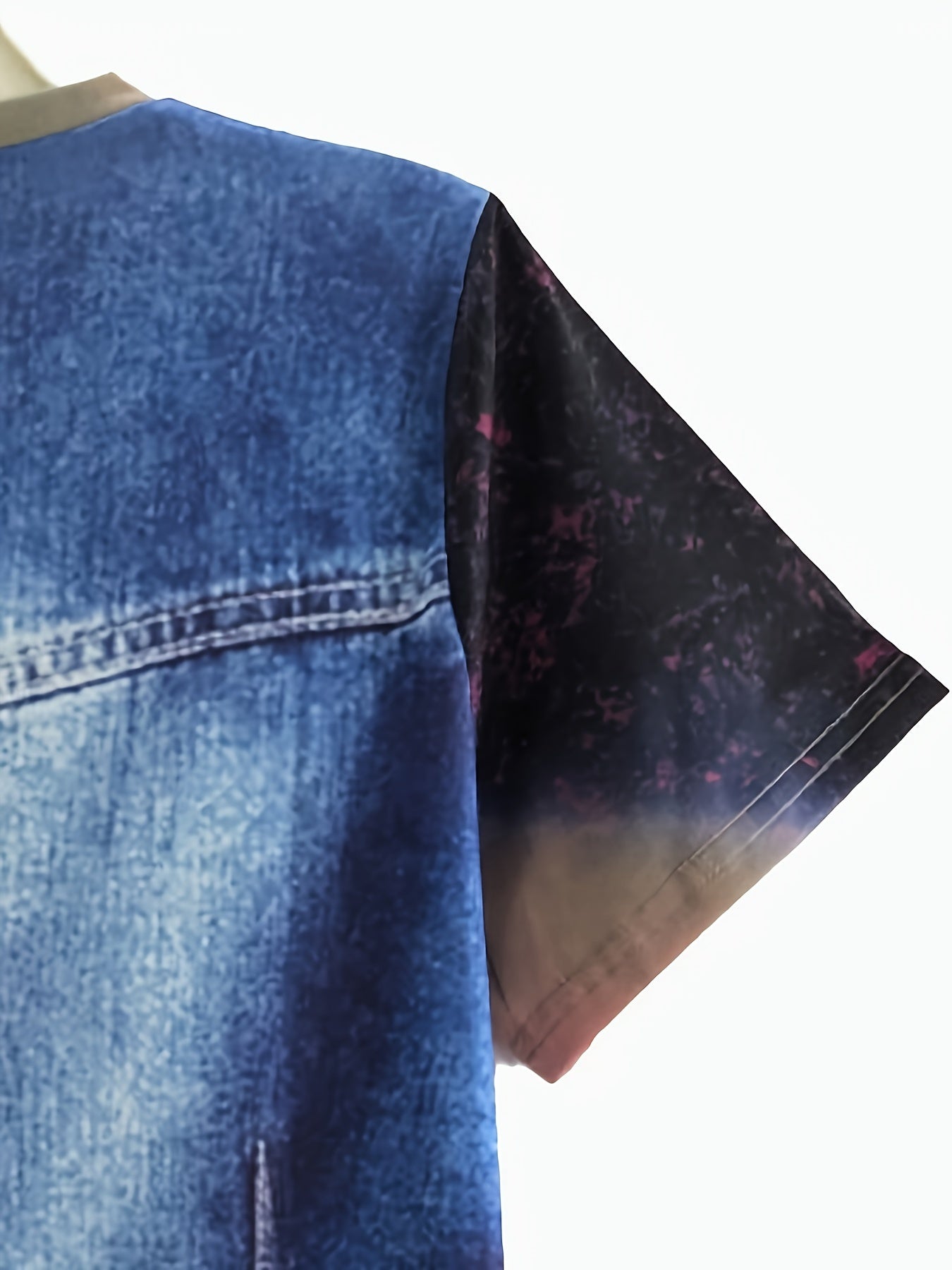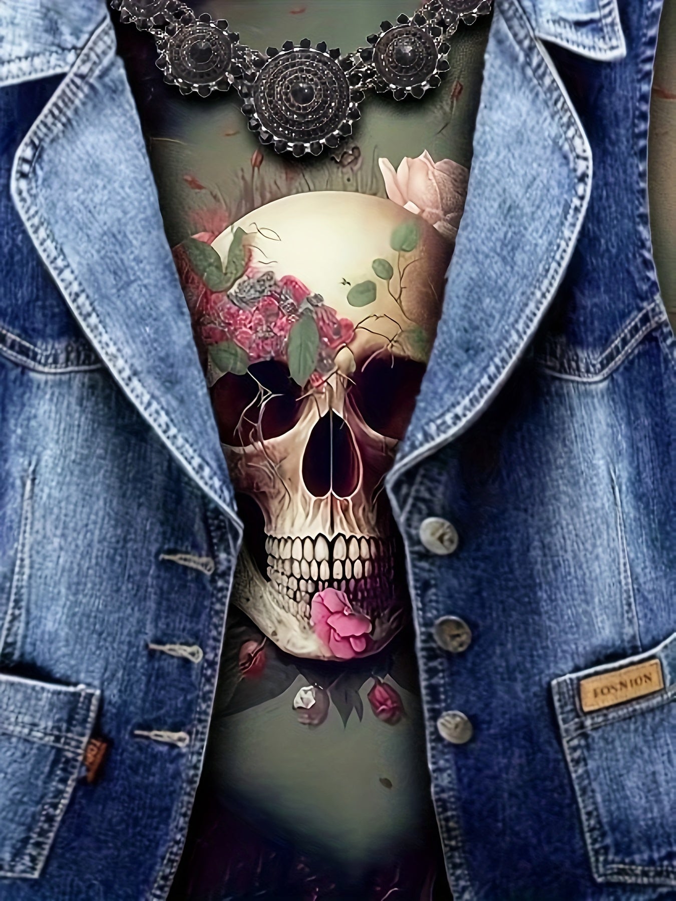 [Denim Vest & Skull Tee] Denim Vest & Skull Print T-shirt, Short Sleeve Crew Neck Leisure T-shirt For Spring & Summer, Women's Clothing