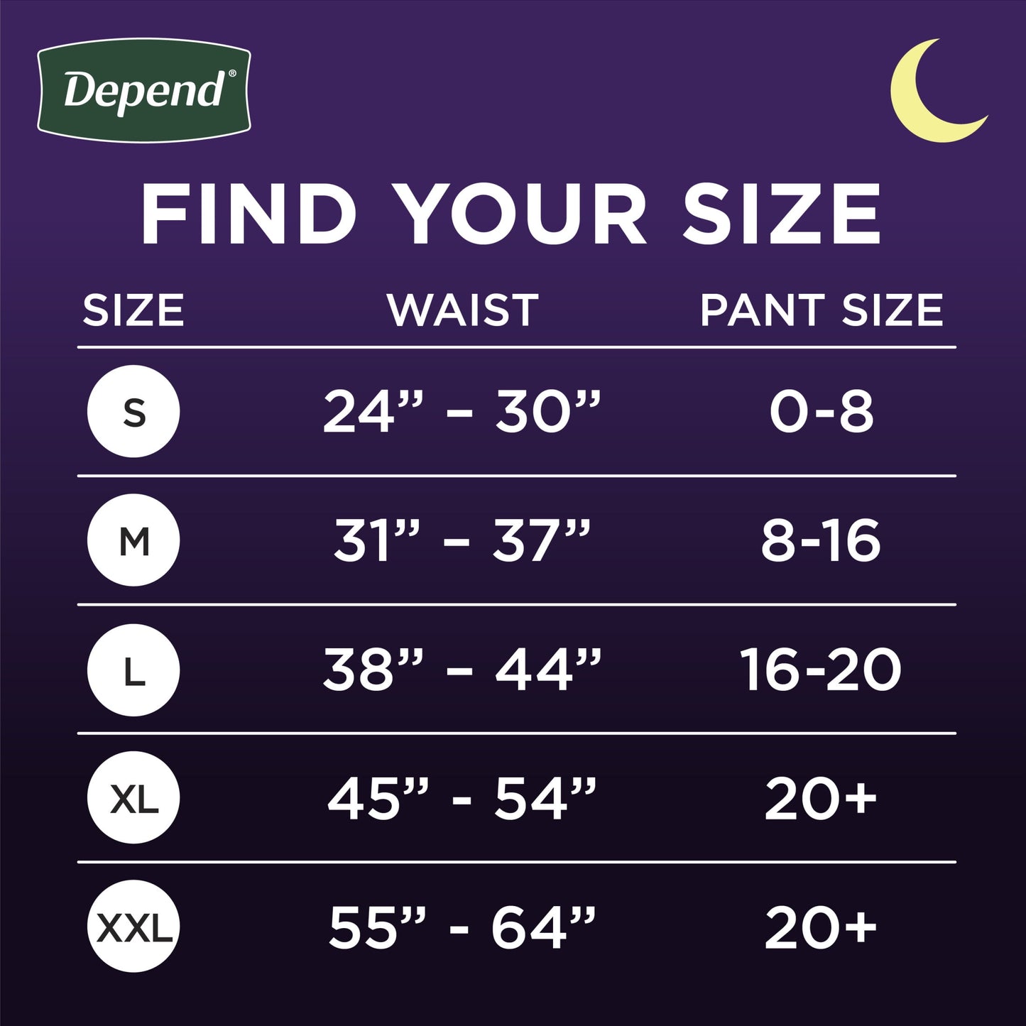 - Depend Night Defense Incontinence Underwear for Women, large (38–44" waist), 14 count; Depend’s packaging and product may vary