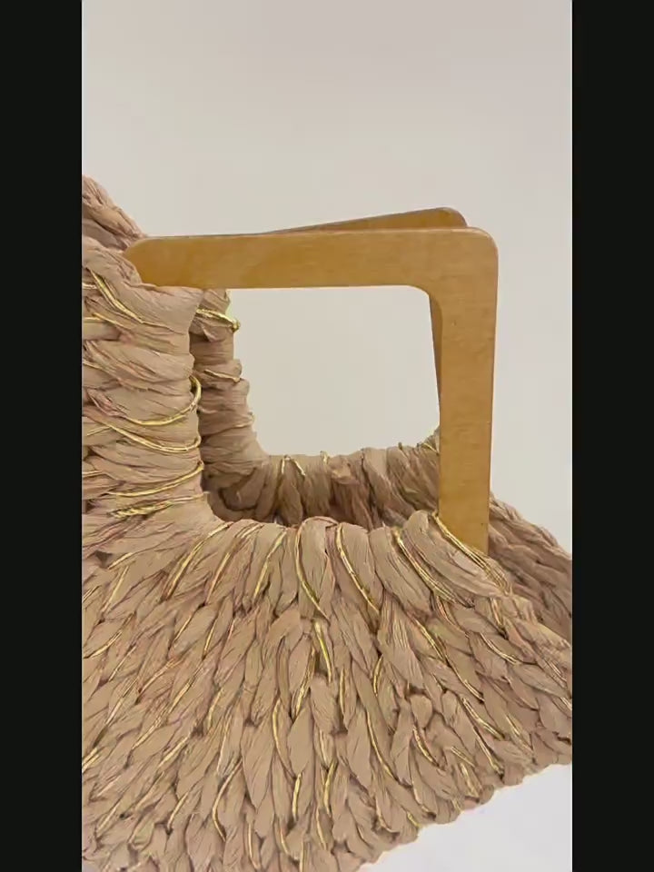 Diamond Shaped Wooden Hand Held Semicircle Straw Bag Gold Silk Mixed Hand Held Woven Bag Vacation Beach Bag Women Bag