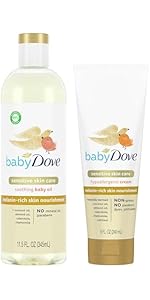 SENSITIVE SKIN CARE: The tip-to-toe body wash and body lotion from Dove keep a baby’s sensitive skin from losing moisture during and after bath time.