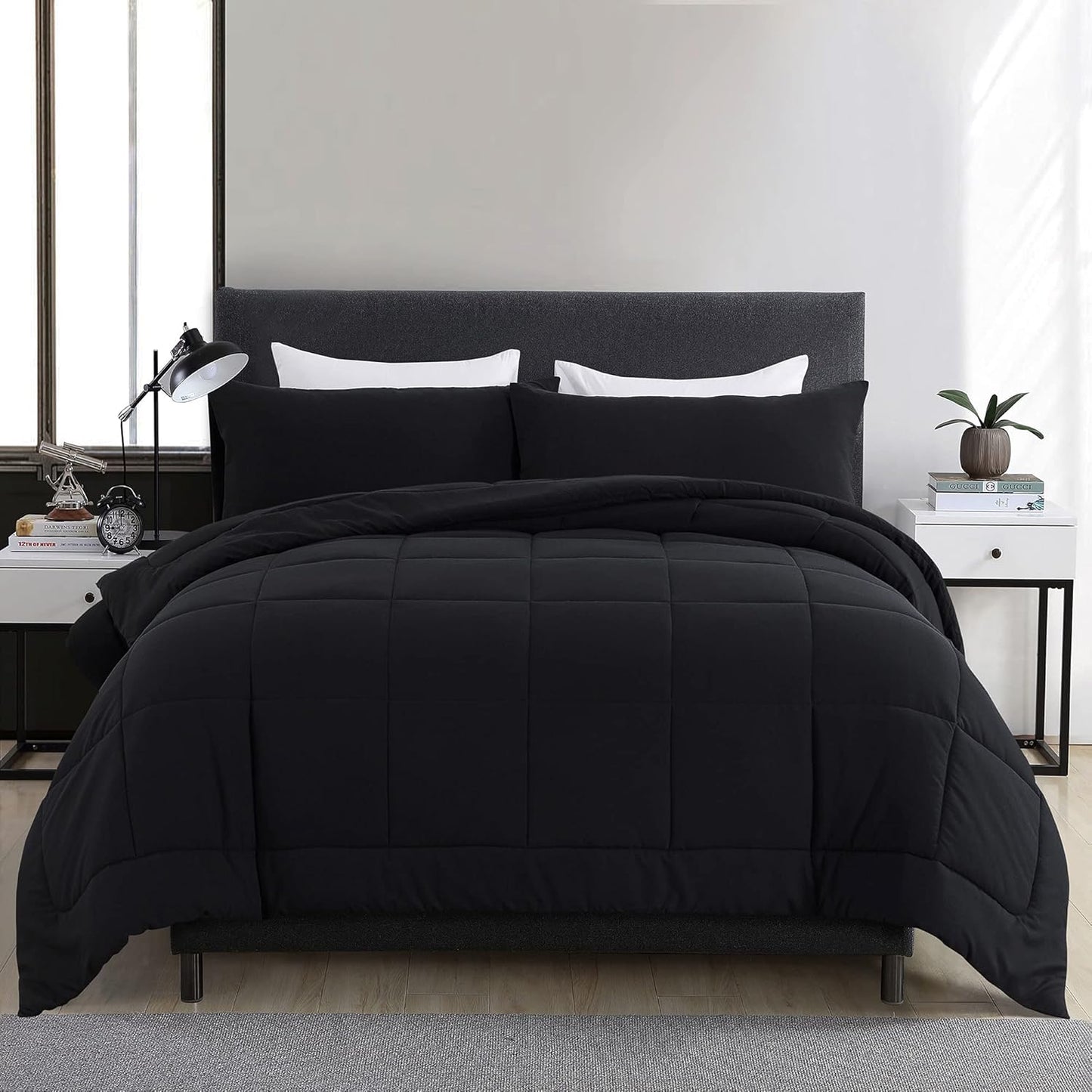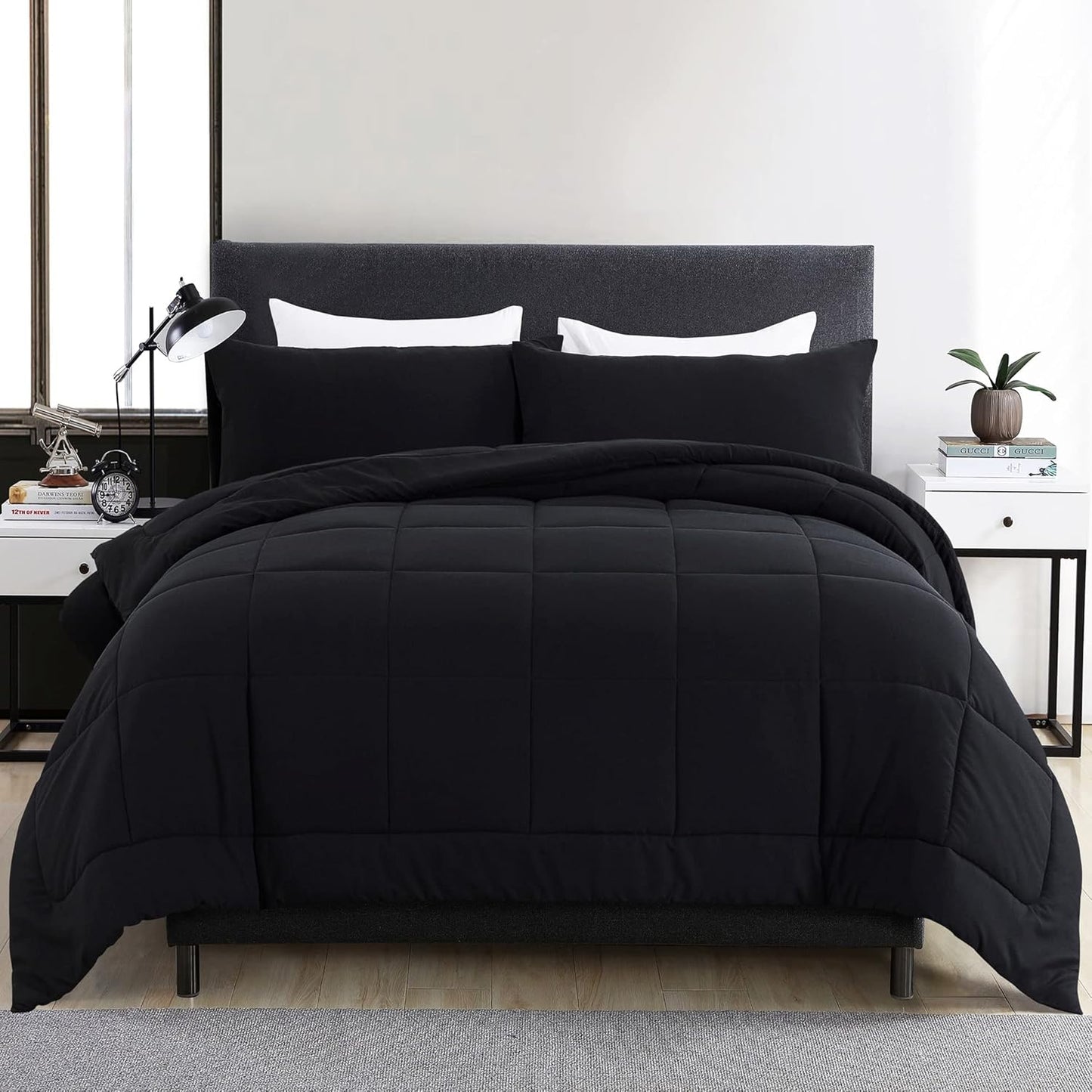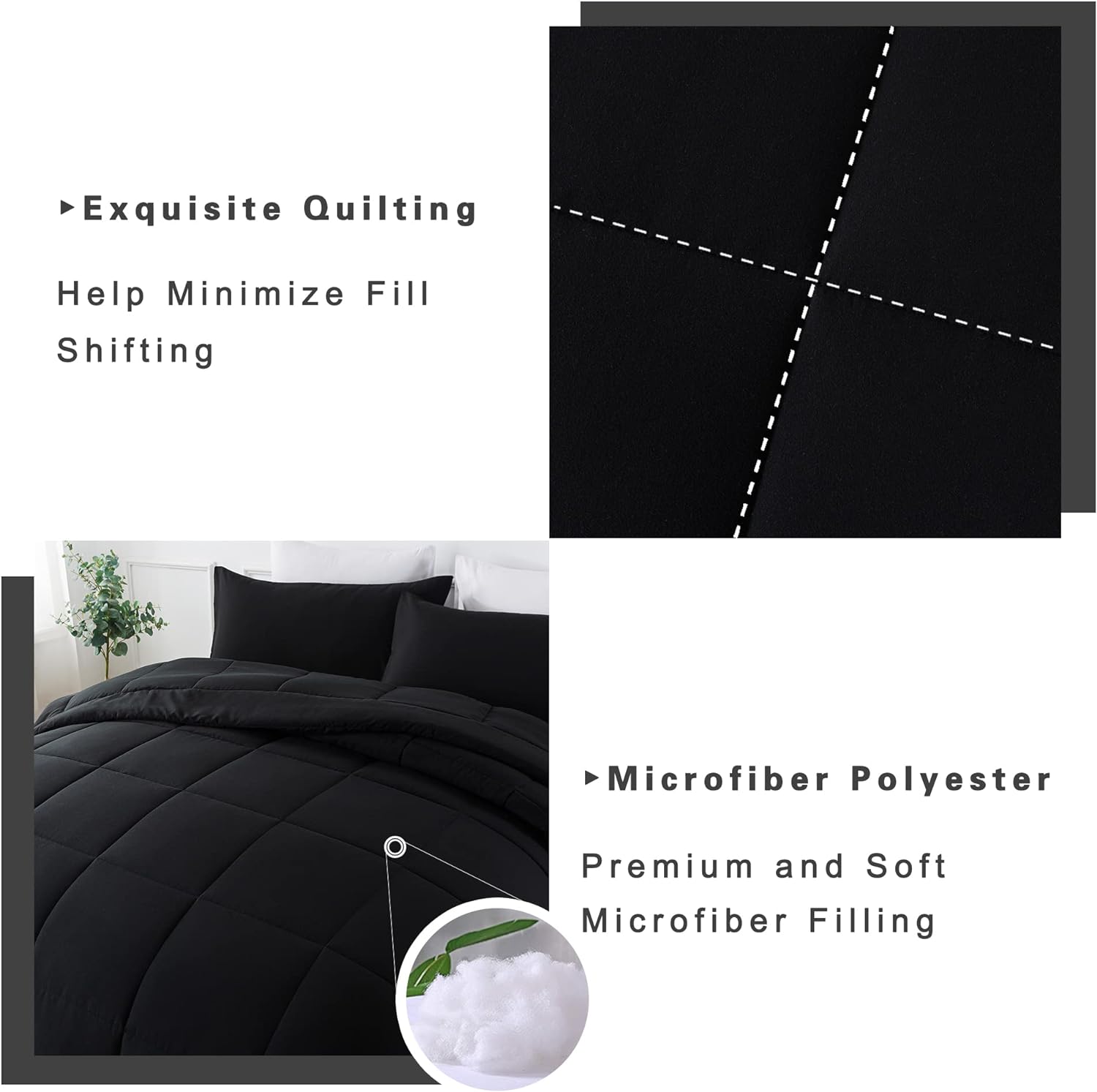 DOWNCOOL Queen Comforter Set -All Season Queen Bed Set with 2 Pillow Cases-3 Pieces Bedding Sets Queen -Down Alternative Black Comforters Queen Size(88"x90")
