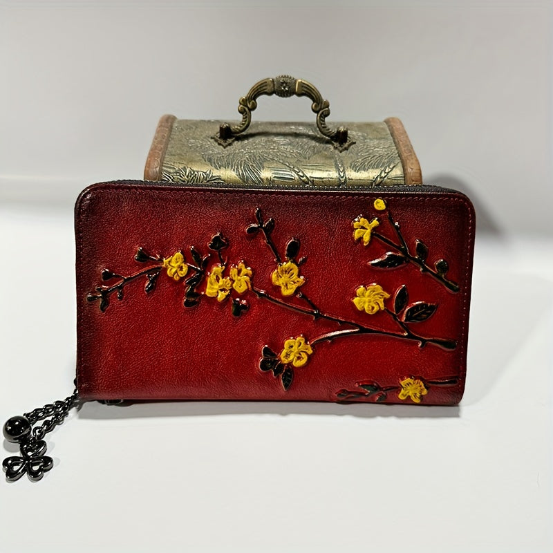 [Durable Build] Vintage Floral Embossed Genuine Genuine Leather Women's Wallet, Red Top Grain Genuine Leather Long Clutch with Removable Wrist Strap, Zippered Coin Purse & Multi-Function Card Holder, Genuine Leather Purse