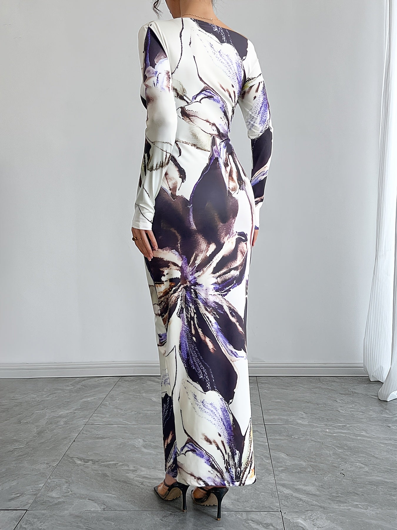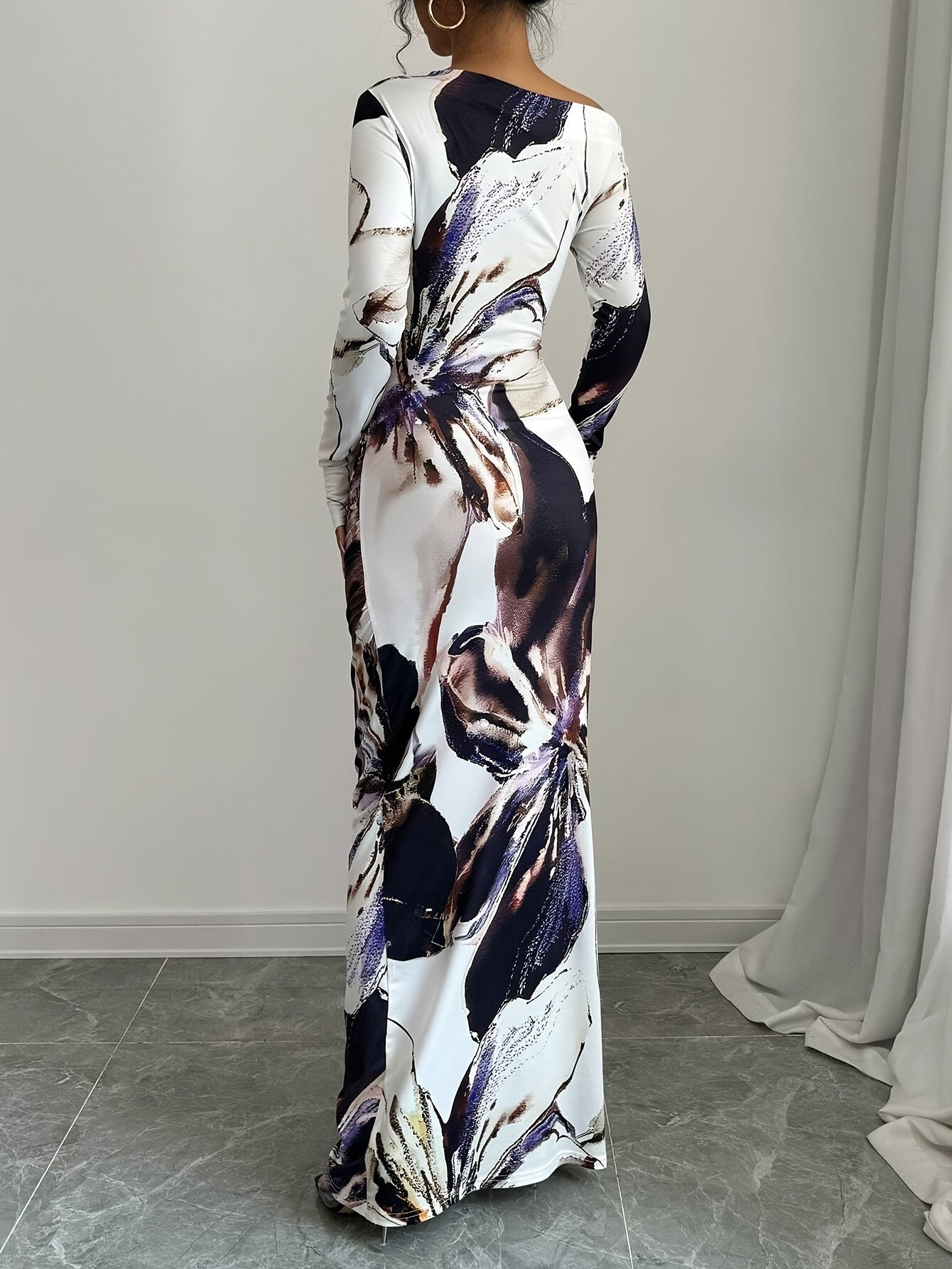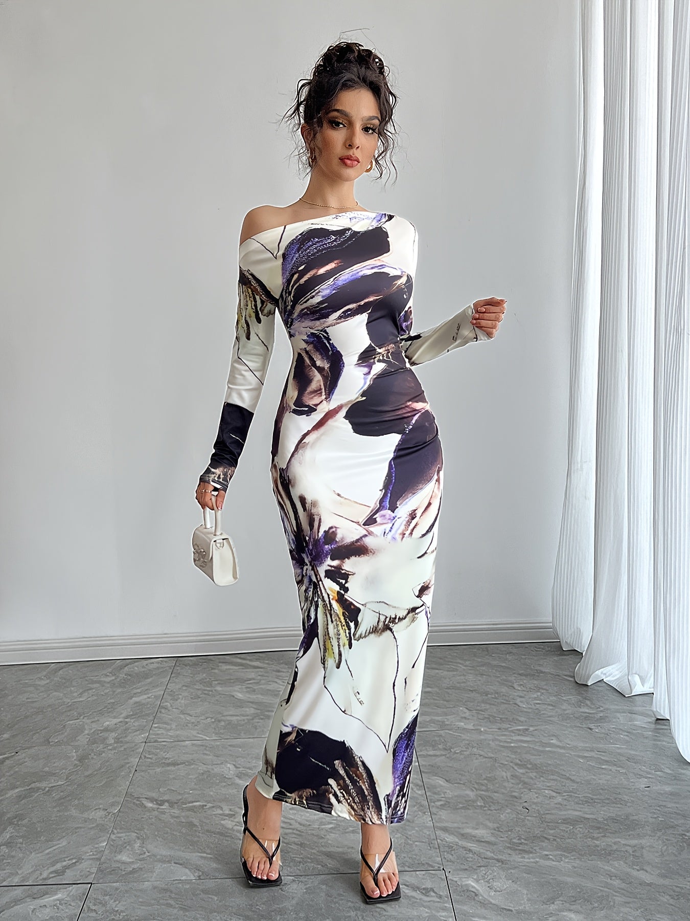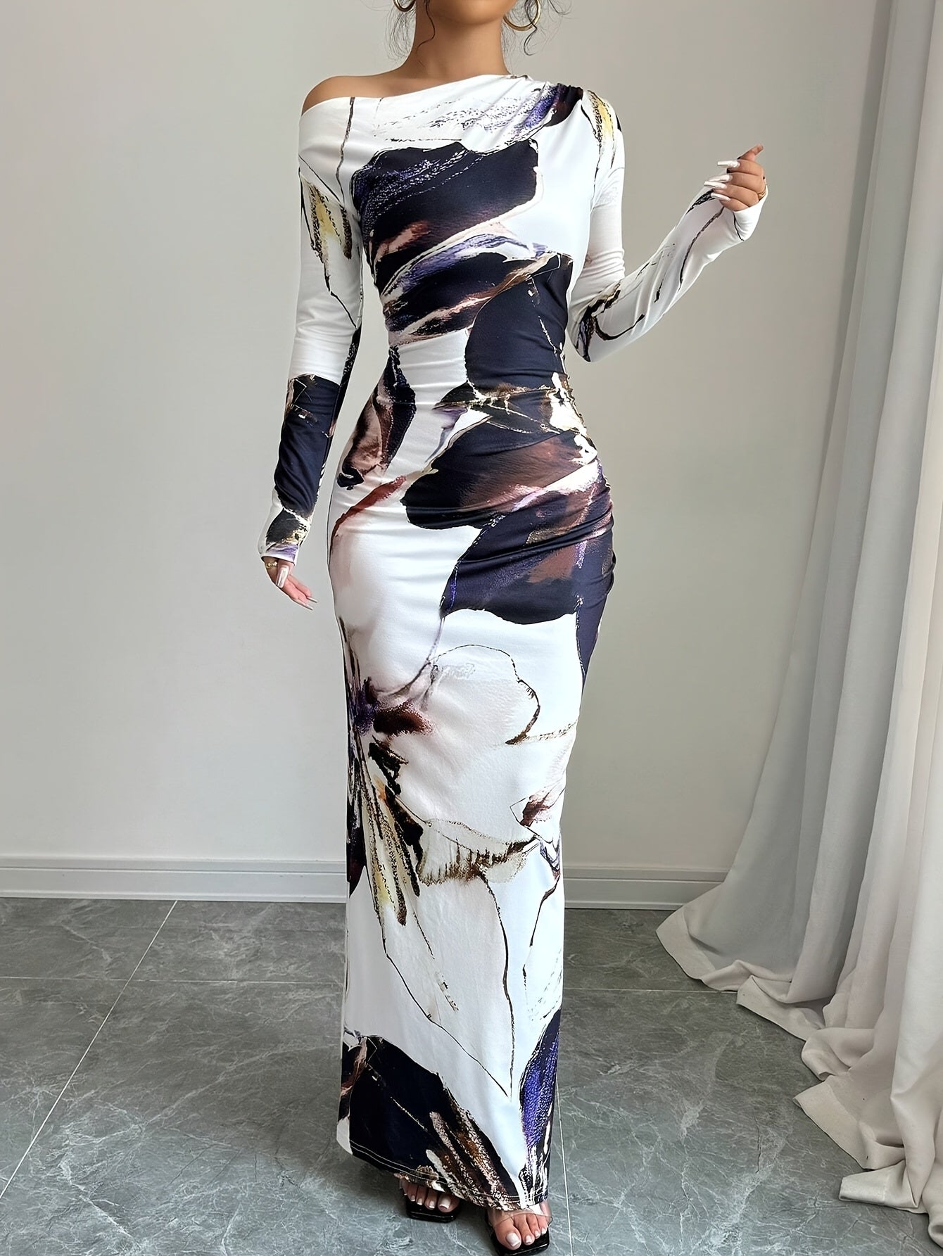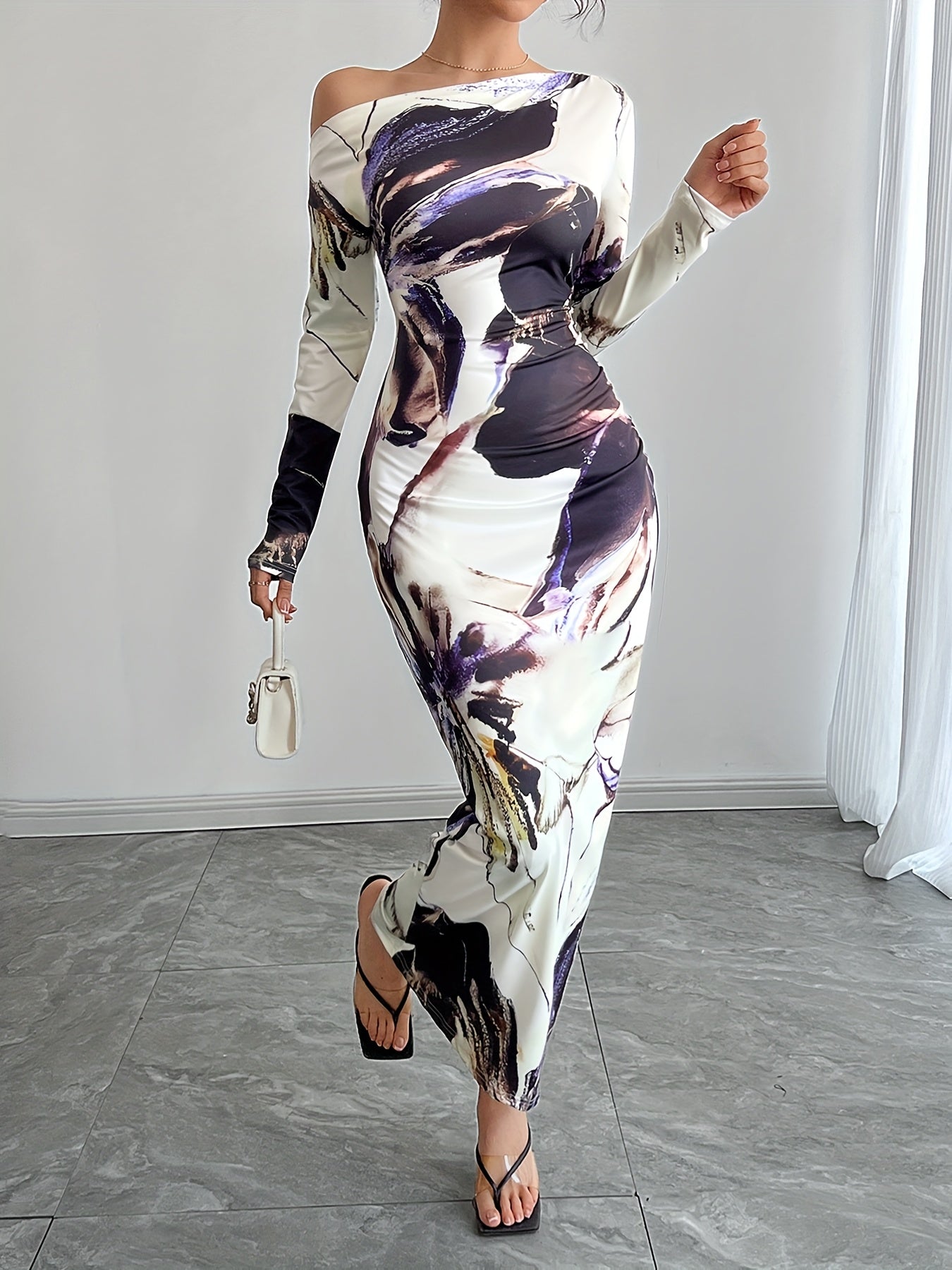Elegant Asymmetrical Neck 100% Polyester Long Sleeve Sheath Dress - Skinny Fit Pencil Hem, Regular Sleeve, Printed Design - 210g/m² Fabric Weight, Spring/Fall Season, No Belt