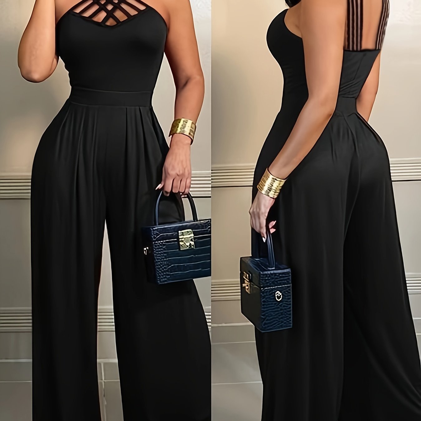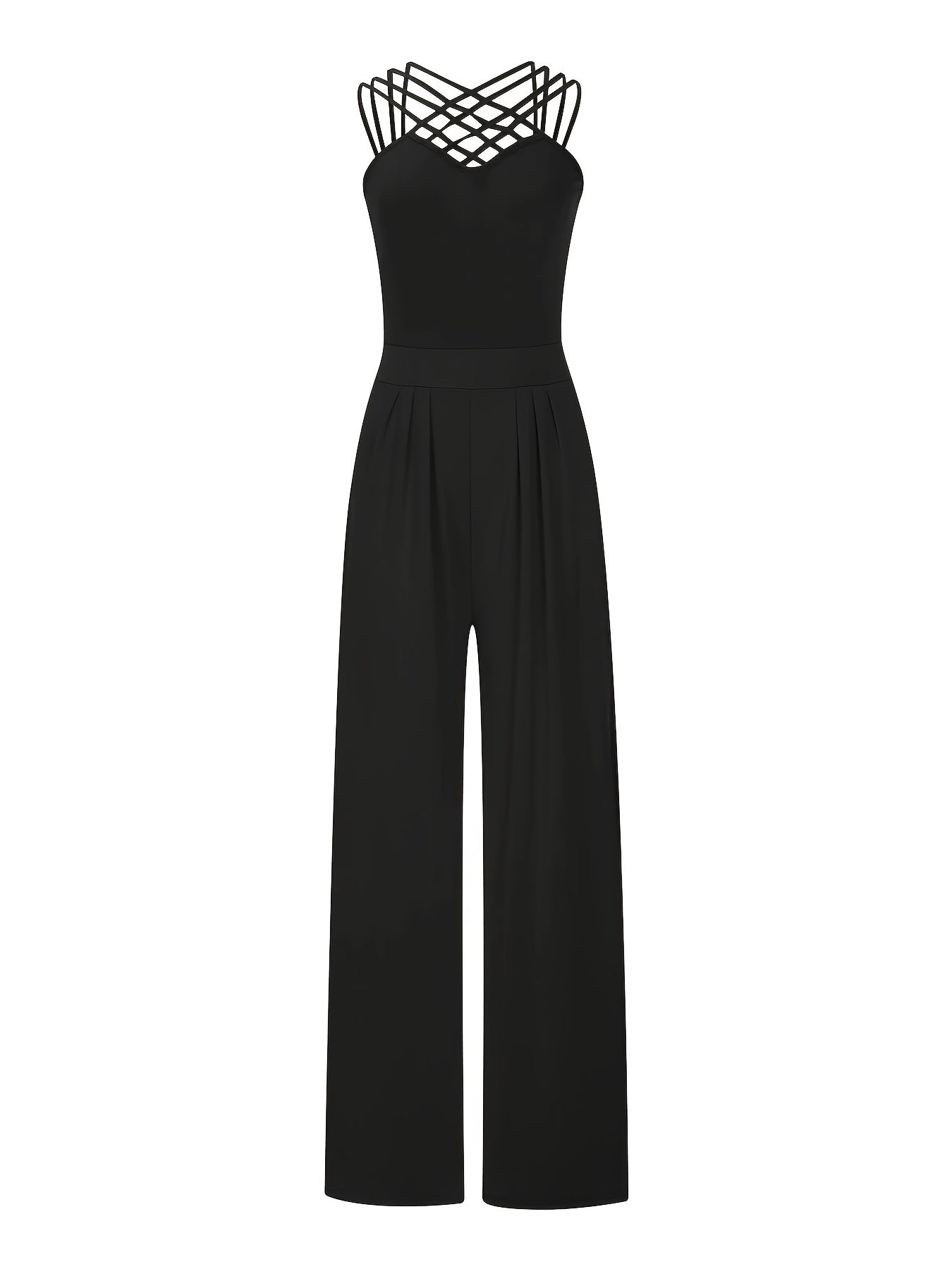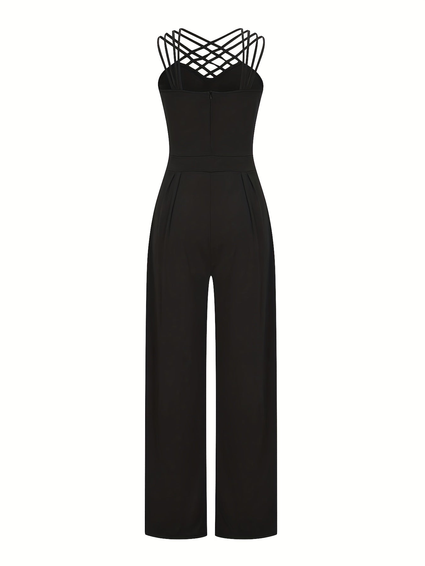 Elegant Black Wide-Leg Jumpsuit for Women - Chic Sleeveless Design with Crisscross Back Detail, 100% Polyester, Machine Washable, Perfect for All Seasons