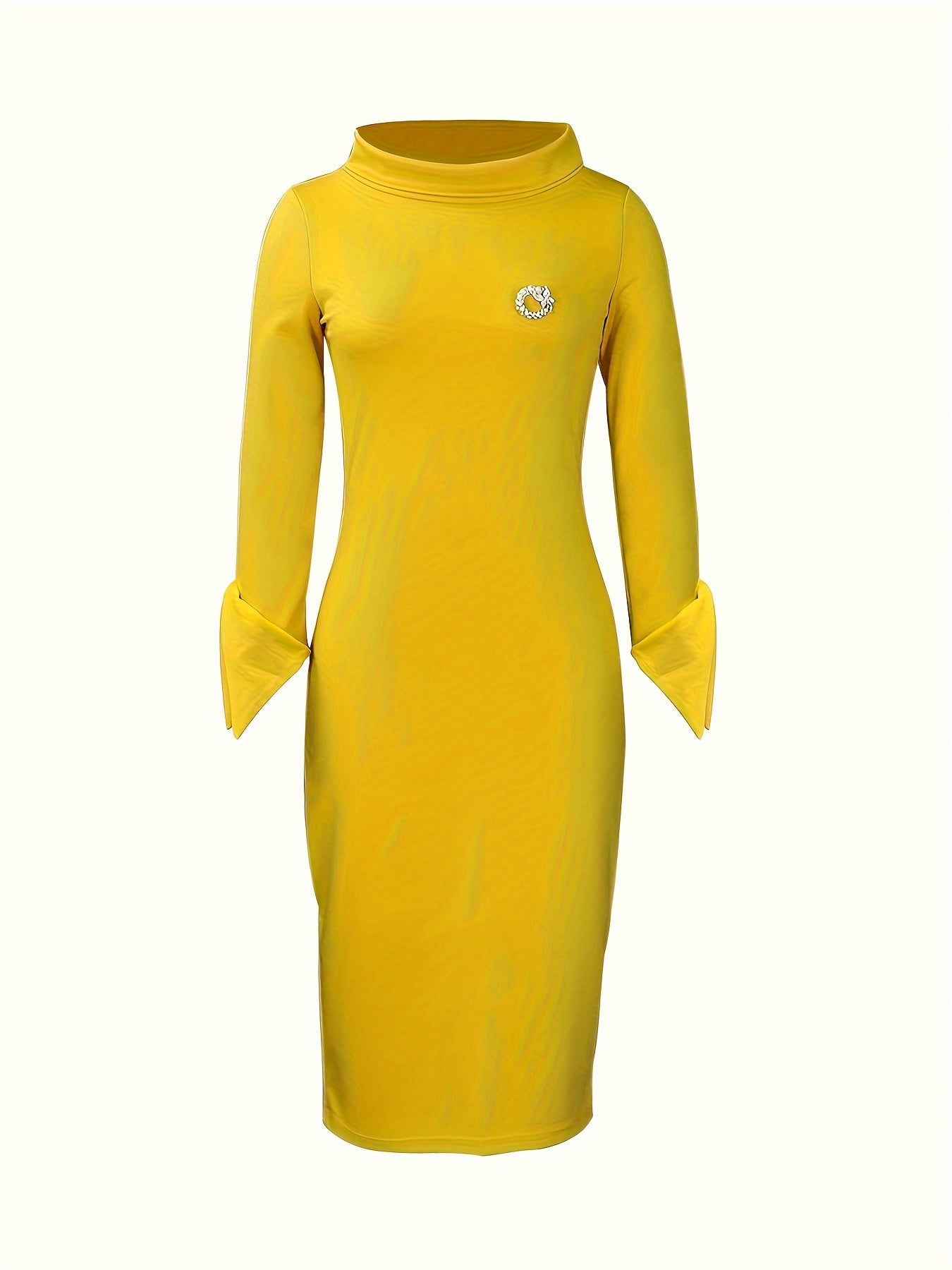 Elegant Bodycon Dress Collection - Long Sleeve, Mock Neck, Stretchy Fabric, Machine Washable, Perfect for Spring, Summer, and Fall Occasions - Chic Brooch Accent, Flattering Fit, and Comfortable Wear