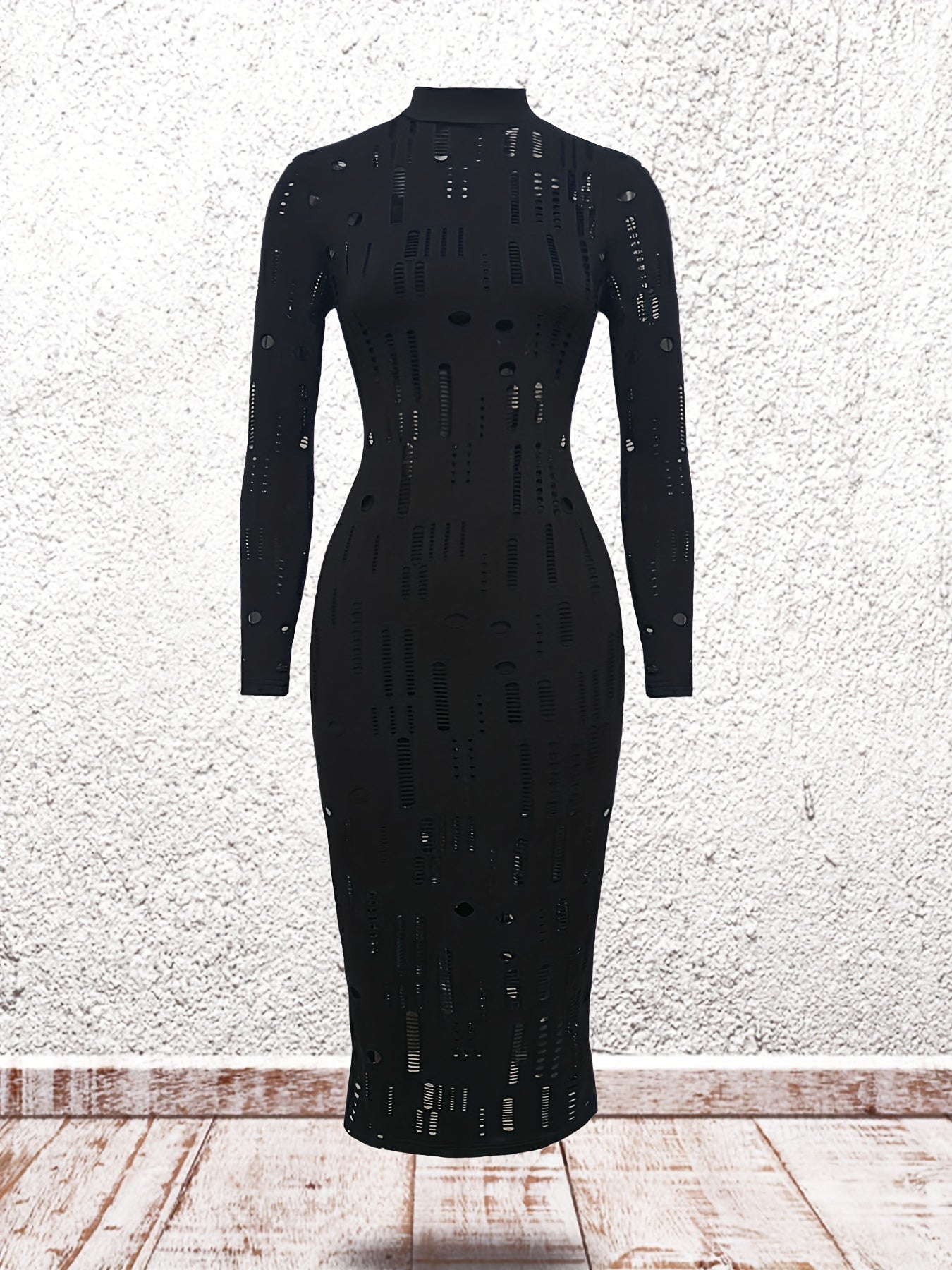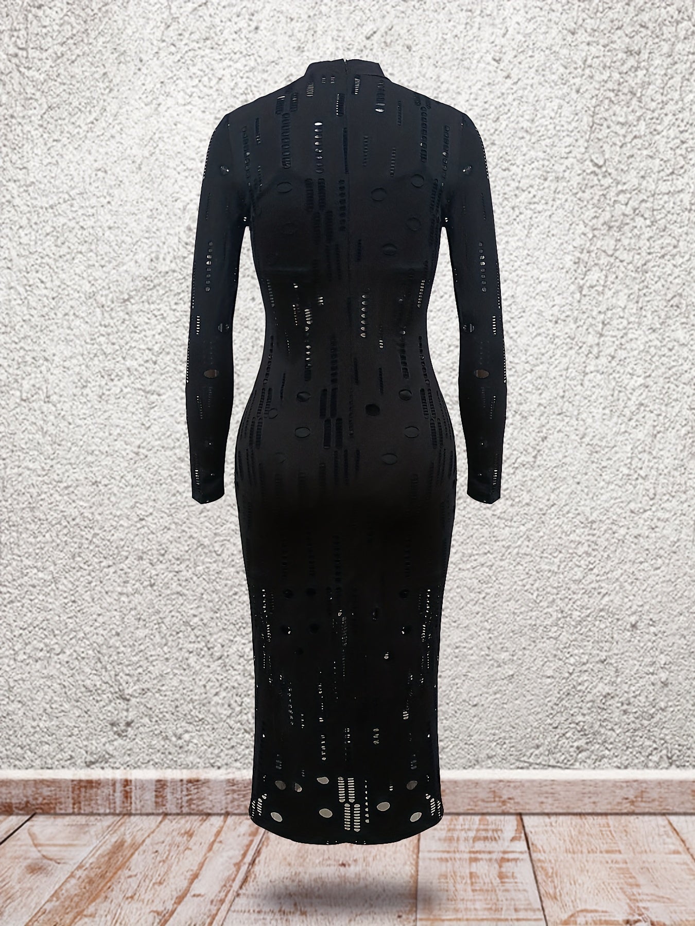 [Elegant Bodycon Dress Set] High Neck Stretchy Elegant Women's Bodycon Dress Set - Polyester Blend, Machine Washable, Long Sleeve, Sheer Cut-Out
