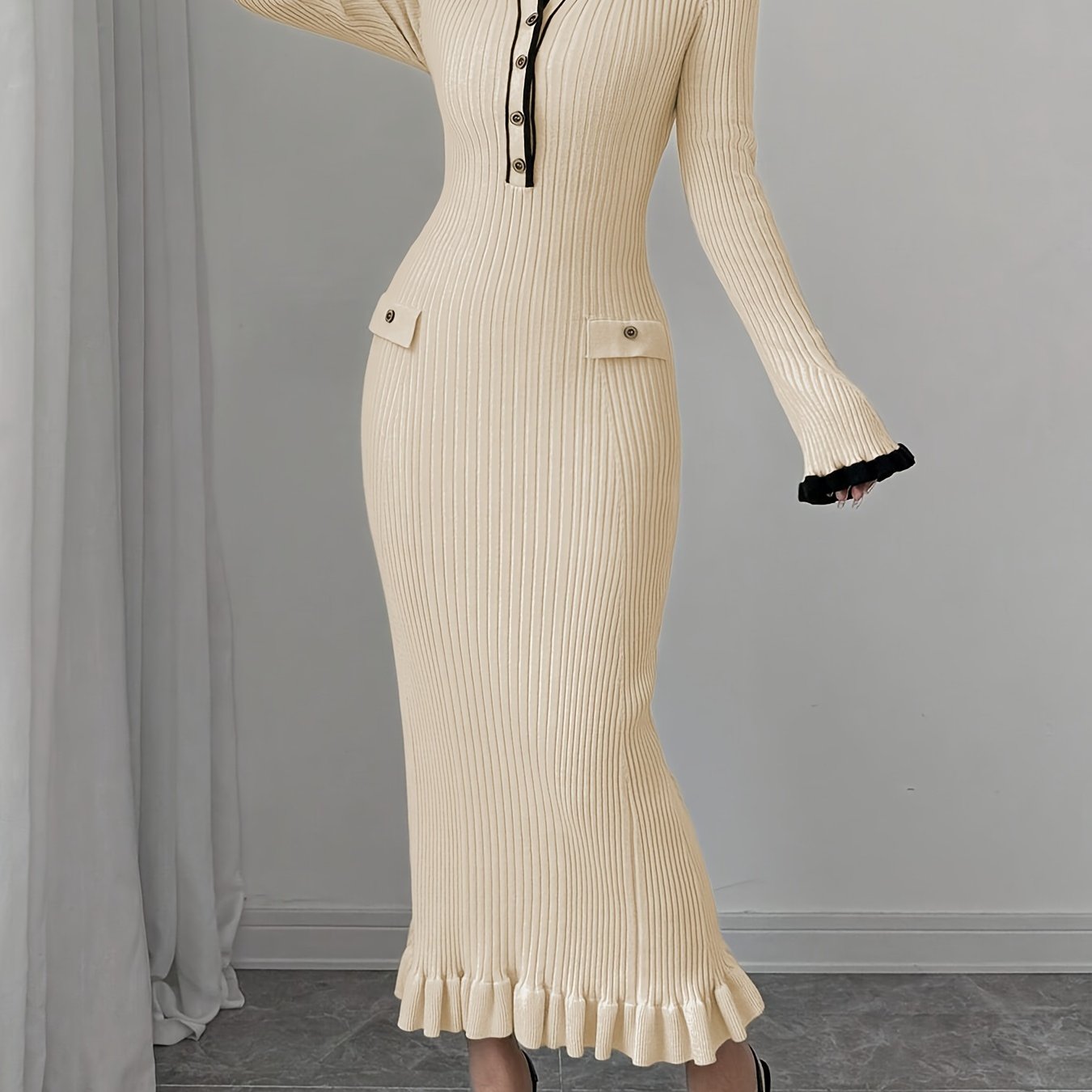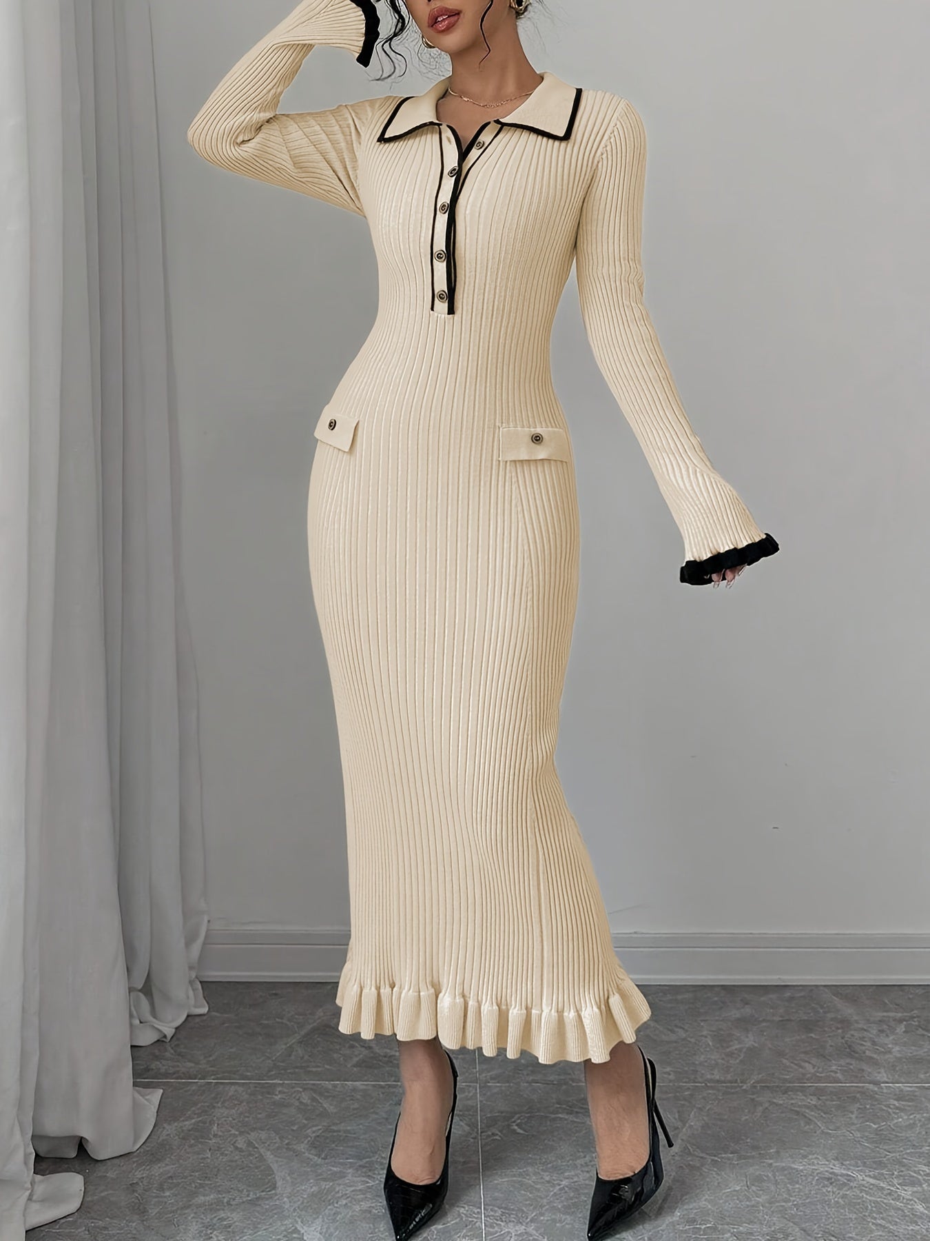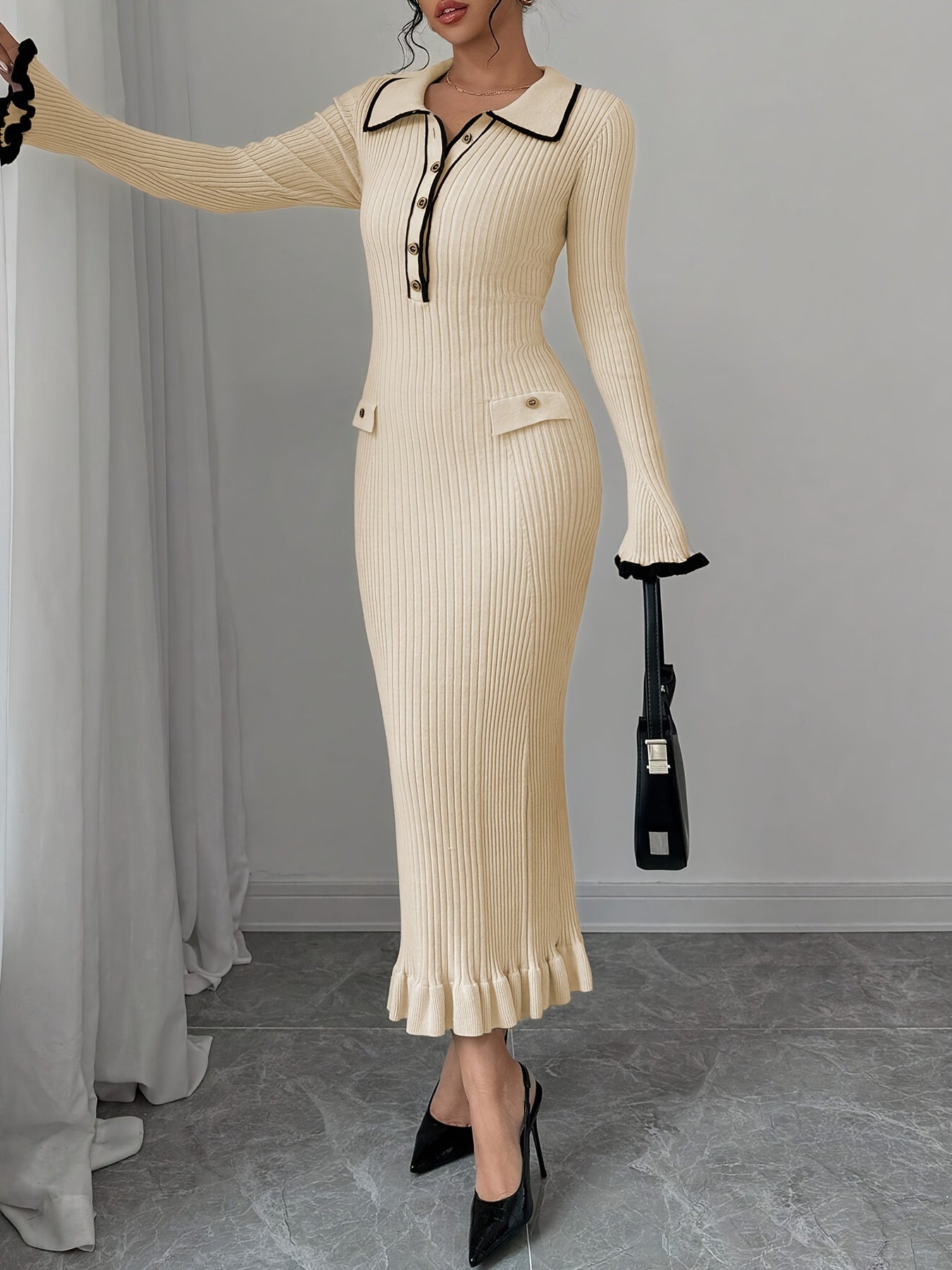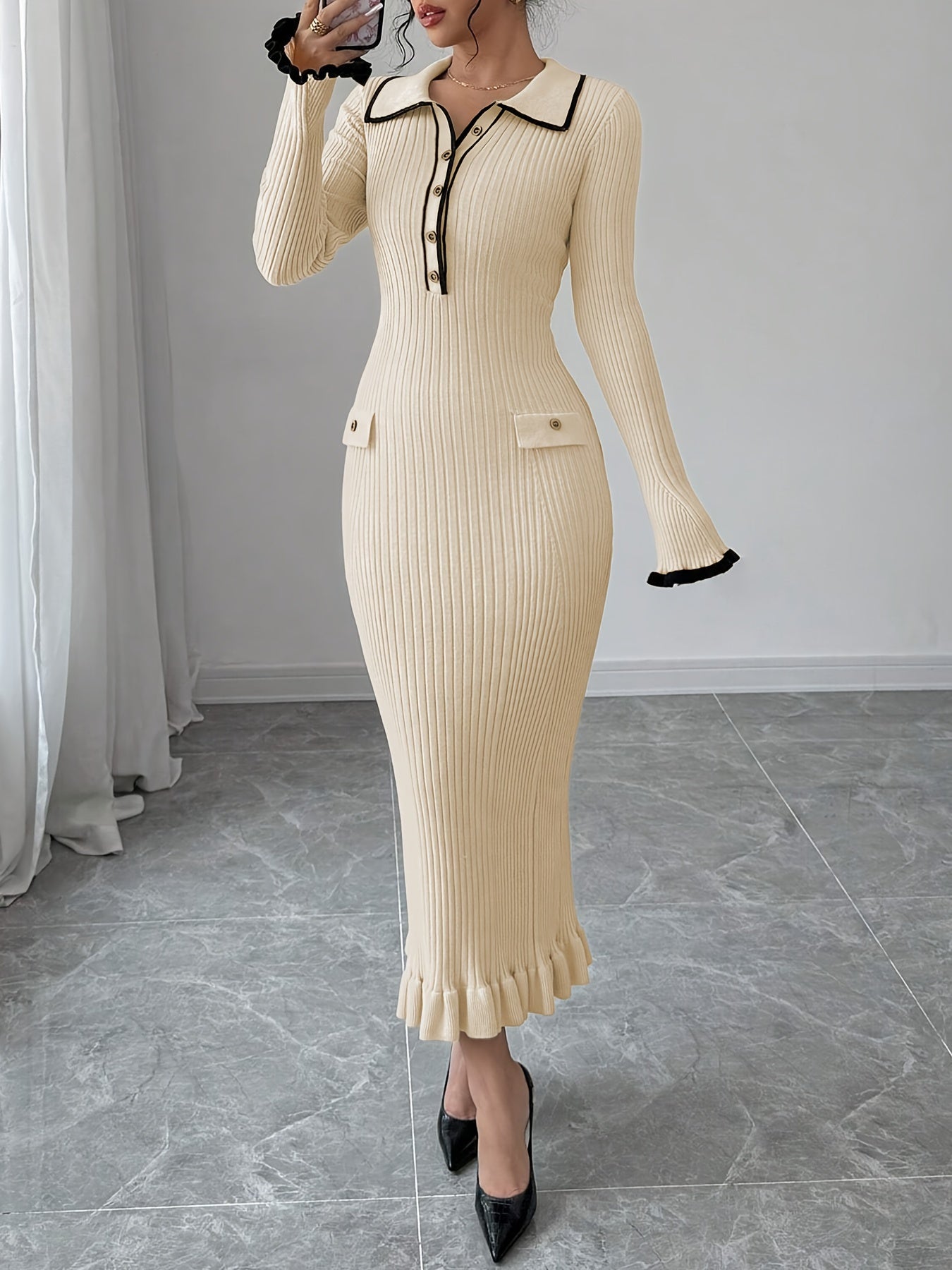 Elegant Color Block Sweater Dress for Women - Long Sleeve, Bodycon Fit with Button Detail & Ruffle Hem, Perfect for Spring & Fall