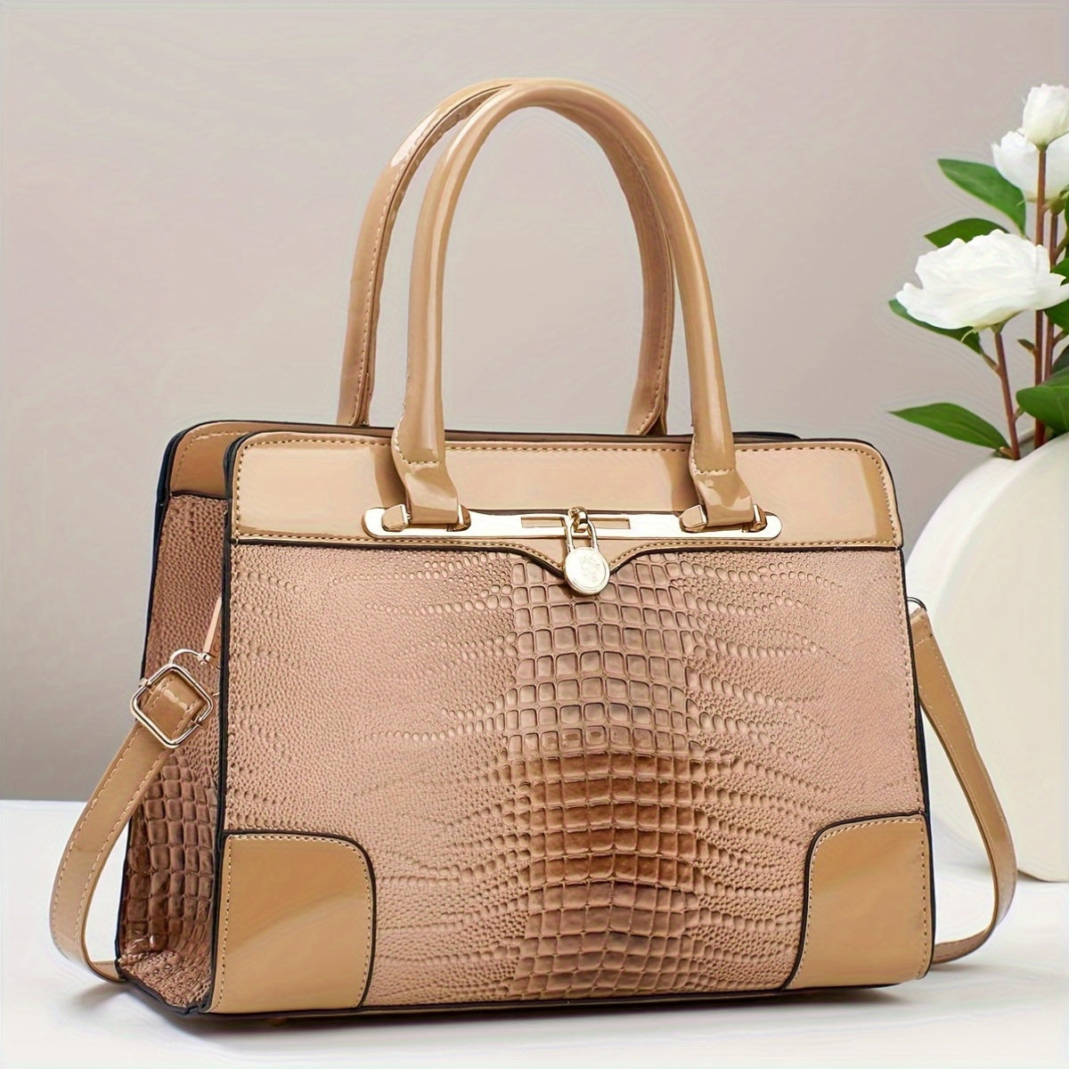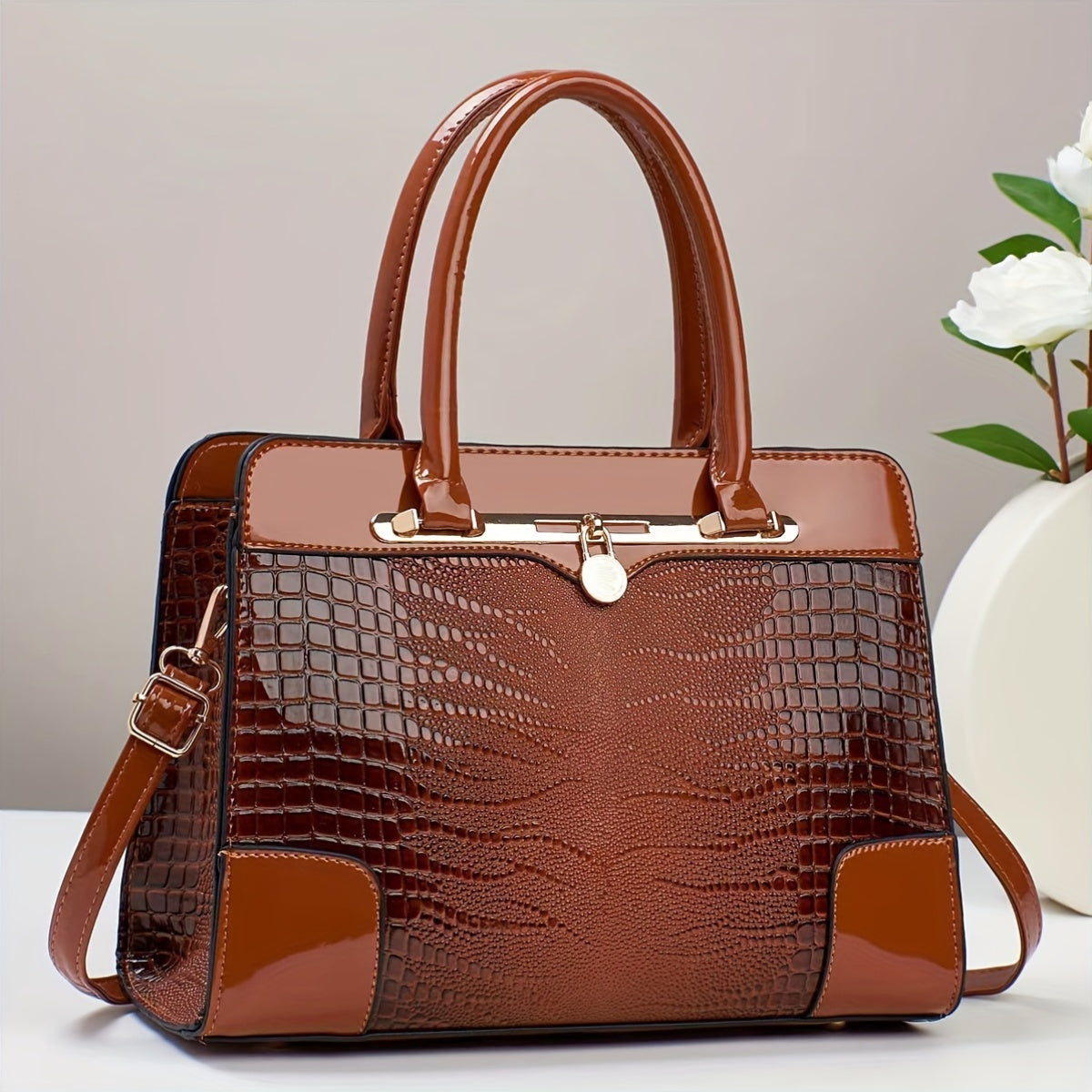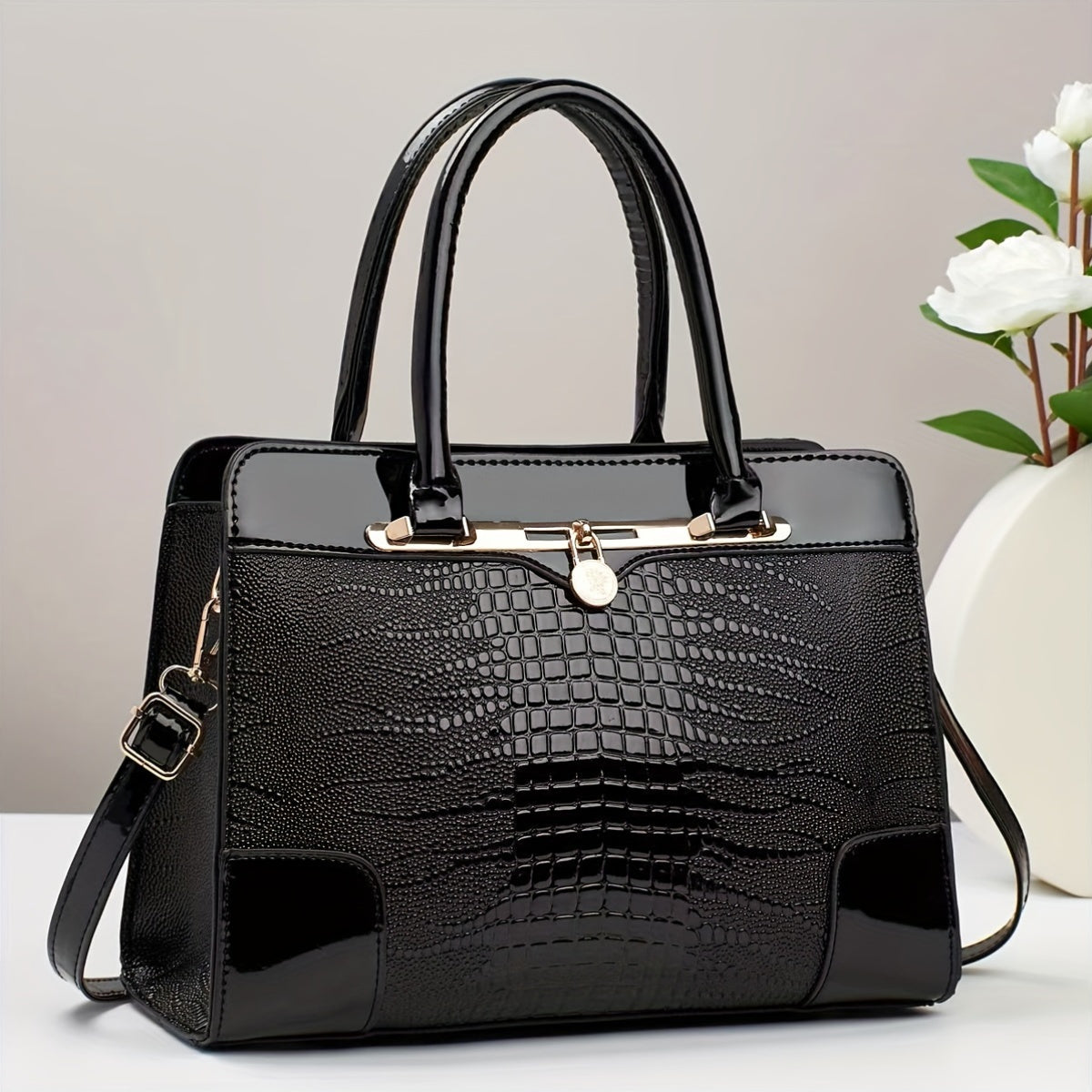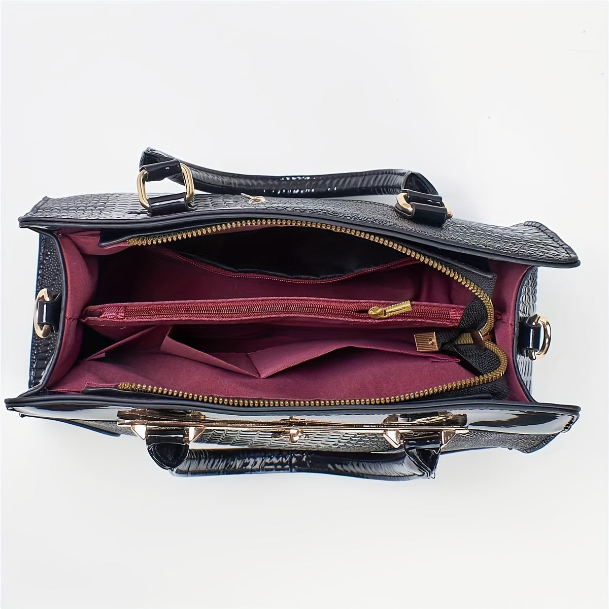 Elegant Crocodile Pattern Handbag for Women, Large Capacity Shoulder Bag with Zipper Closure, Polyester Lined, Edge Painted, Versatile for Various Occasions - Red