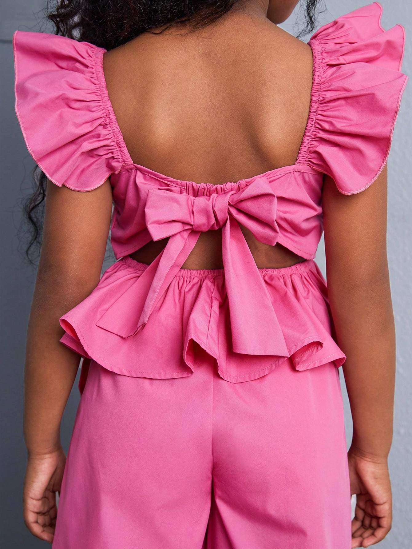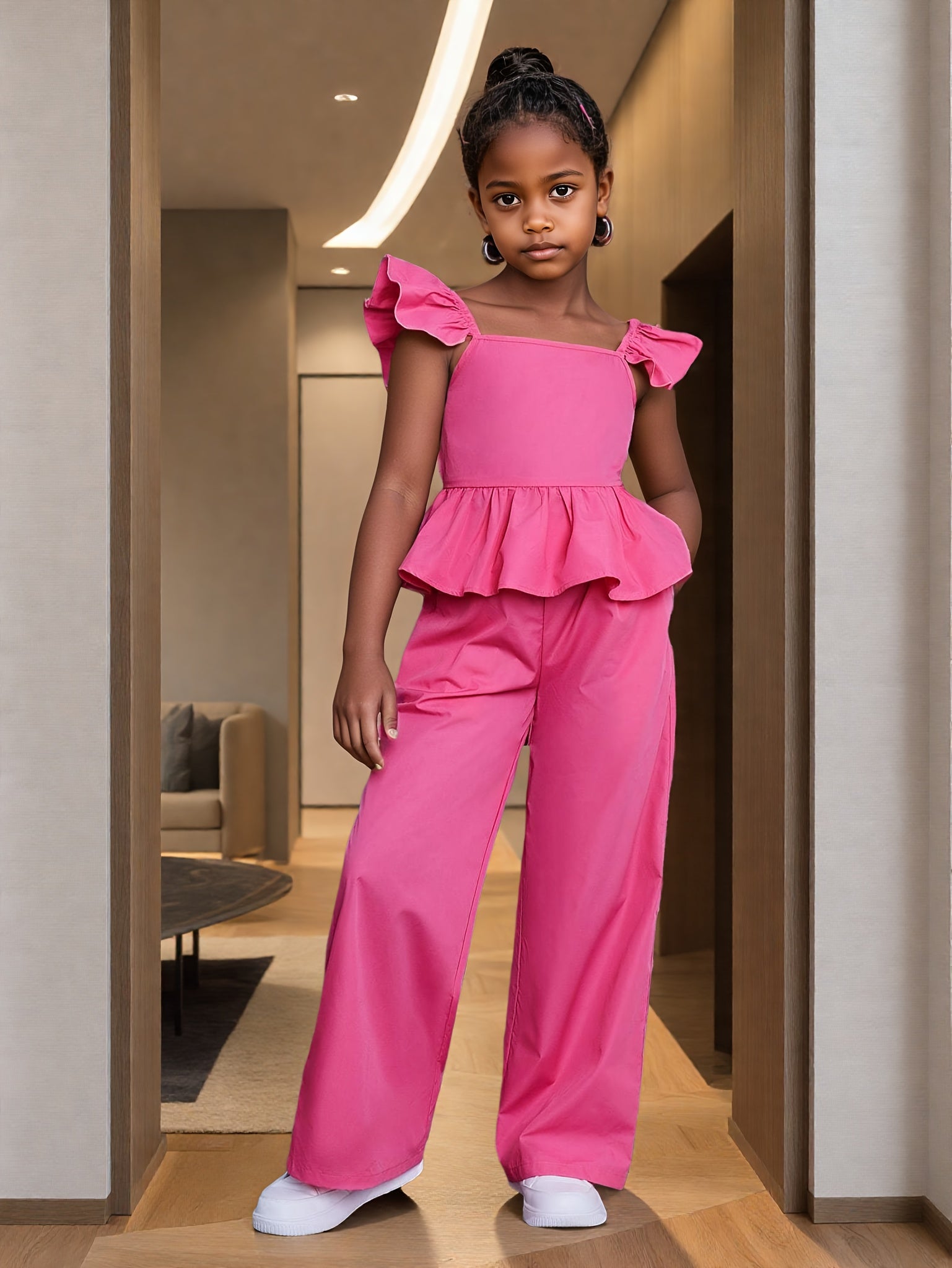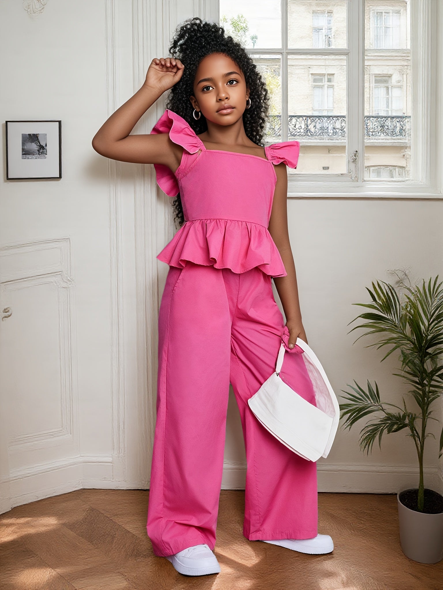 Elegant Everyday Pink Woven Solid Color Cap Sleeve Shirt And Long Pants Set with Pocket for Tween Girls