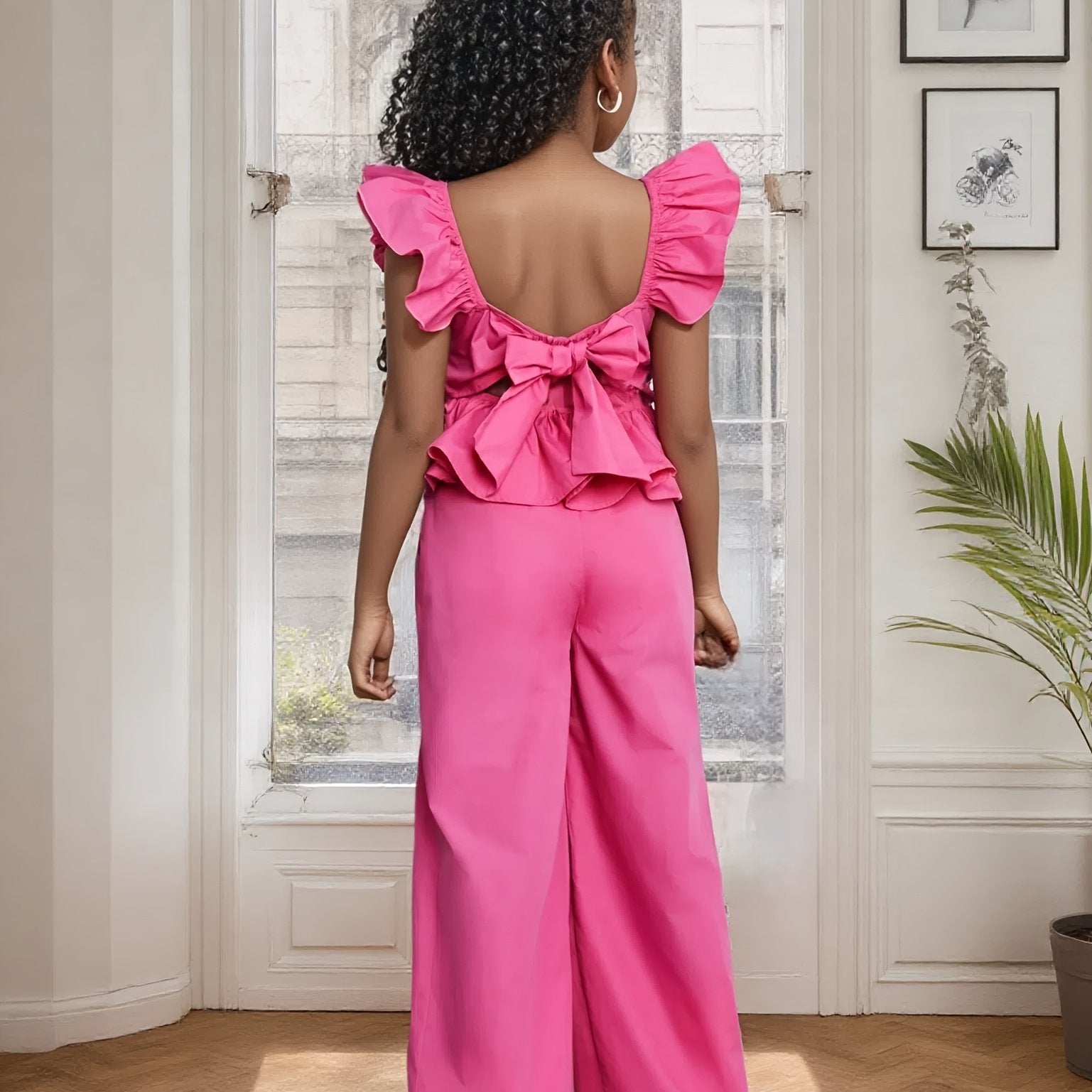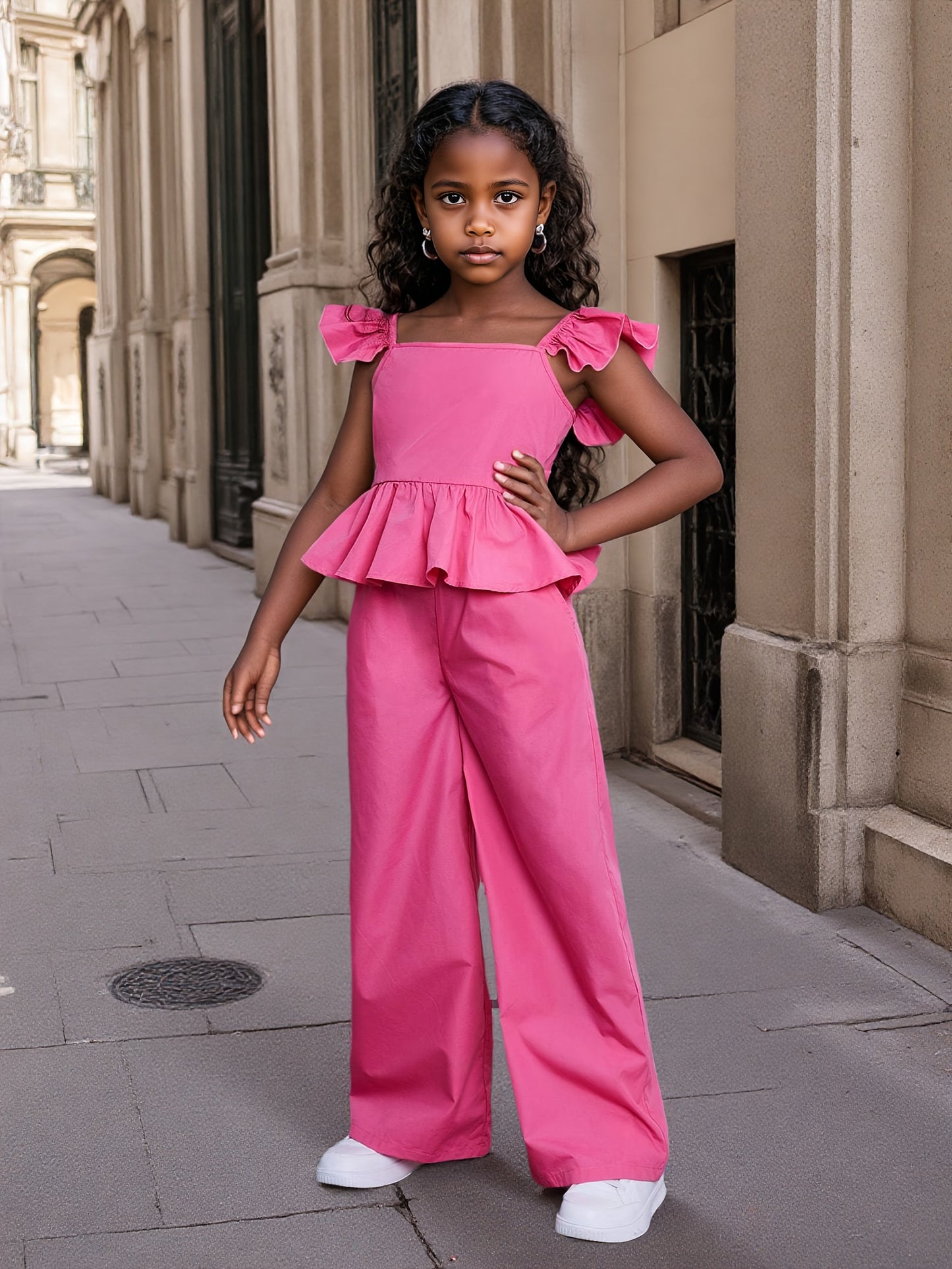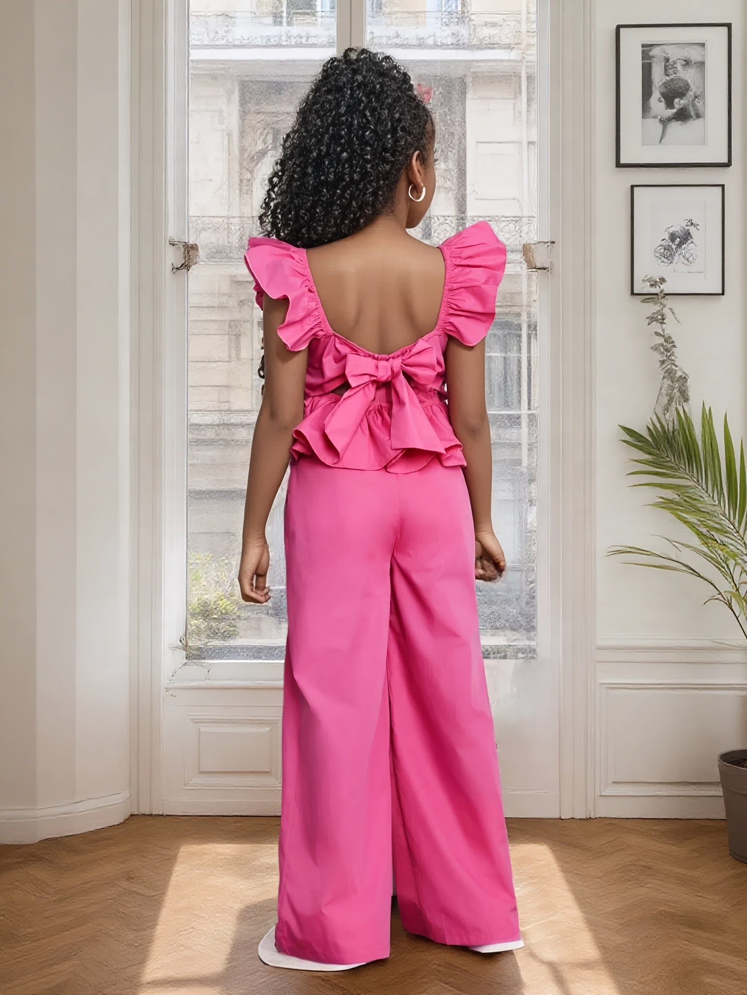 Elegant Everyday Pink Woven Solid Color Cap Sleeve Shirt And Long Pants Set with Pocket for Tween Girls