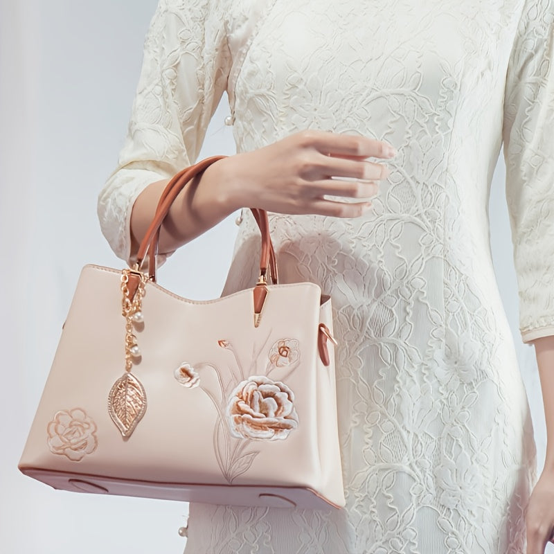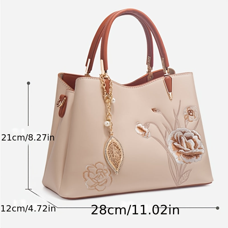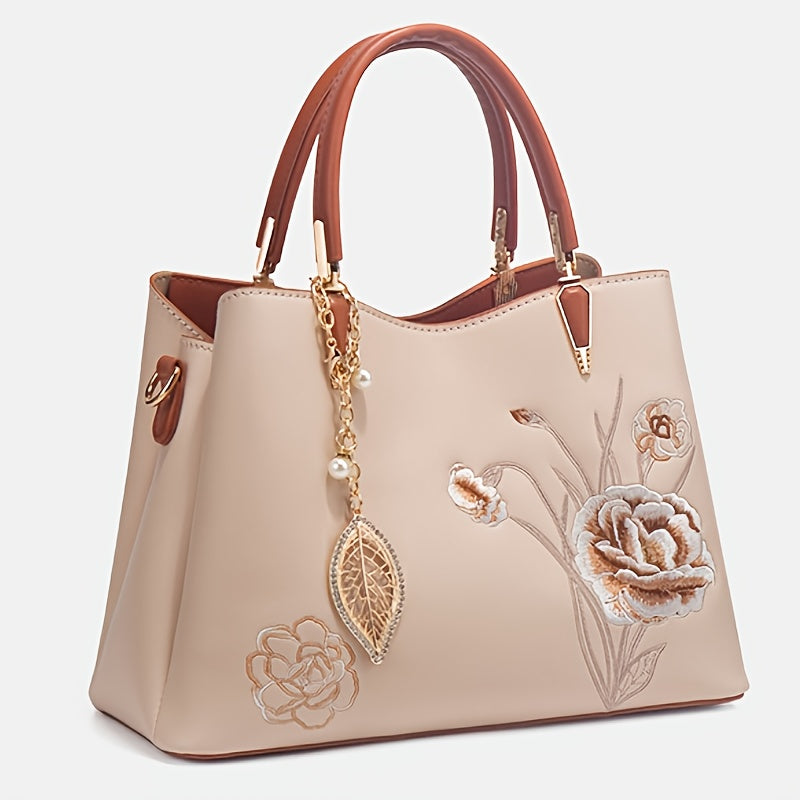 Elegant Floral Embroidered Synthetic Crossbody Bag for Women & Mothers - Large Capacity, Adjustable Strap, Zipper Closure, Beige with Golden-Tone Hardware, Perfect for Everyday Use or Special Occasions, Cute Purse, Everyday Handbag, Sophisticated Accessor