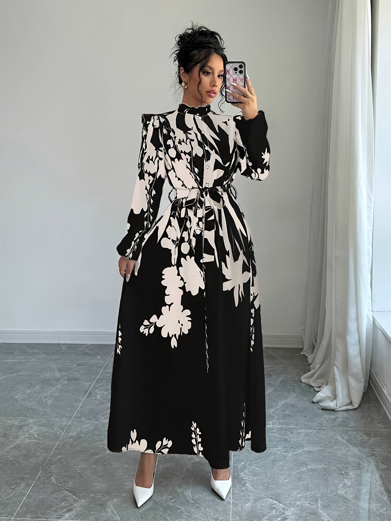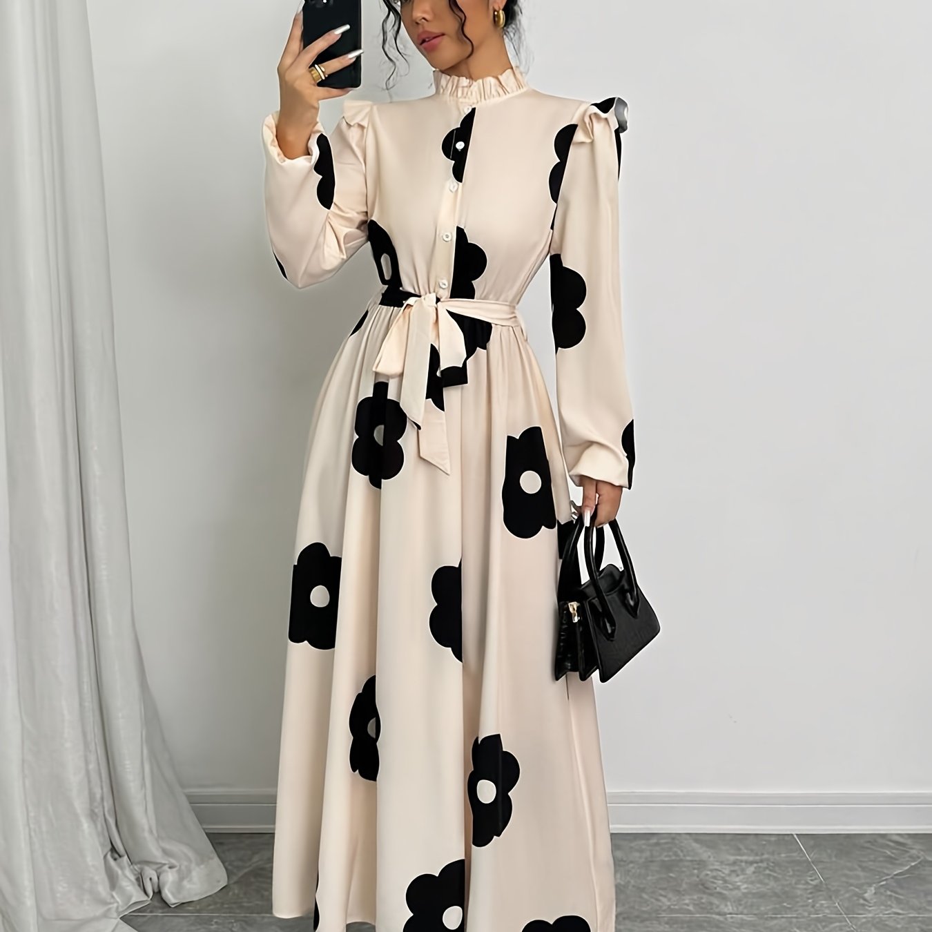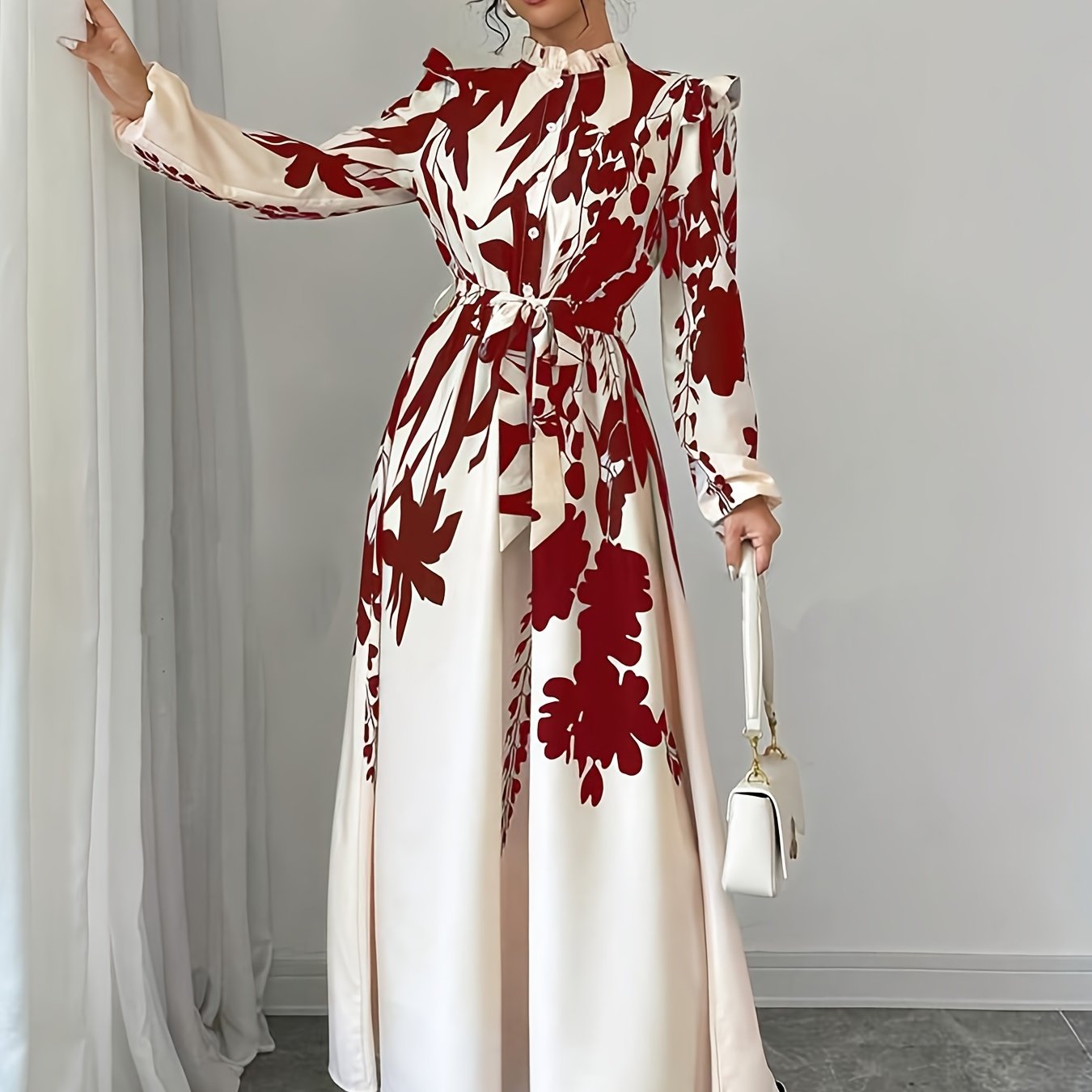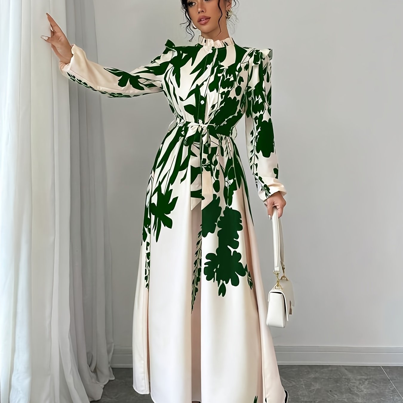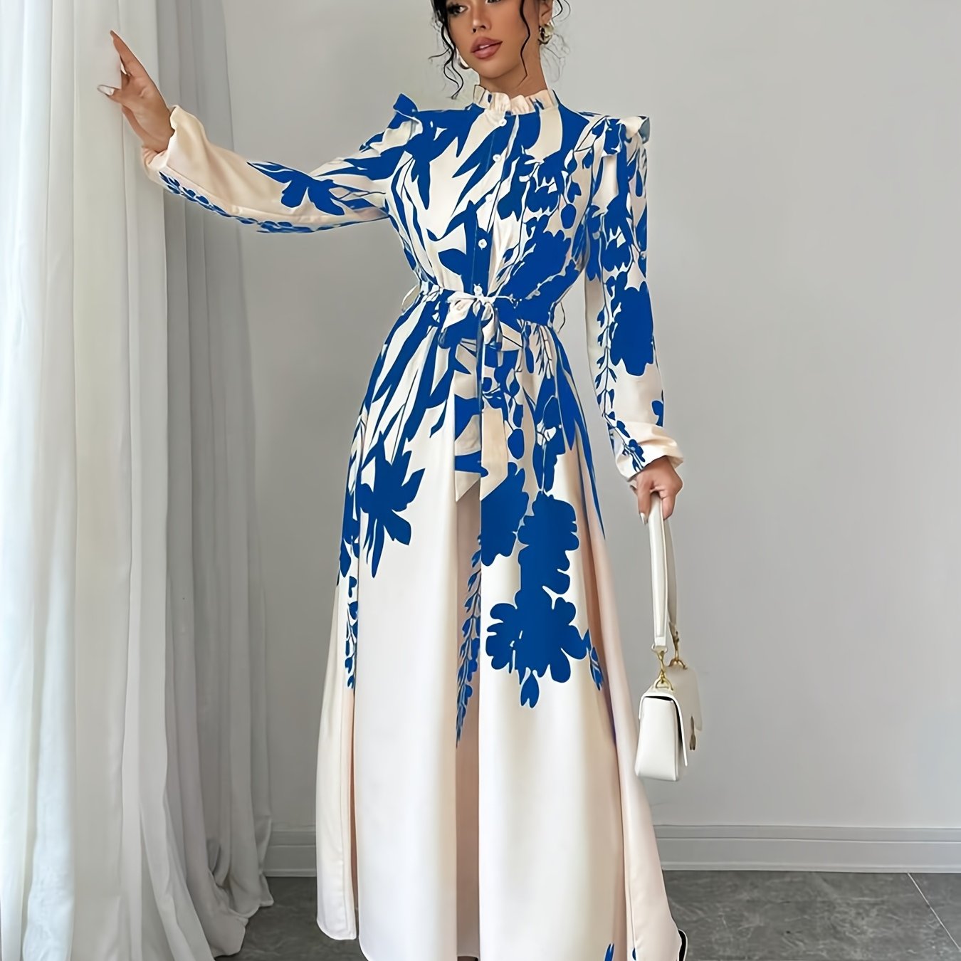Elegant Floral Print Long Sleeve Dress with Stand Collar and Waist Detail, Polyester A-Line Maxi Dress, with Lantern Sleeves and Ruffle Hem, for Spring/Fall