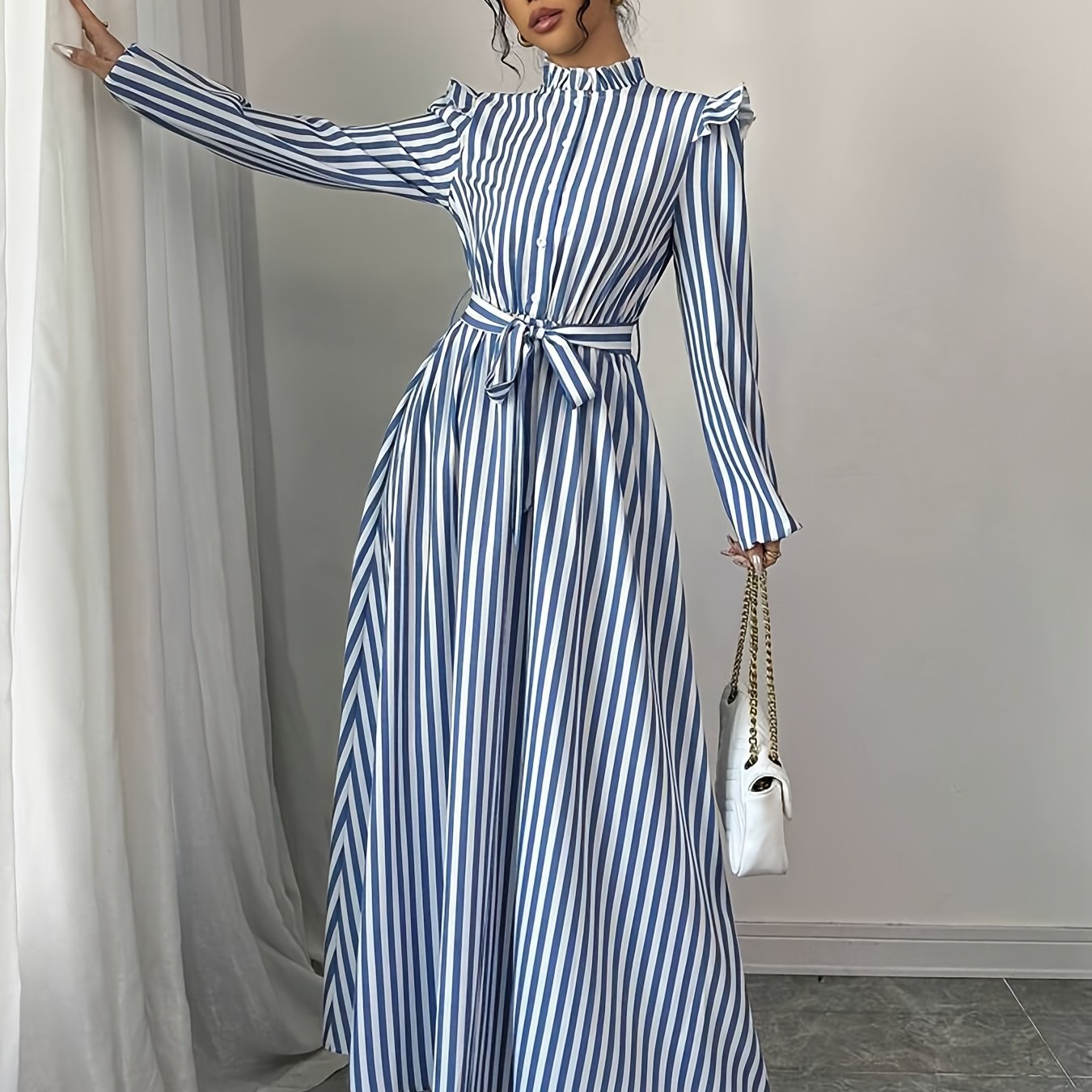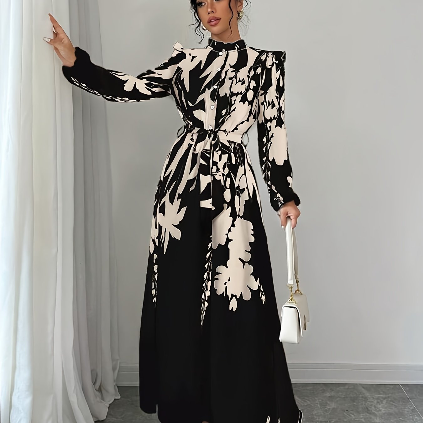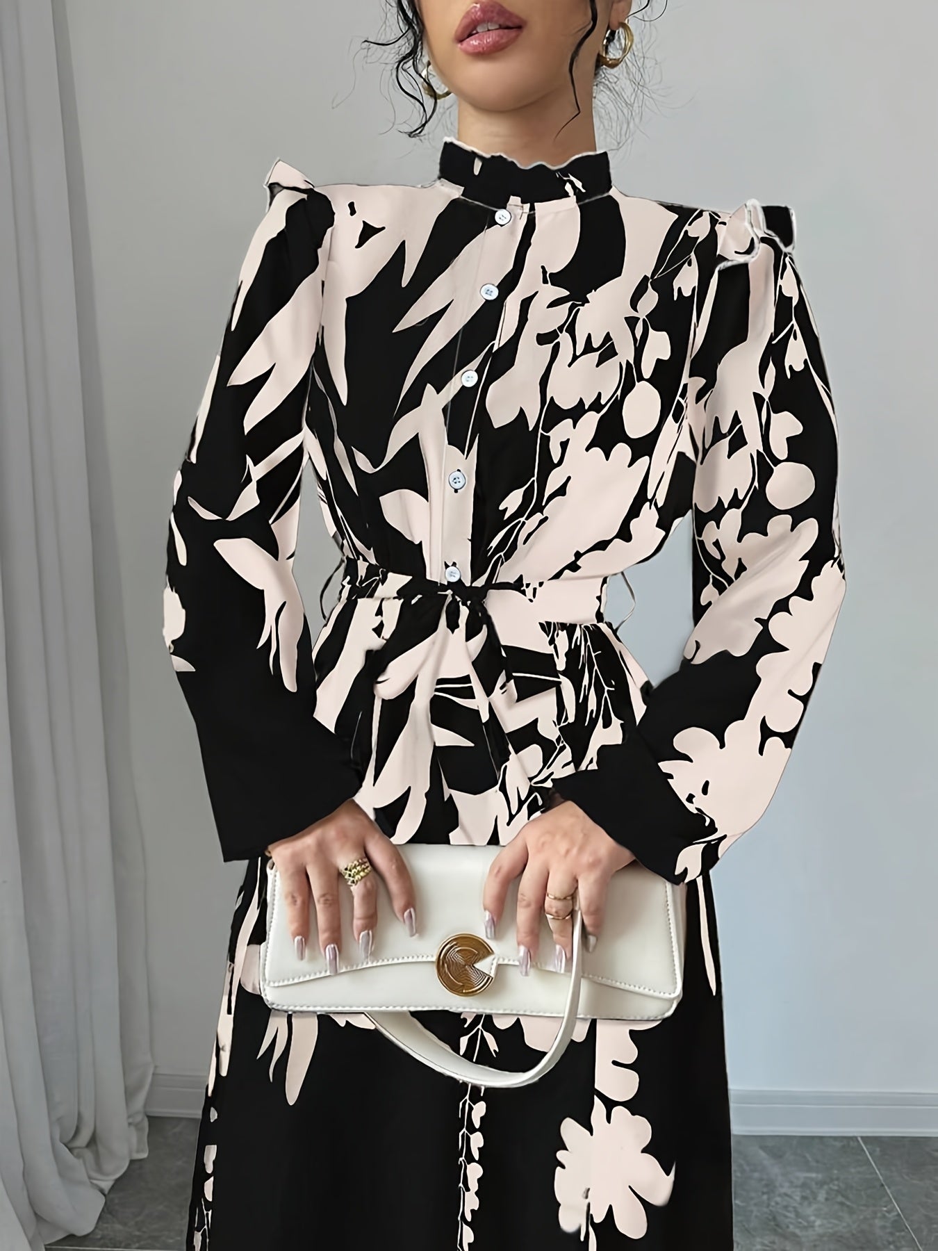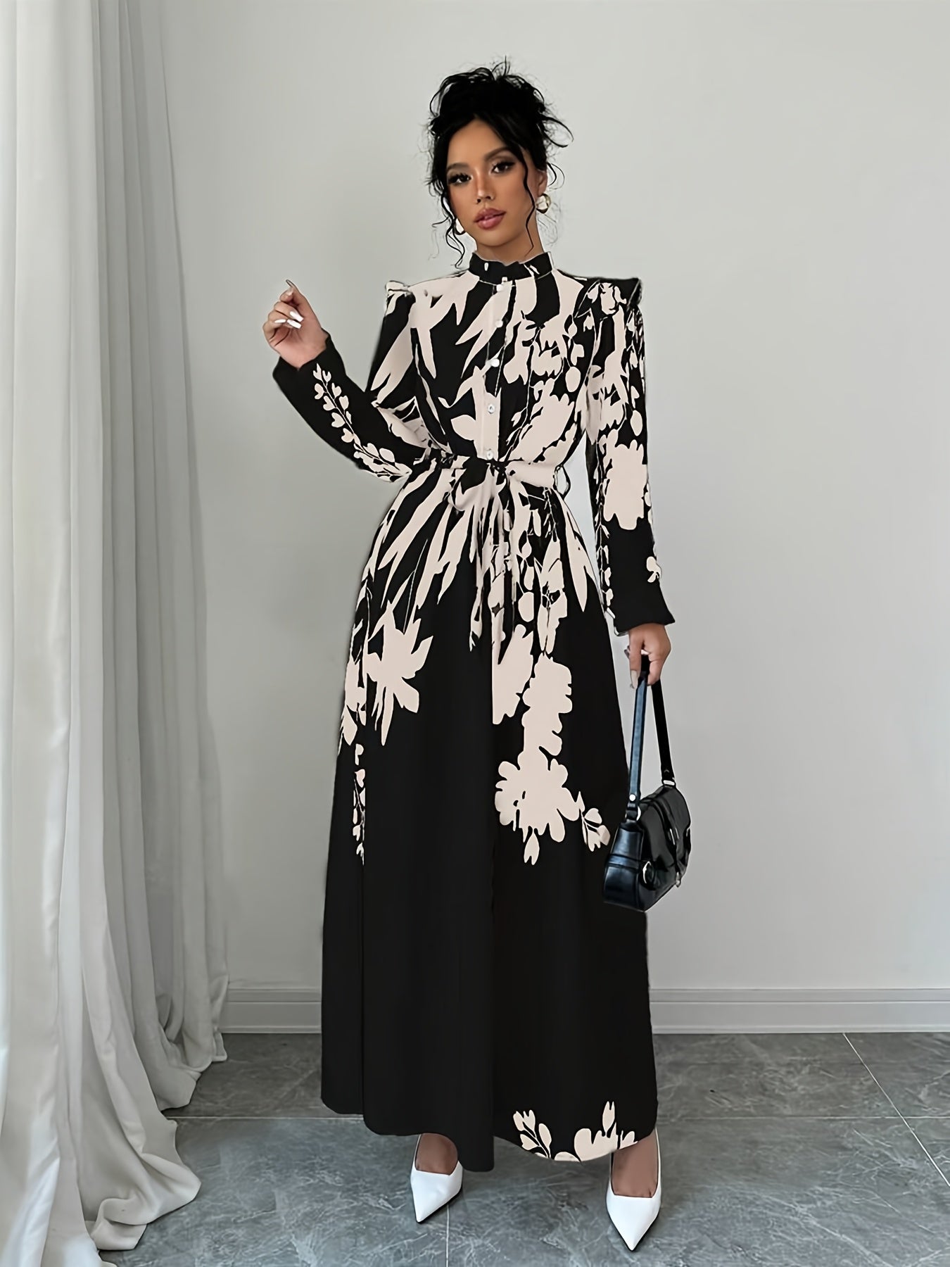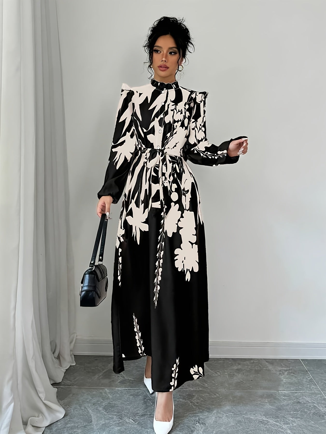 Elegant Floral Print Long Sleeve Dress with Stand Collar and Waist Detail, Polyester A-Line Maxi Dress, with Lantern Sleeves and Ruffle Hem, for Spring/Fall