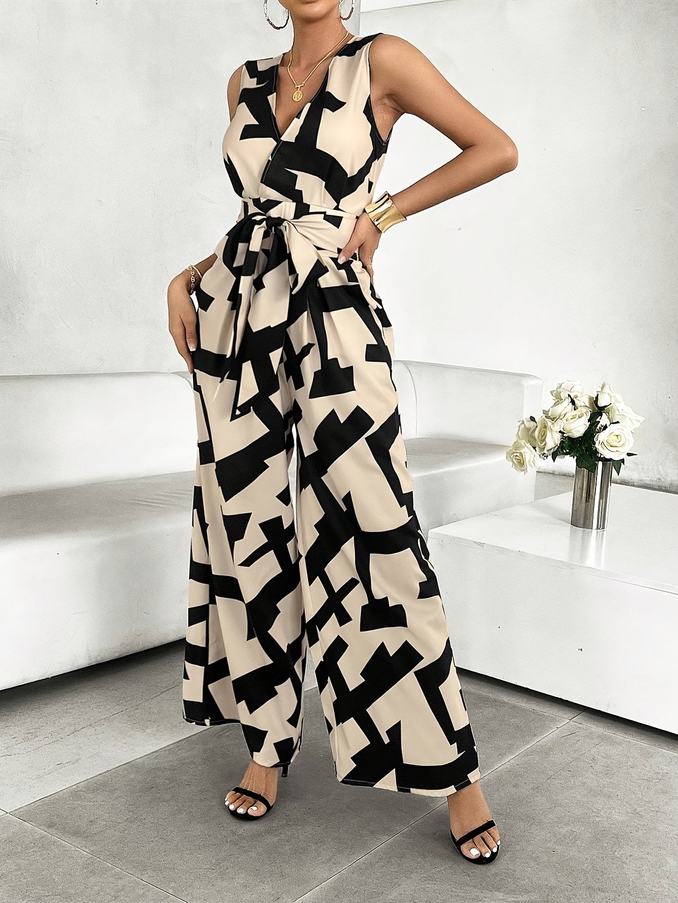 Elegant Geometric Print V-Neck Jumpsuit for Women, Polyester 100%, Sleeveless Wide Leg Unitard with Belt, Regular Fit, for Spring/Summer/Fall - Going Out