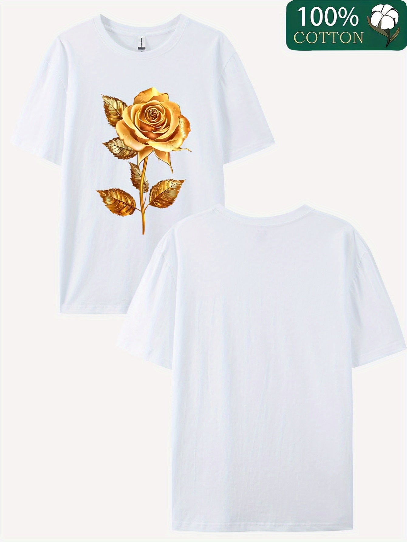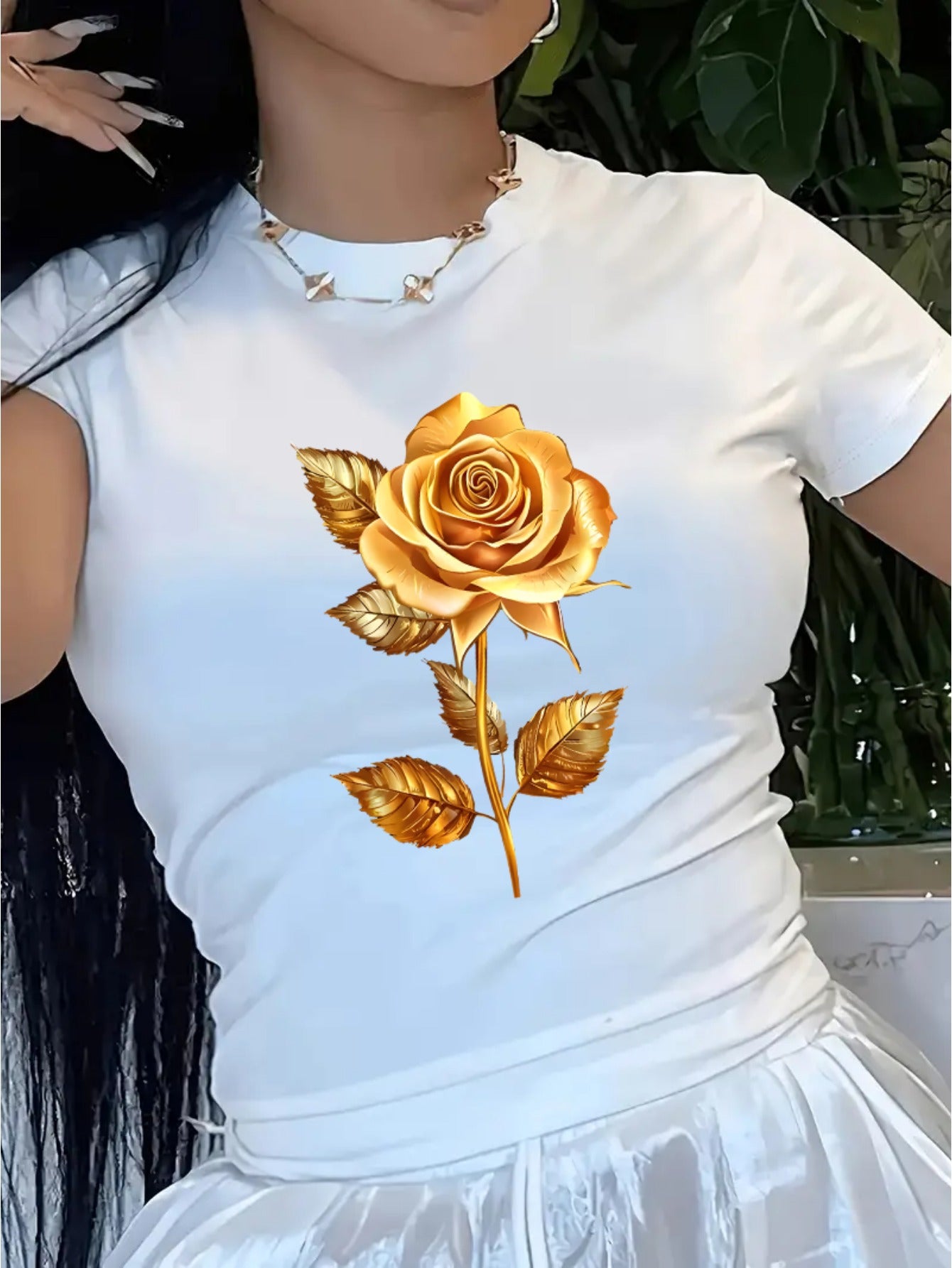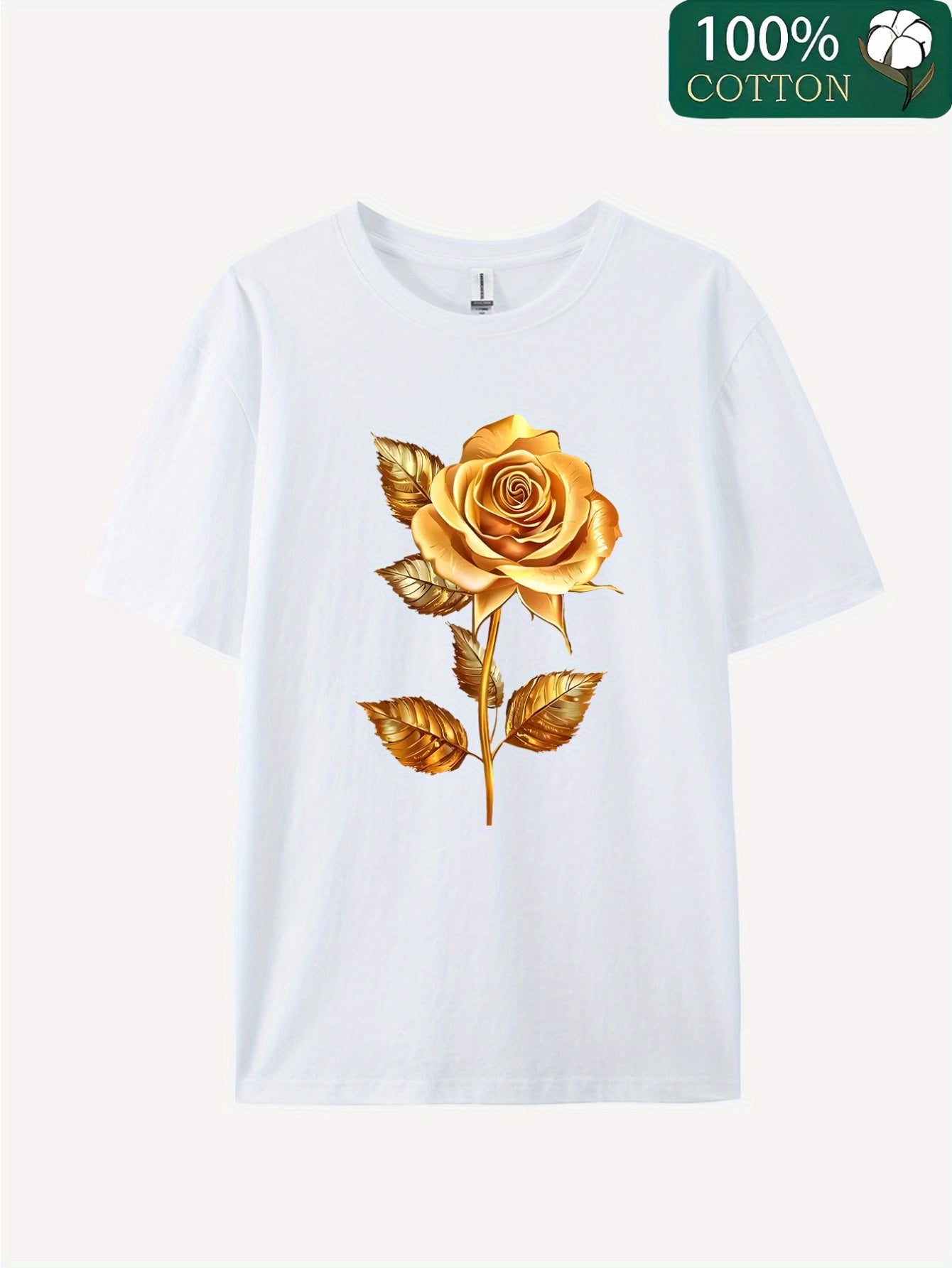 Elegant Golden Rose Print T-Shirt for Women, 100% Knit Fabric, Sleeveless Floral Pattern, Soft Comfortable Short Sleeve Design, Machine Washable, with Stretch Fit for All Seasons, Casual Wear | Elegant Design