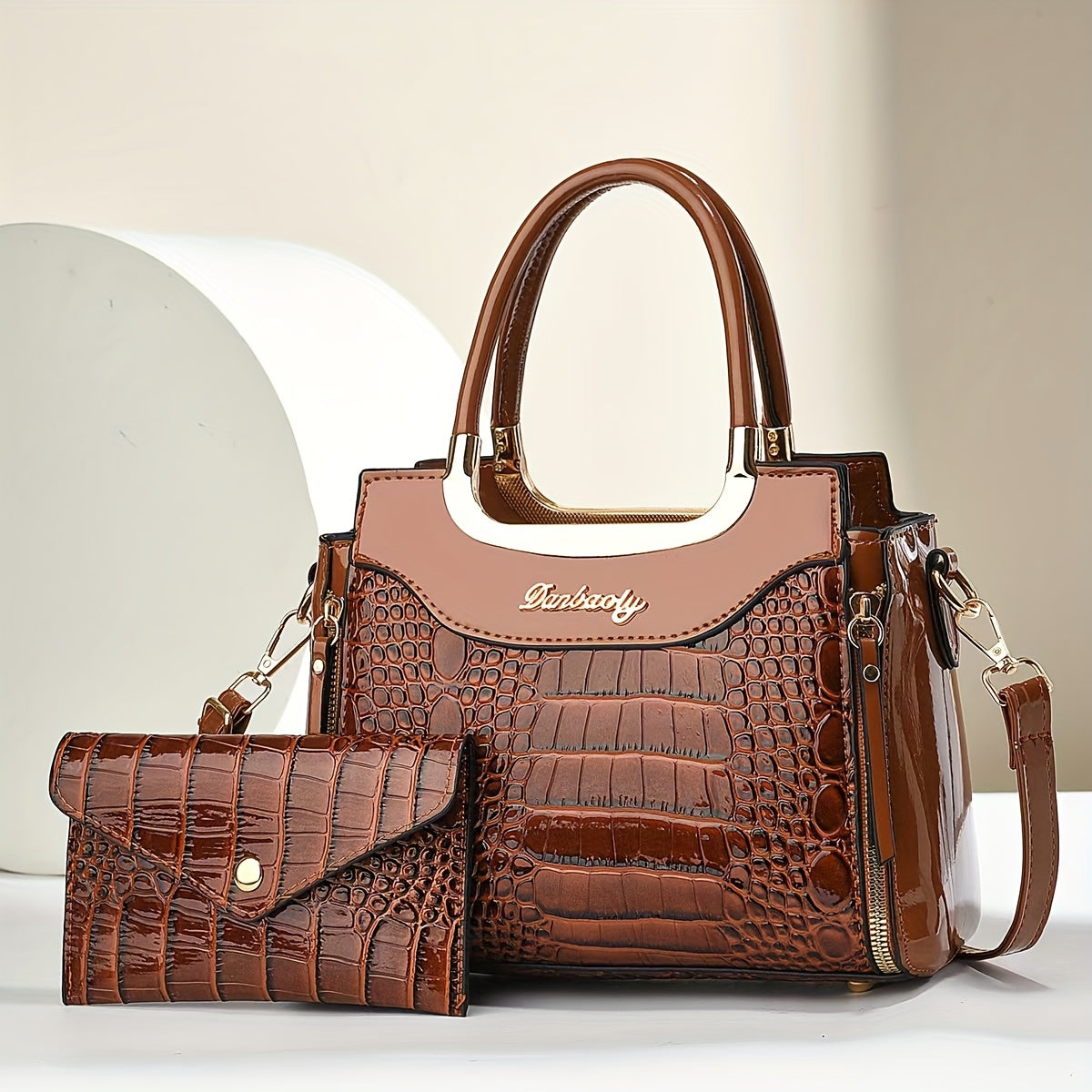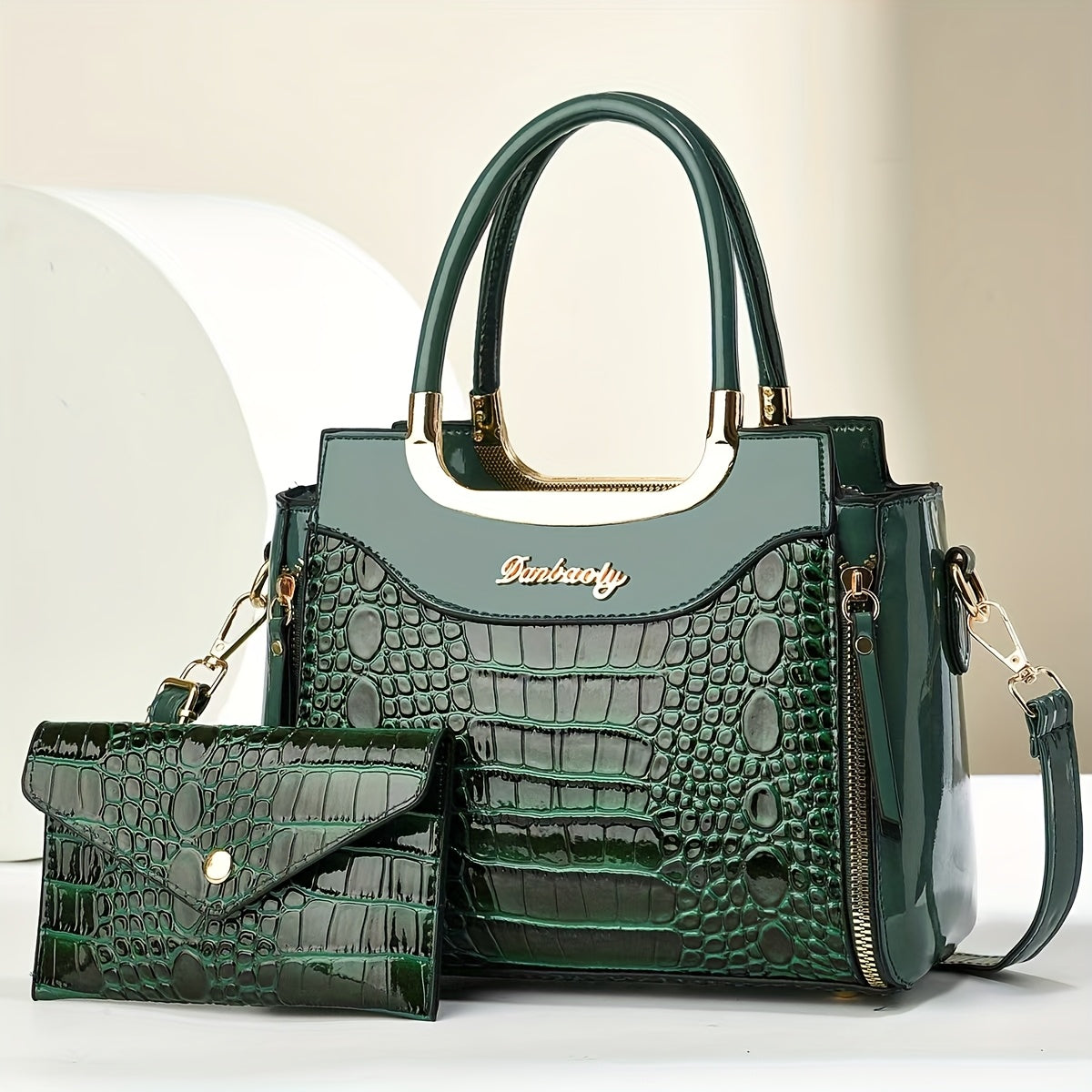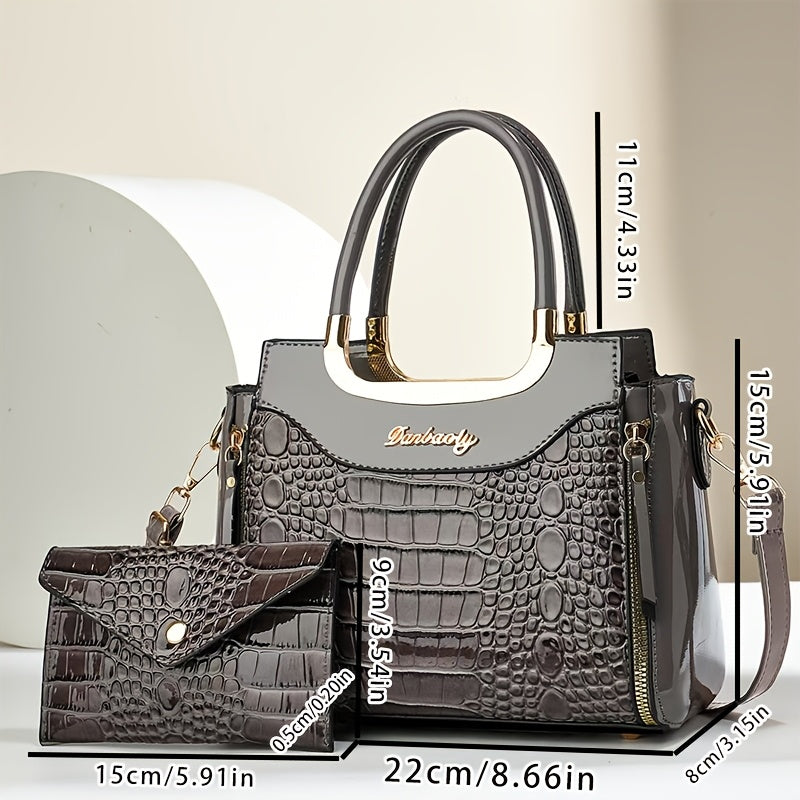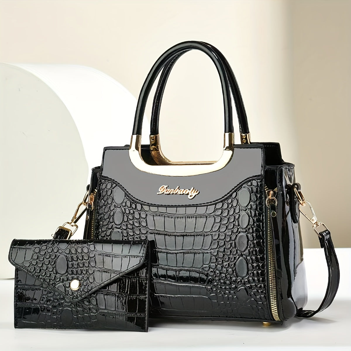 Elegant Handbag Set for Women, Crocodile Pattern, Black Patent Shoulder Bag with Removable Strap, Zipper Closure, Polyester Lined, Includes Matching Wallet, Ideal for Mother'S Day & Easter