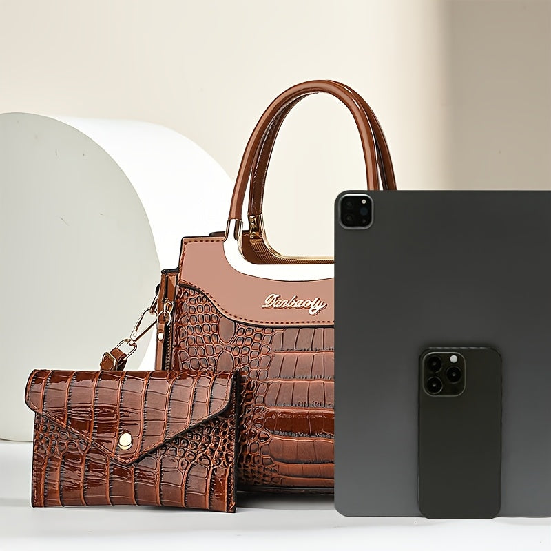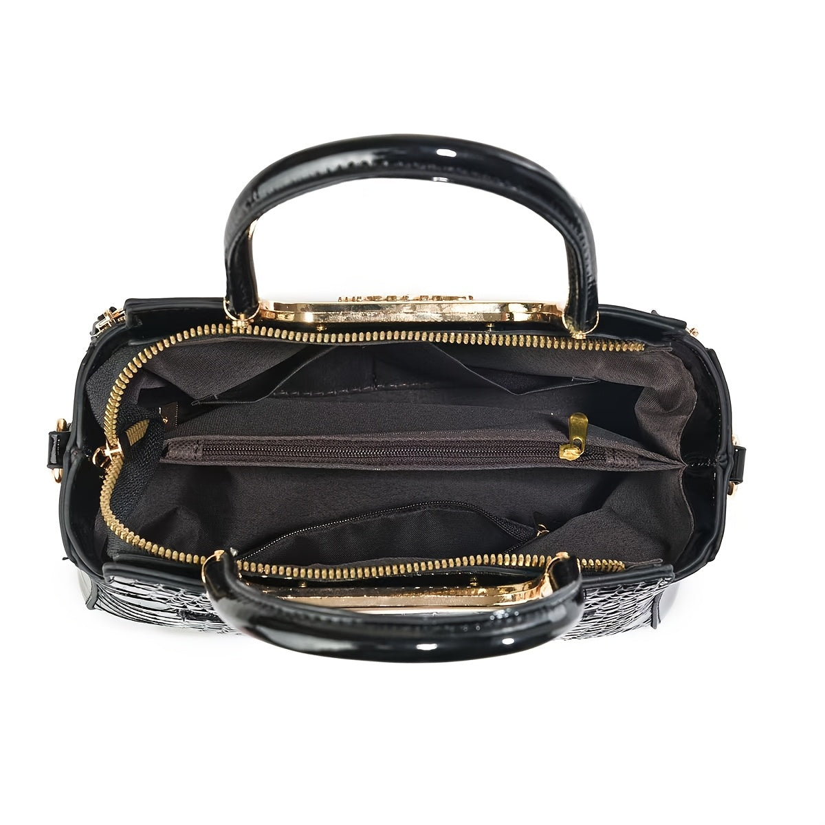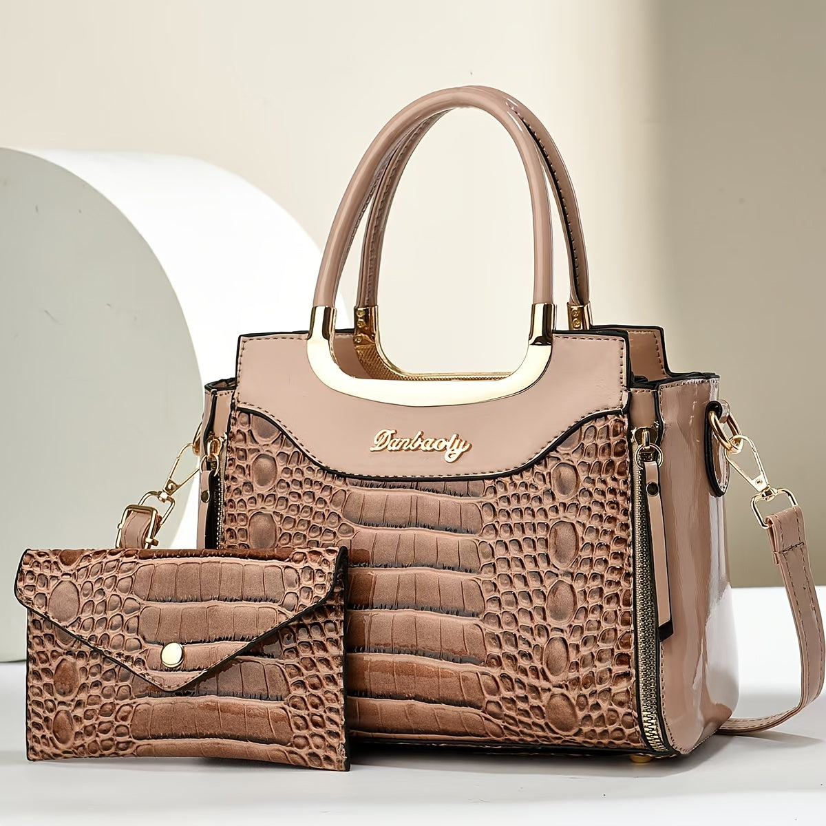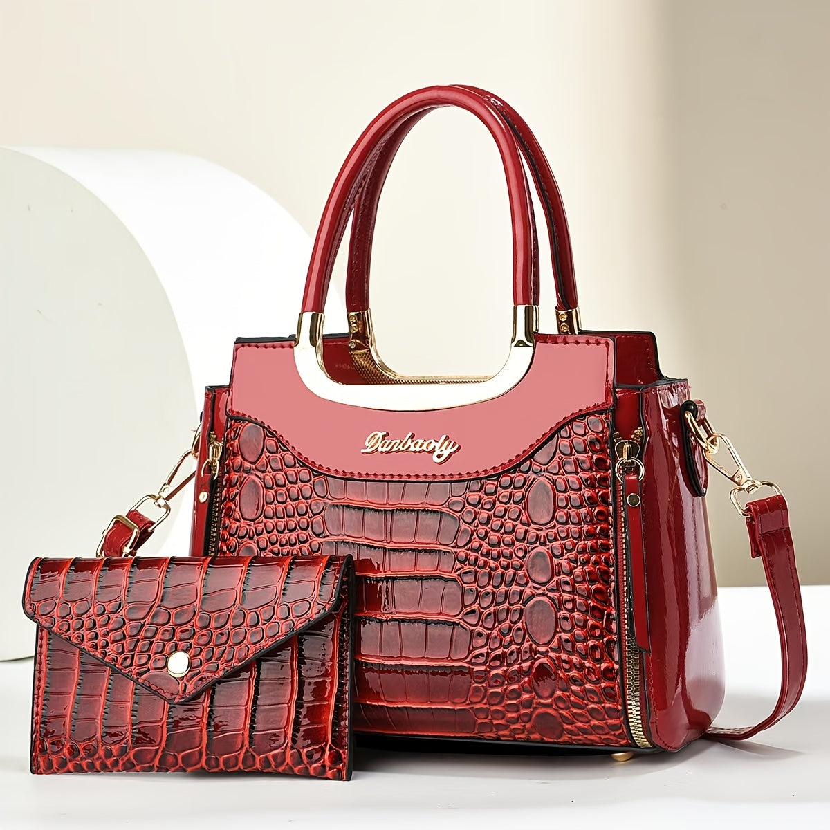 Elegant Handbag Set for Women, Crocodile Pattern, Black Patent Shoulder Bag with Removable Strap, Zipper Closure, Polyester Lined, Includes Matching Wallet, Ideal for Mother'S Day & Easter