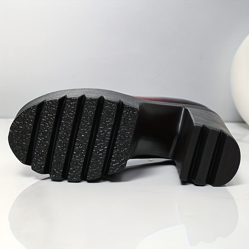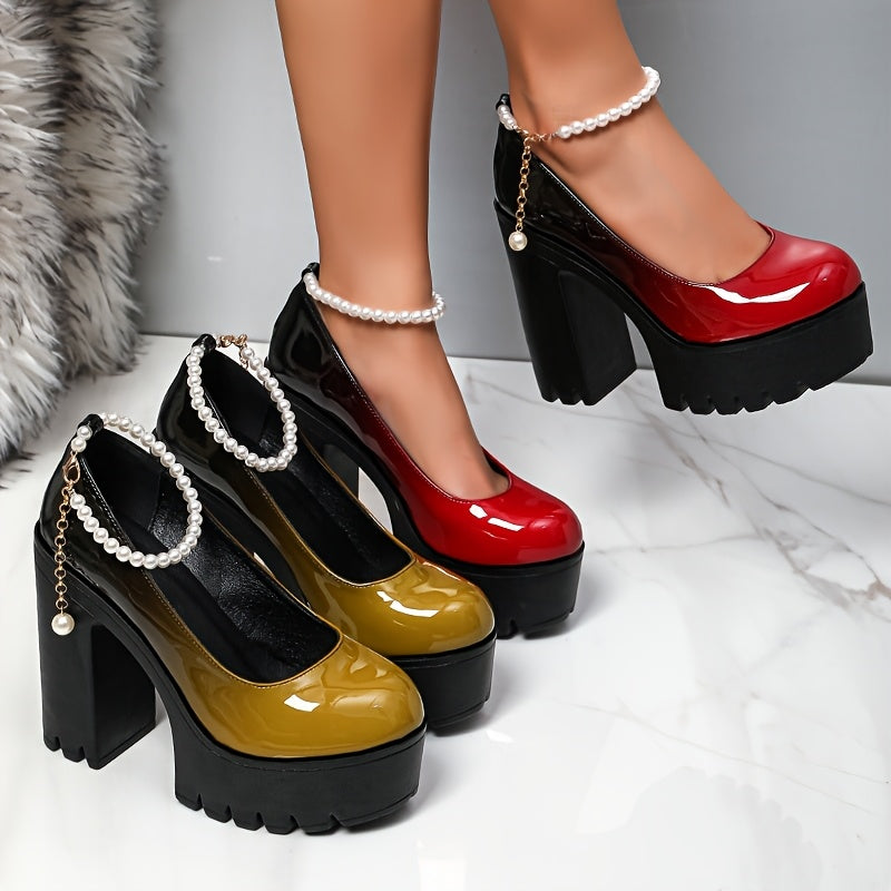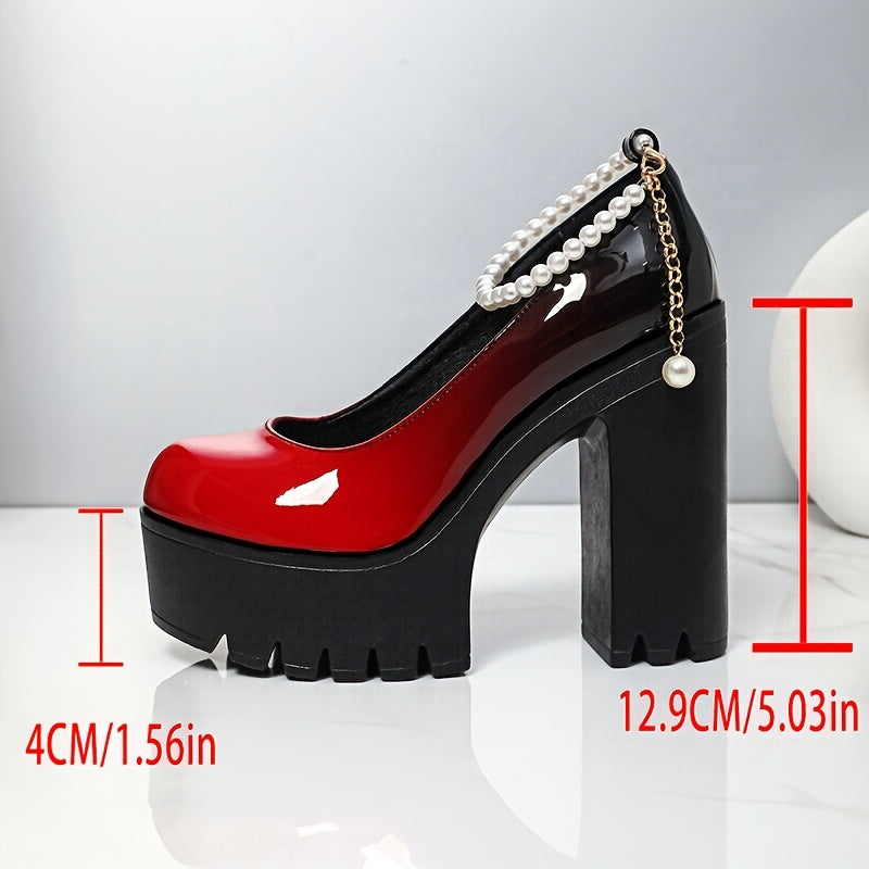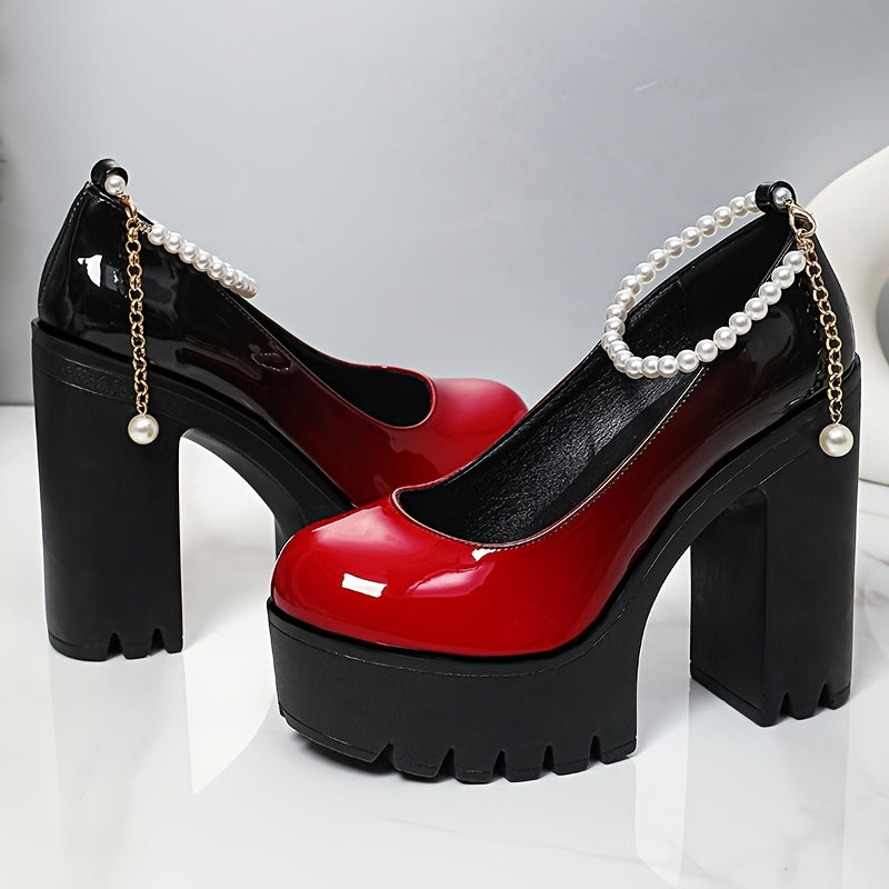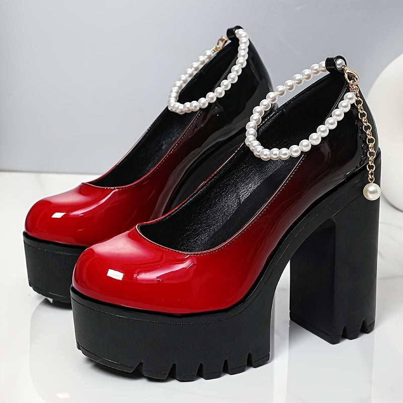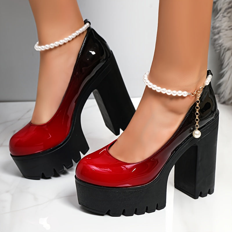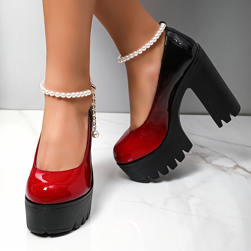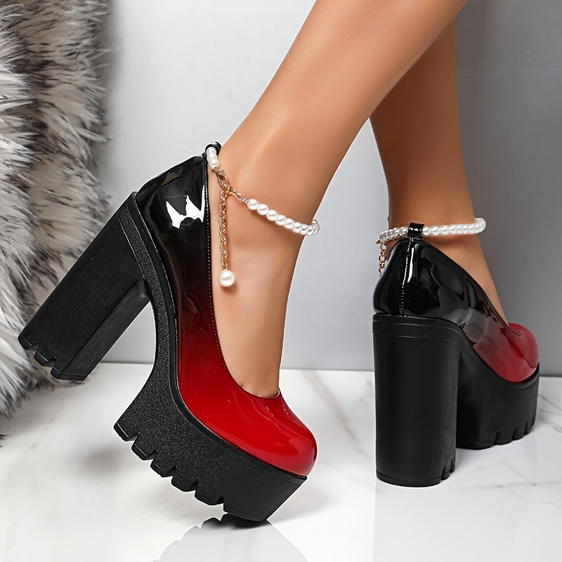 [Elegant Heel, Fashion Footwear] Elegant Women's Black and Red High Heels with Chain Ankle Strap - Round Toe, Thick Sole, Versatile All-Season Comfortable Fashion Footwear