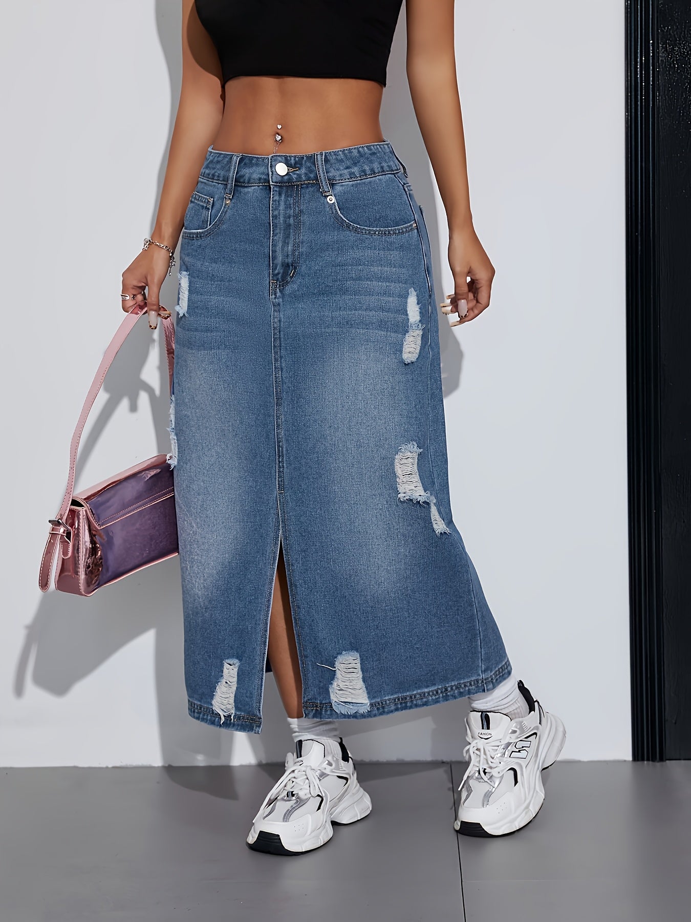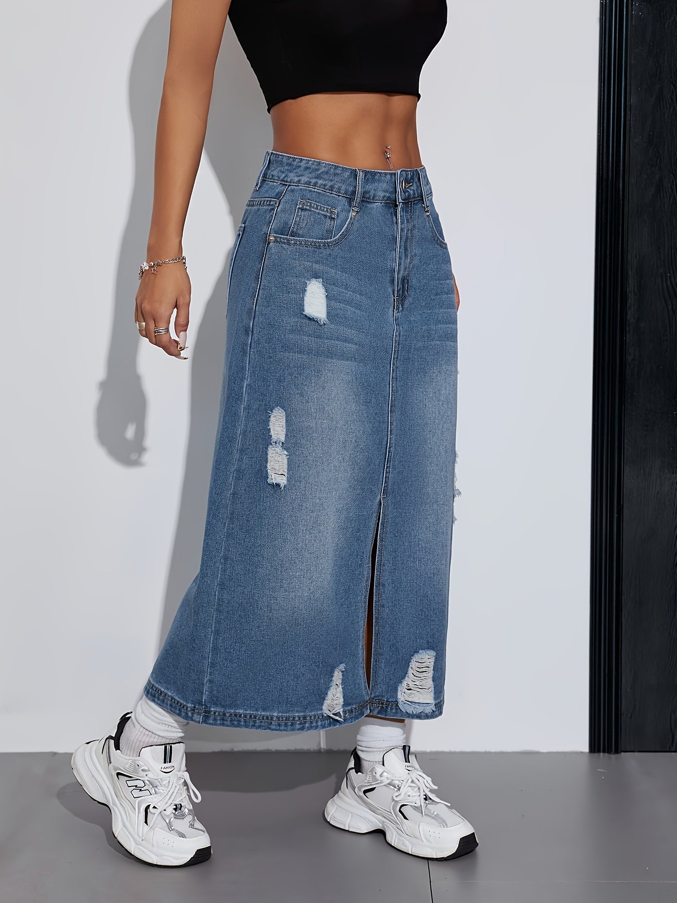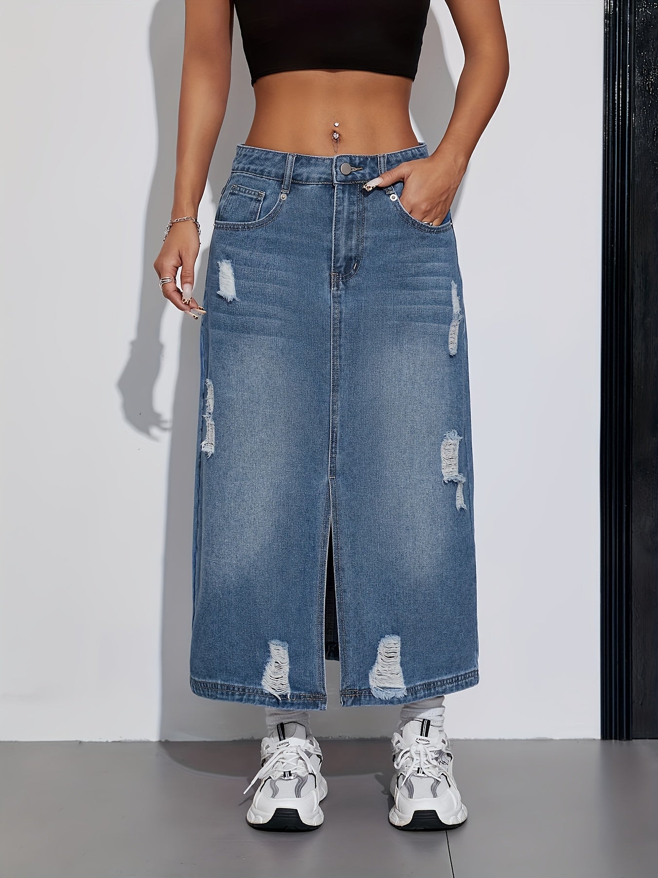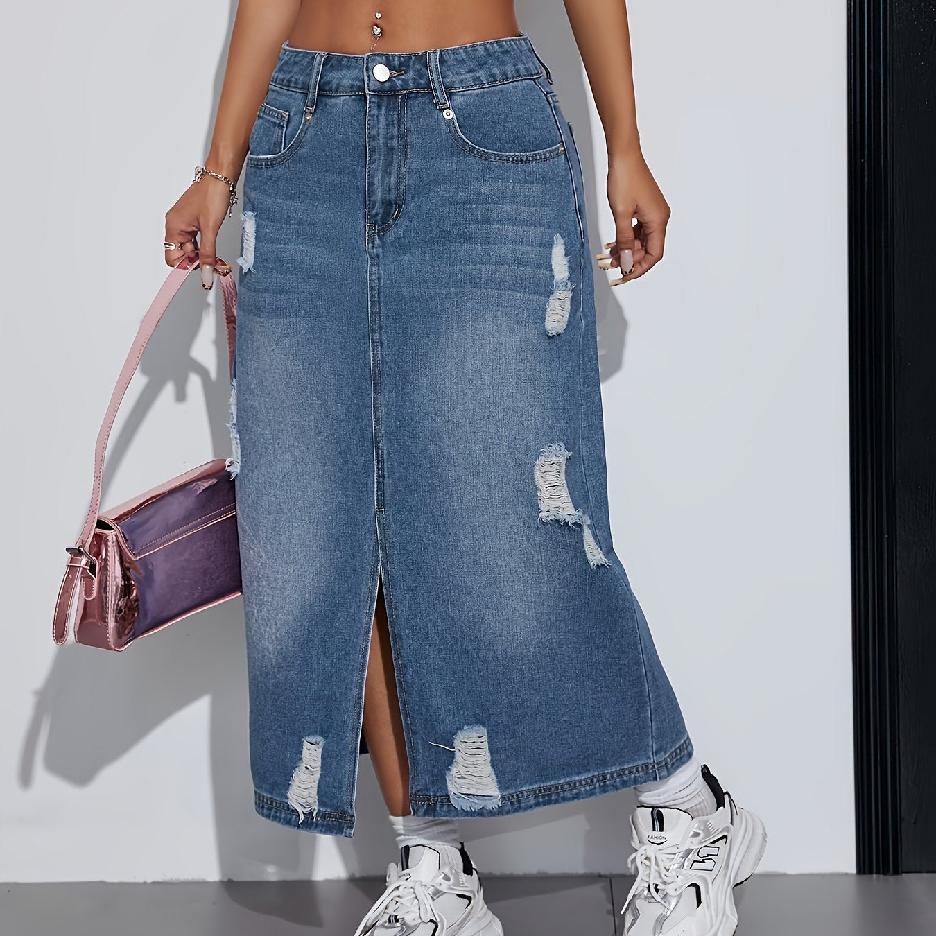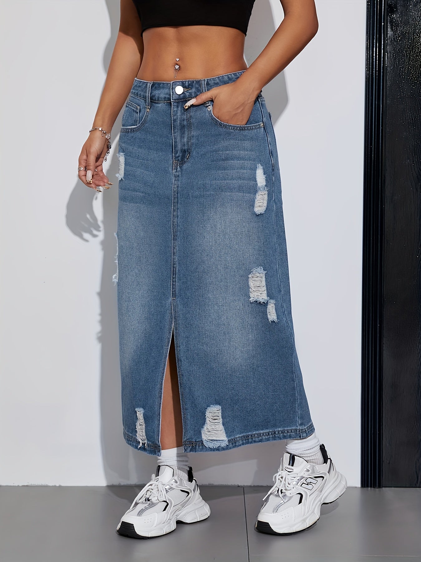 Elegant High-Waist Blue Denim Midi Skirt with Chic Ripped Detail - A-Line, Slimming Slit Design, Rayon & Polyester Blend, Machine Washable for Women, Denim Skirt