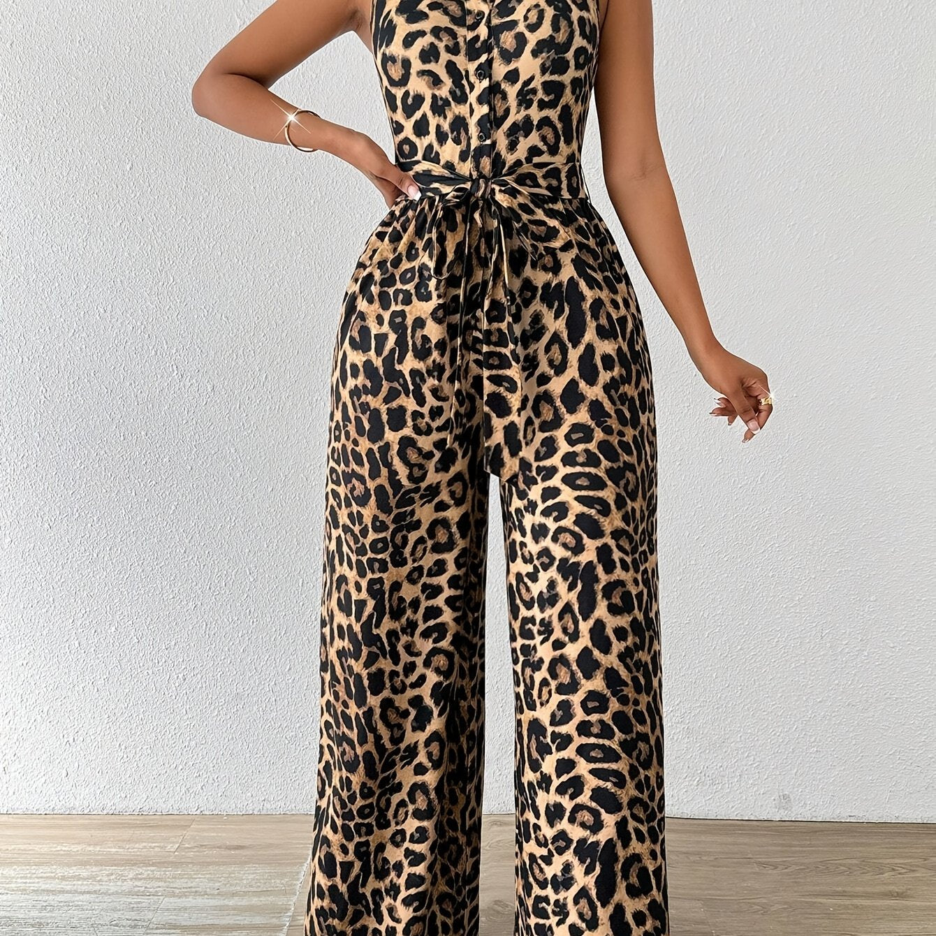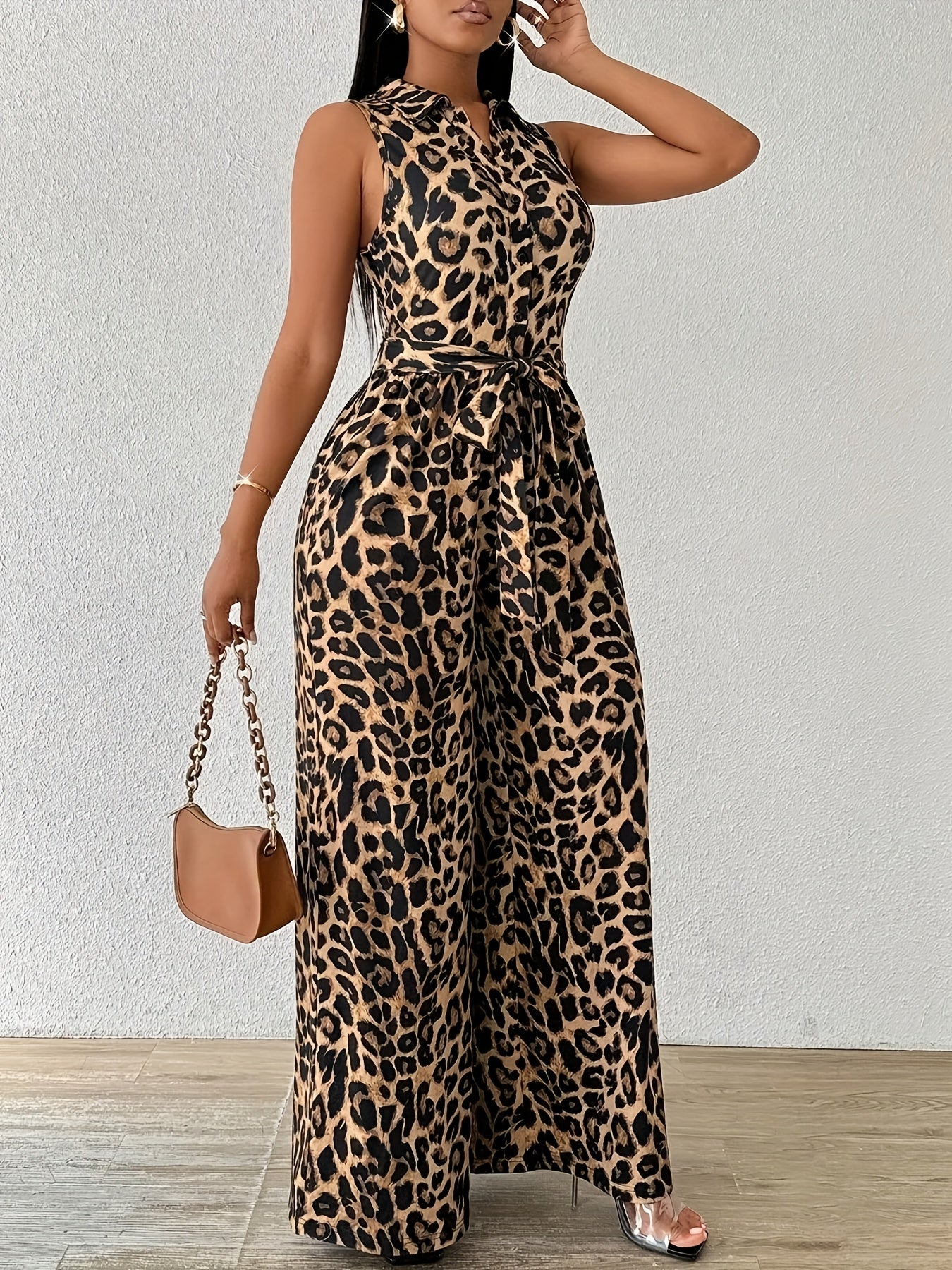 [Elegant Leopard Print Shirt Dress] Women'S Elegant Leopard Print Sleeveless Shirt Dress with Wide Leg Pants, Polyester 95% Elastane 5%, Lapel Collar, Belt Detail, Woven Fabric, Spring/Summer Collection