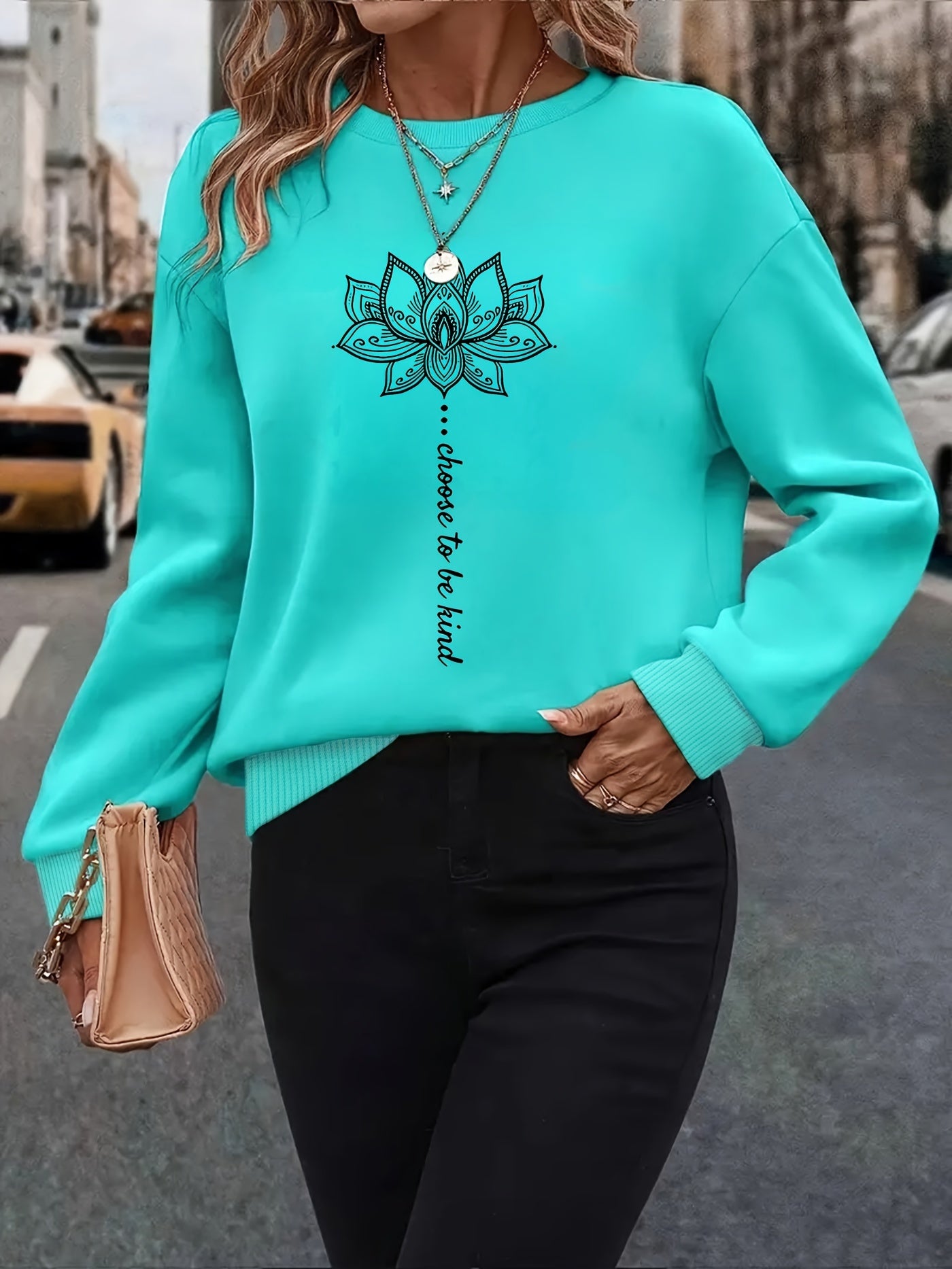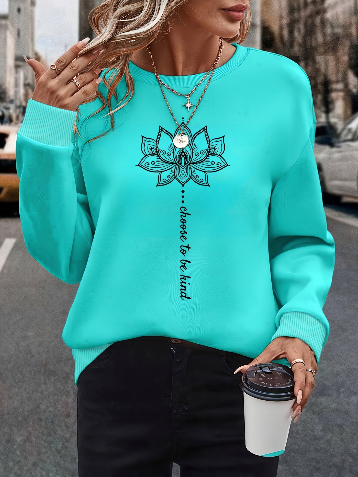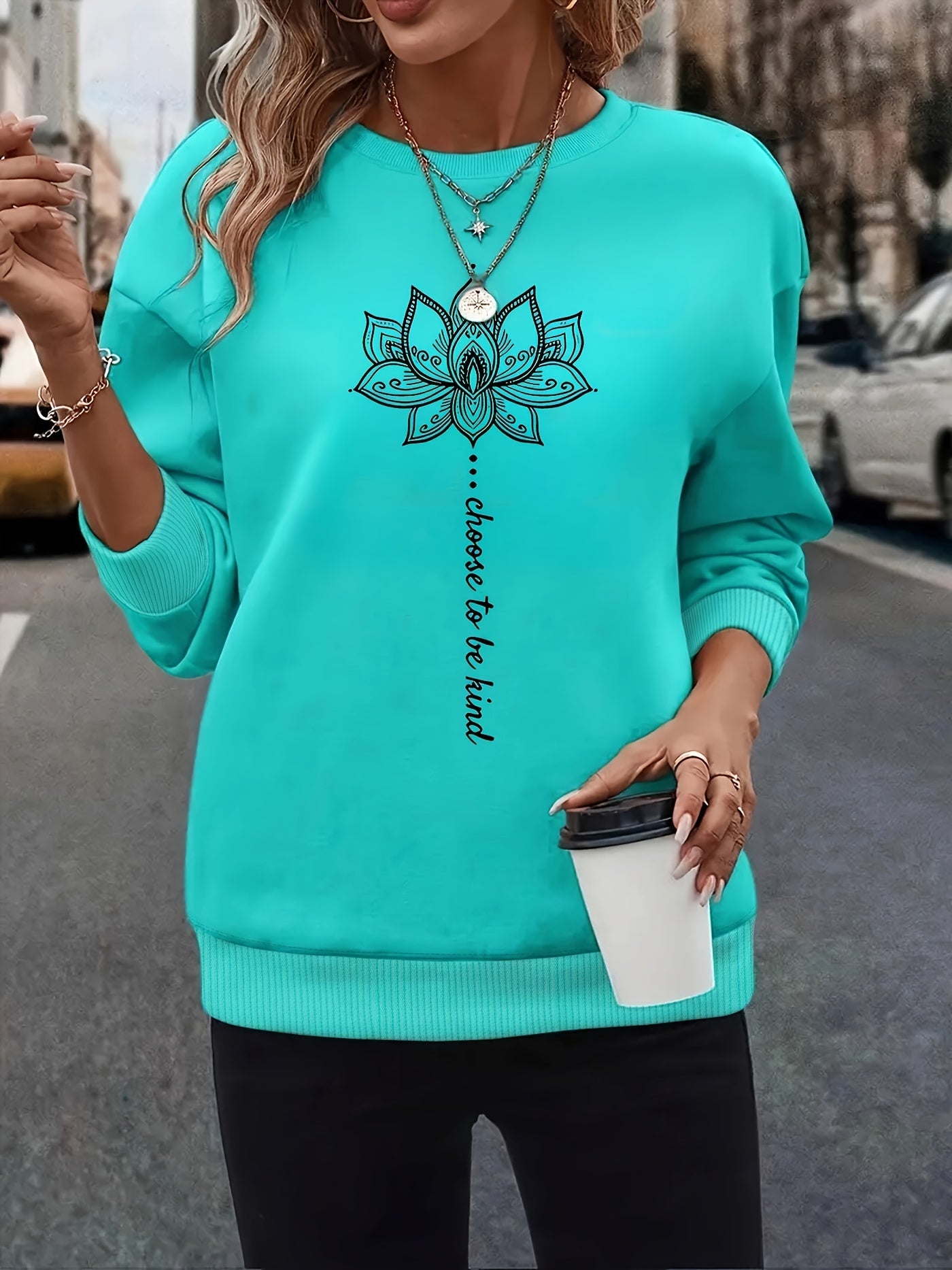 [Elegant Letter Print Polyester Sweatshirt] Elegant for Lotus & Letter Print Long Sleeve Crew Neck Sweatshirt for Women - Polyester, Machine Washable