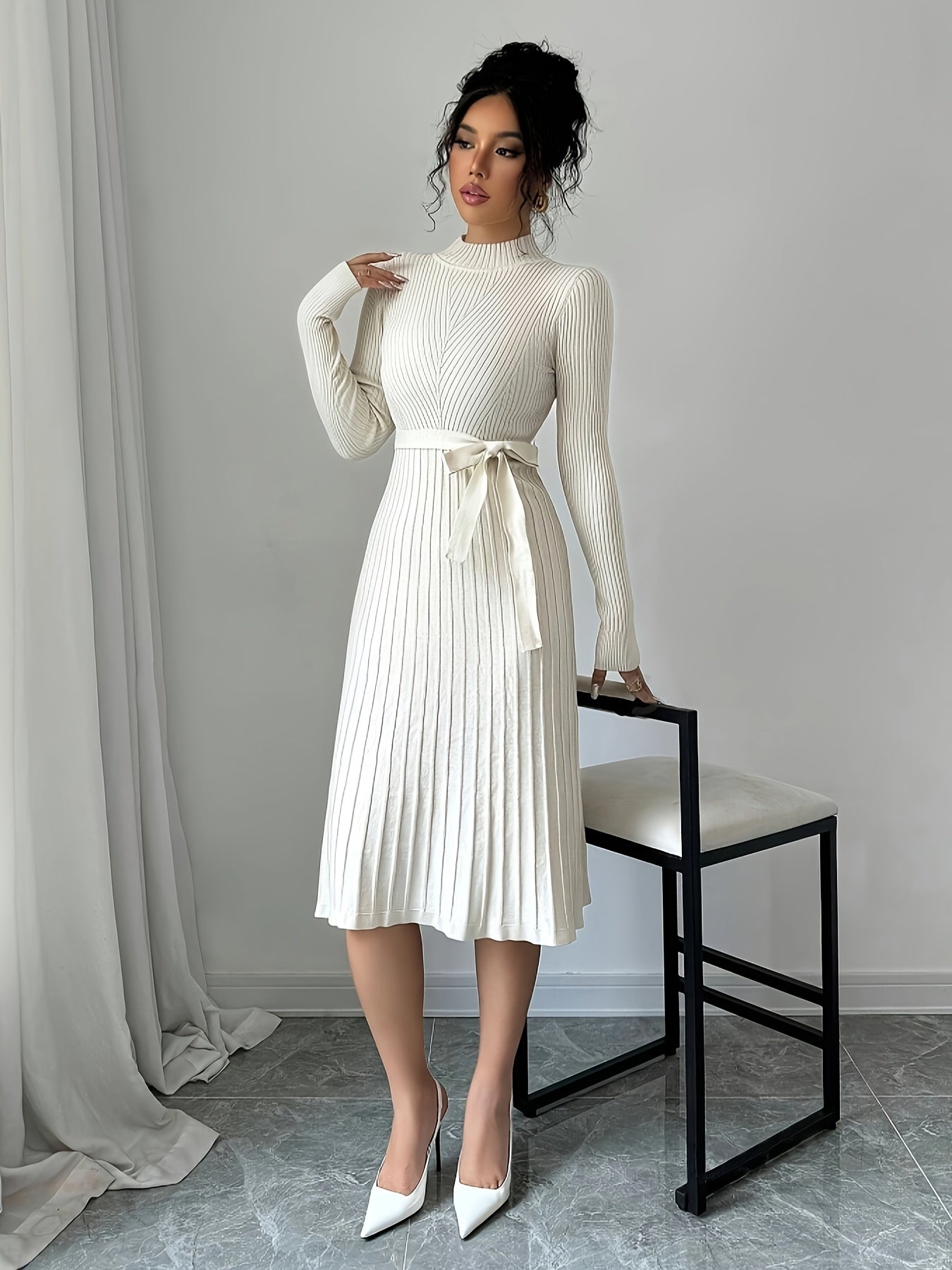 Elegant Long Sleeve Midi Dress for Women - Ribbed Polyester with Belt Detail, Round Neck, A-Line Silhouette, Perfect for Fall/Winter
