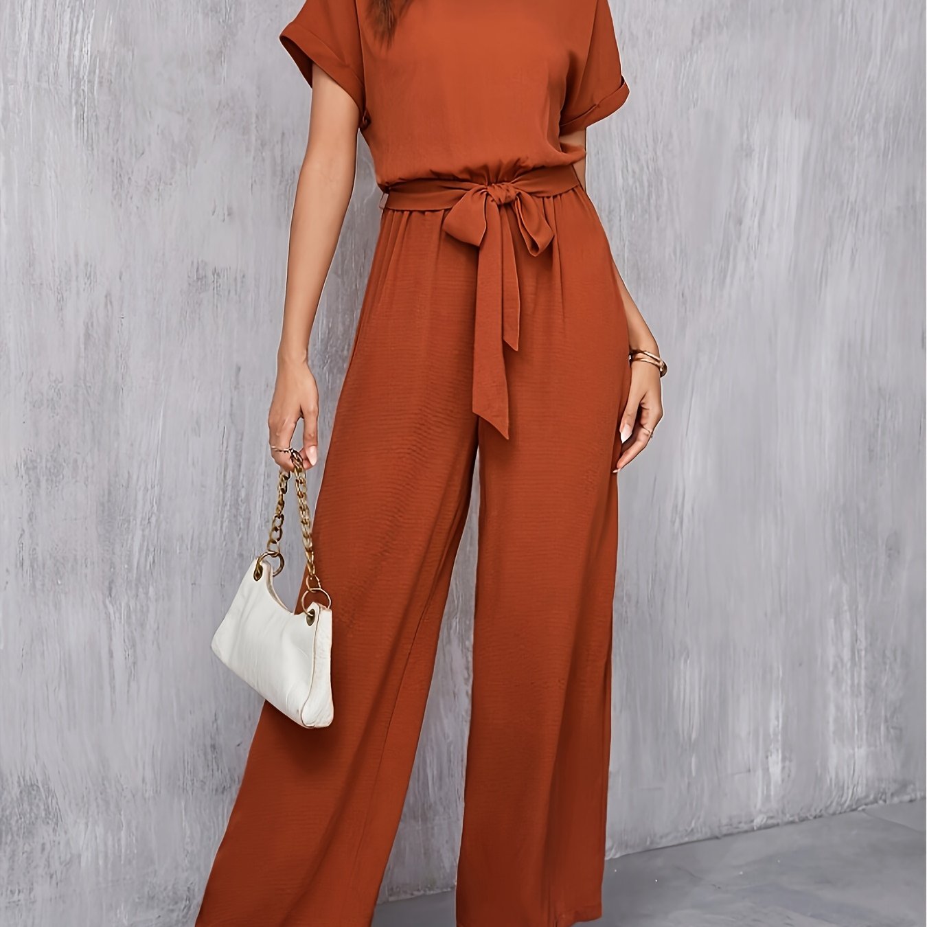 [Elegant Navy Jumpsuit] Navy Blue Elegant Women's Jumpsuit - Batwing Sleeves, Wide-Leg Pants & Belt - Casual Yet Chic Round Neck Design for Spring and Summer, Comfortable Daily Wear | Breezy Wideleg | Polyester Fabric