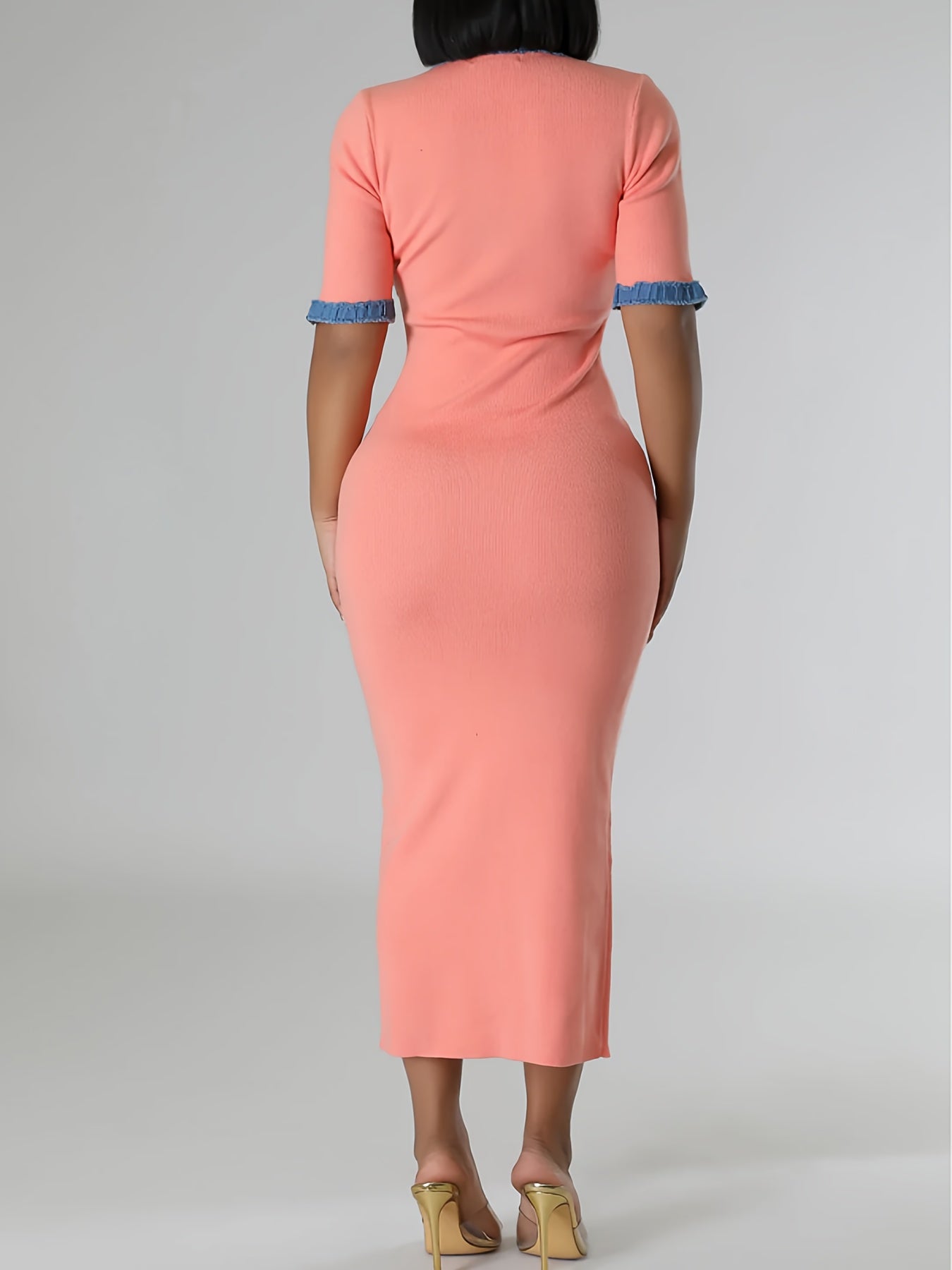 Elegant Patchwork Denim Collar Dress, Polyester Spandex Blend, Slight Stretch, All Season, Shirting Type, Knit Fabric, 180-300g/㎡, Women'S Clothing