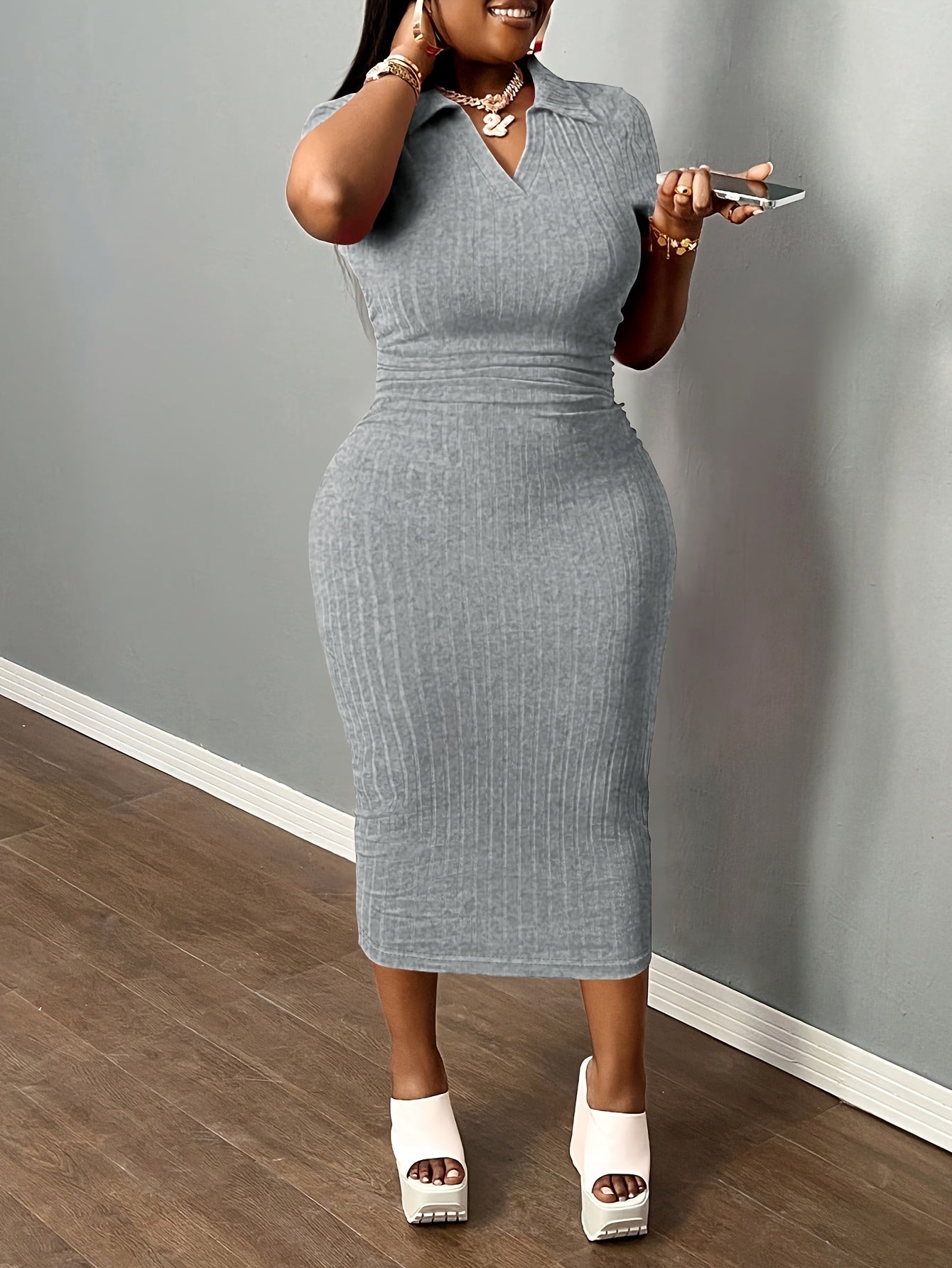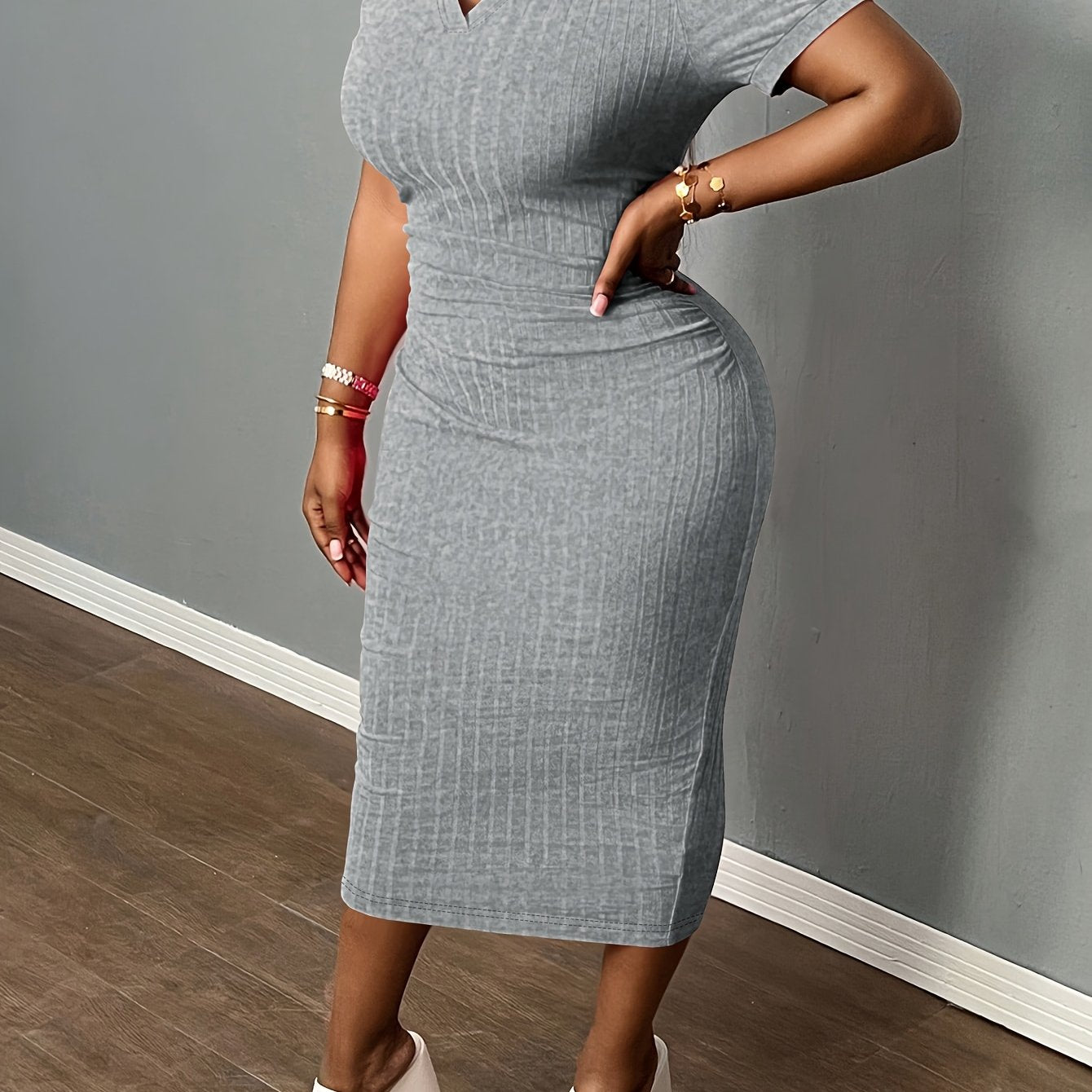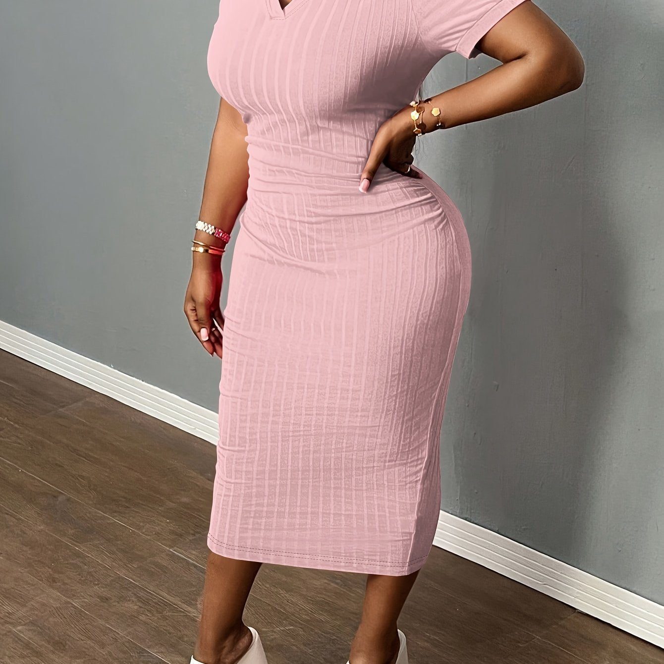 Elegant Pink Bodycon Midi Dress for Women - Chic Summer Pencil Skirt Style with Short Sleeves, Ribbed Texture & Neck, Stretchy Polyester Fabric, Perfect for Casual or Club Events