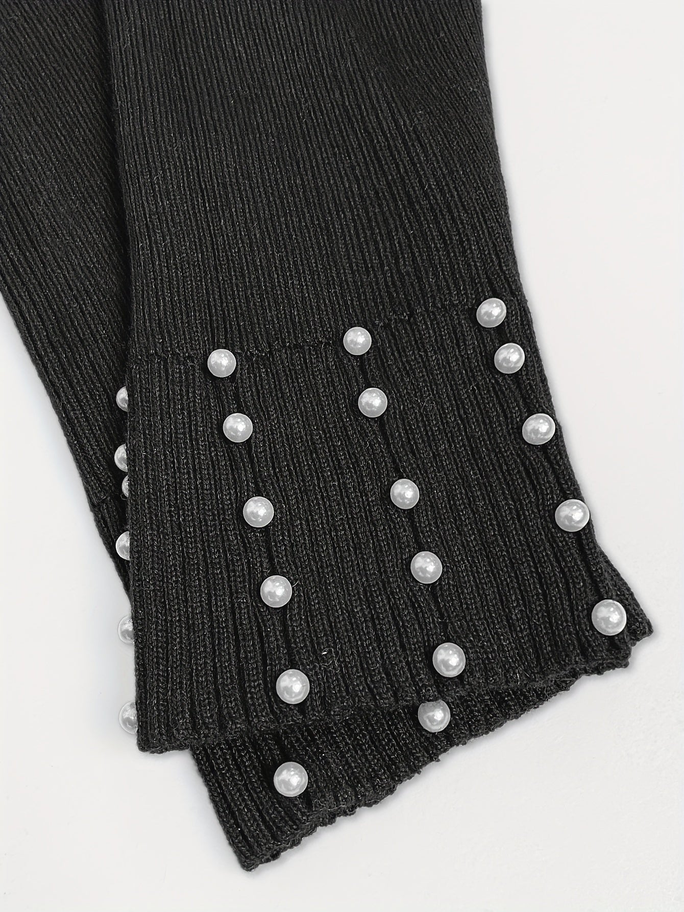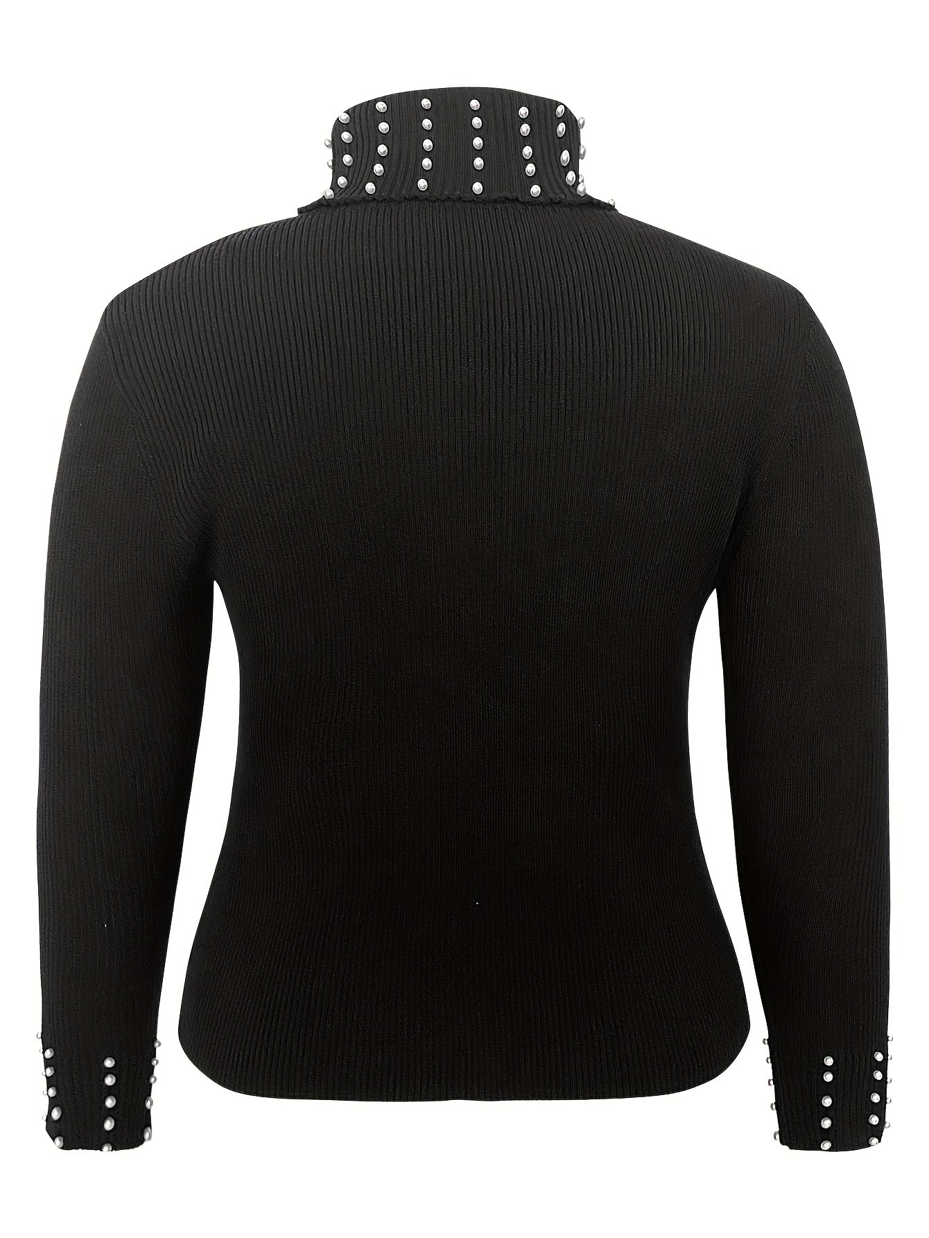 Elegant Plus-Size Black Sweater with Pearl Accents - High Neck, Long Sleeve, Stretchy Polyester Pullover for Women - Machine Washable, Plus Size Sweaters