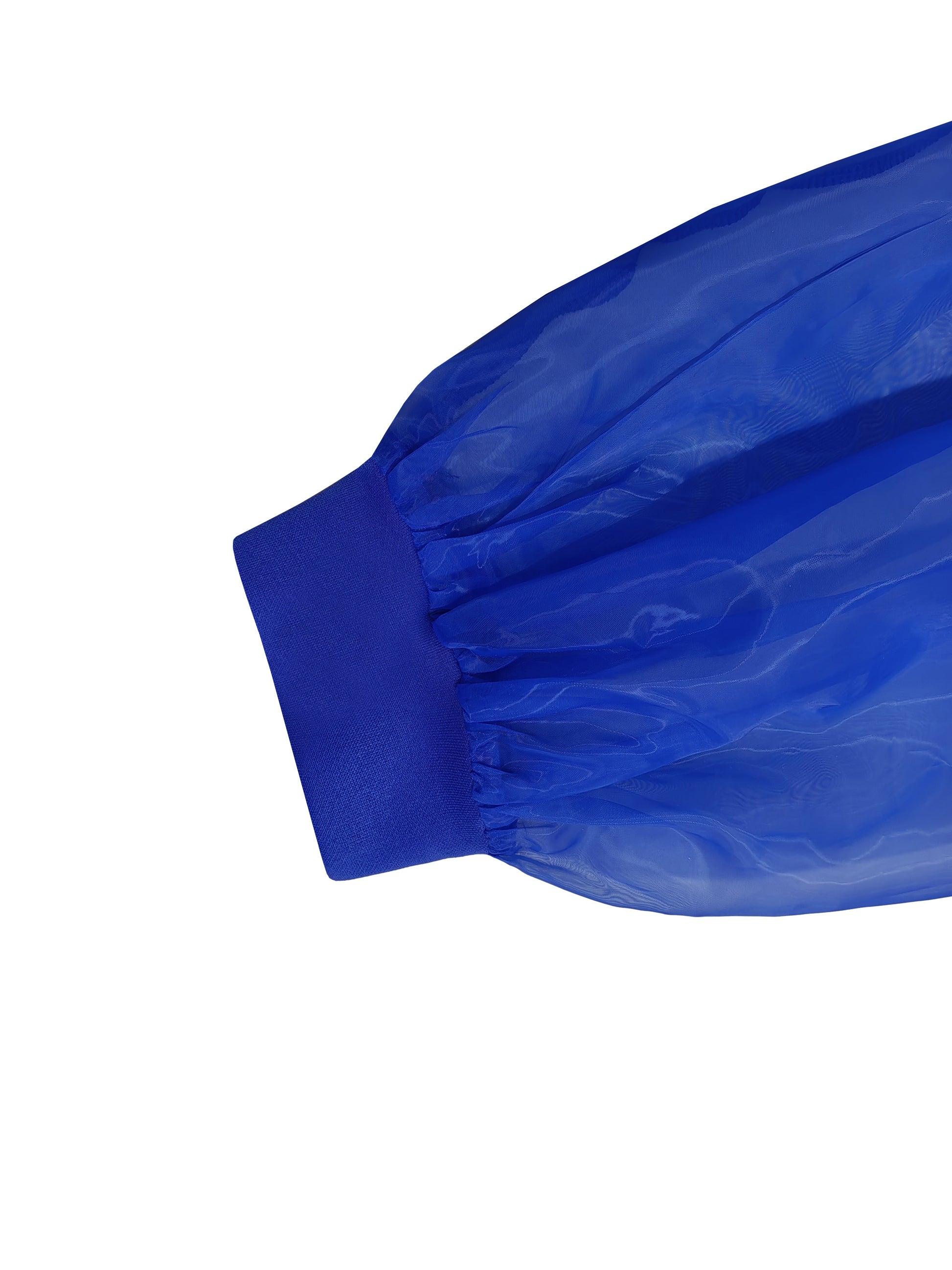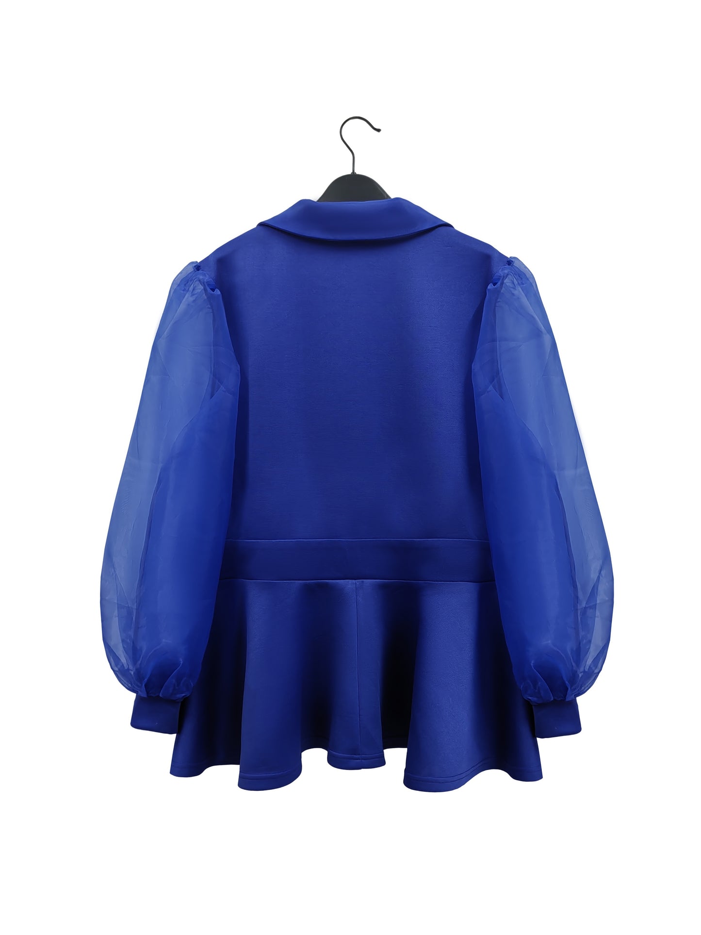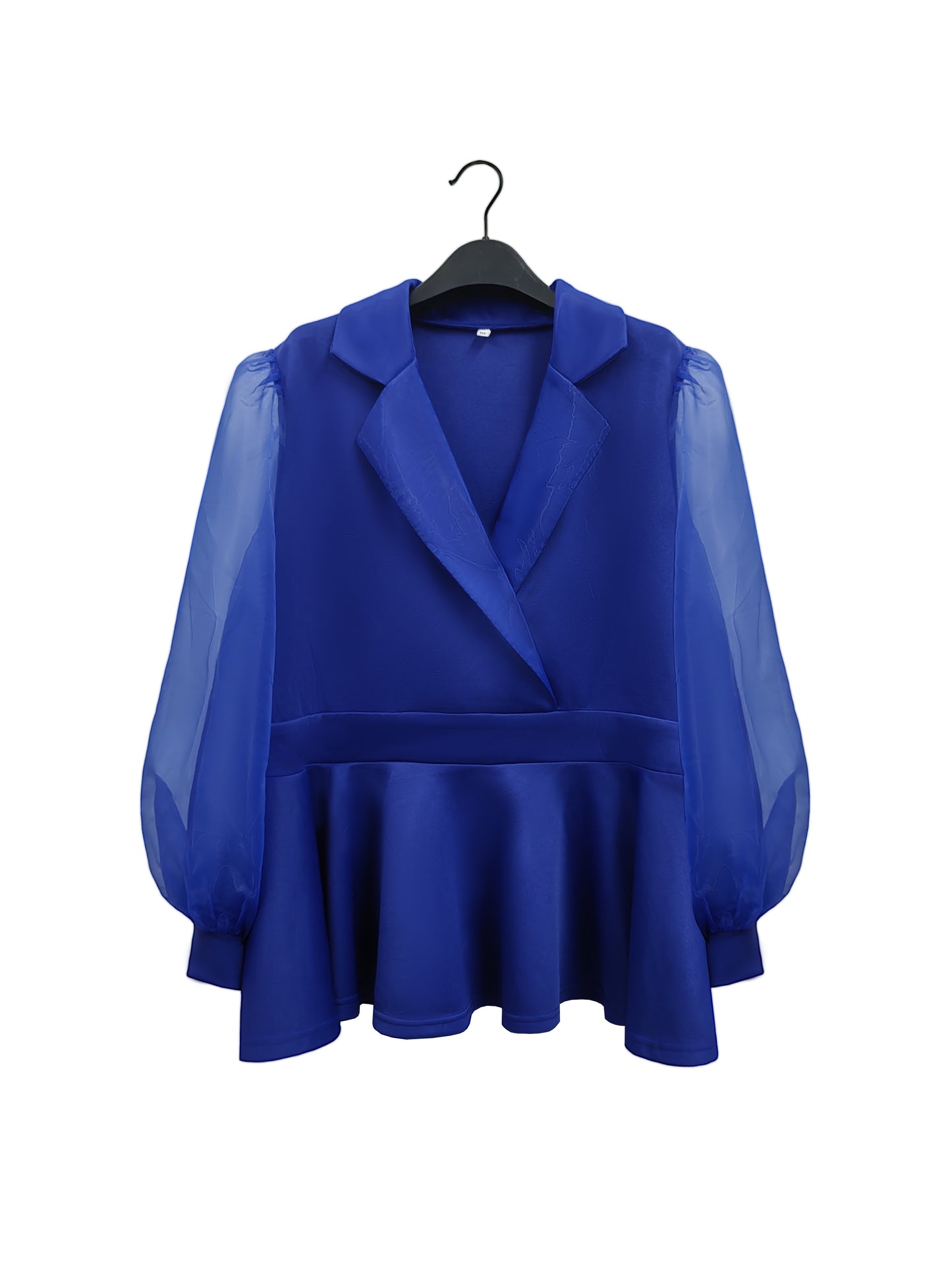 Elegant Plus Size Women's Blouse with Mesh Puff Sleeves and Lapel Collar - Stretchy Polyester, Non-Sheer, Solid Color