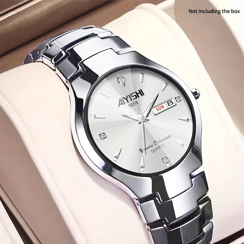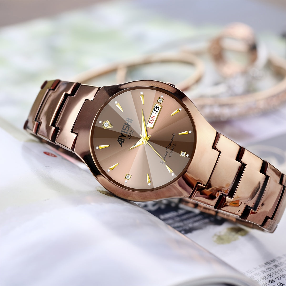 [Elegant Quartz Watch] Rose Golden AIYISHI Elegant Men's Quartz Watch - Luminous Dual Calendar, Date & Sun/Mon Display, Alloy Band - Ideal Gift