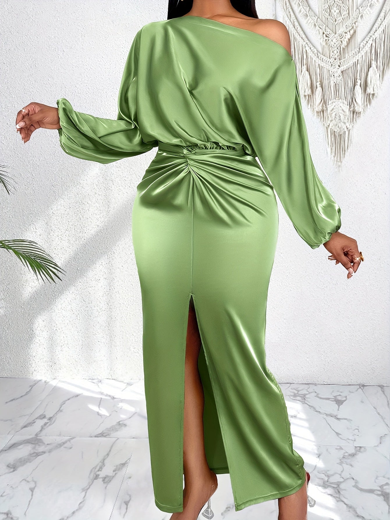 Elegant Satin Goddess Dress - Long Sleeve, Twist Detail, Slant Shoulder, High Slit, Solid Color, Woven Polyester, Flattering Fit, Perfect for Adult Party Wear, Evening Events, and Special Occasions