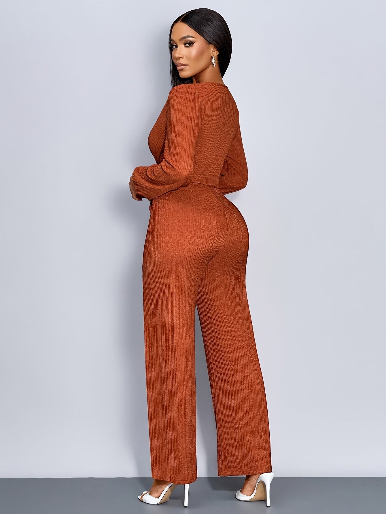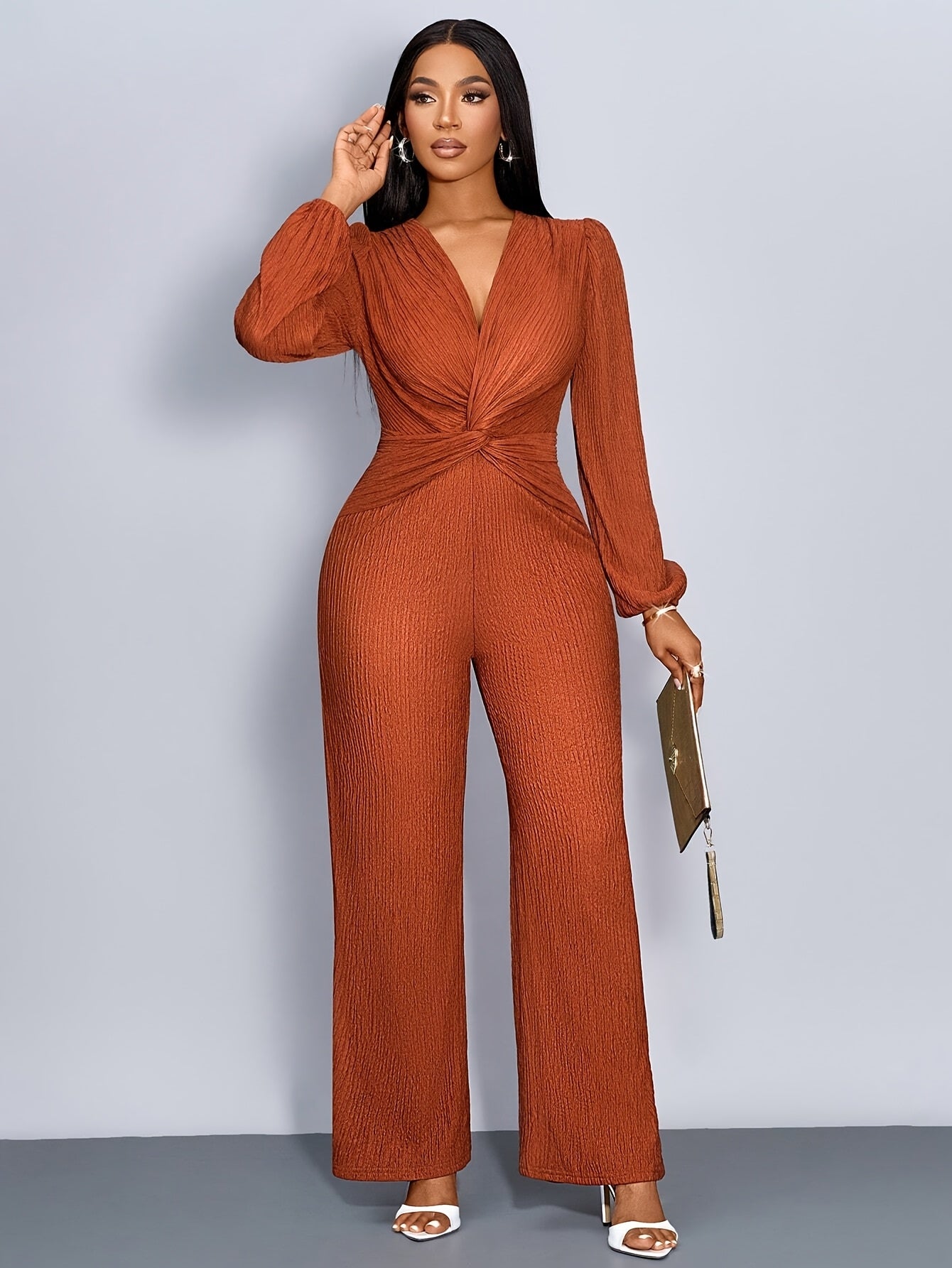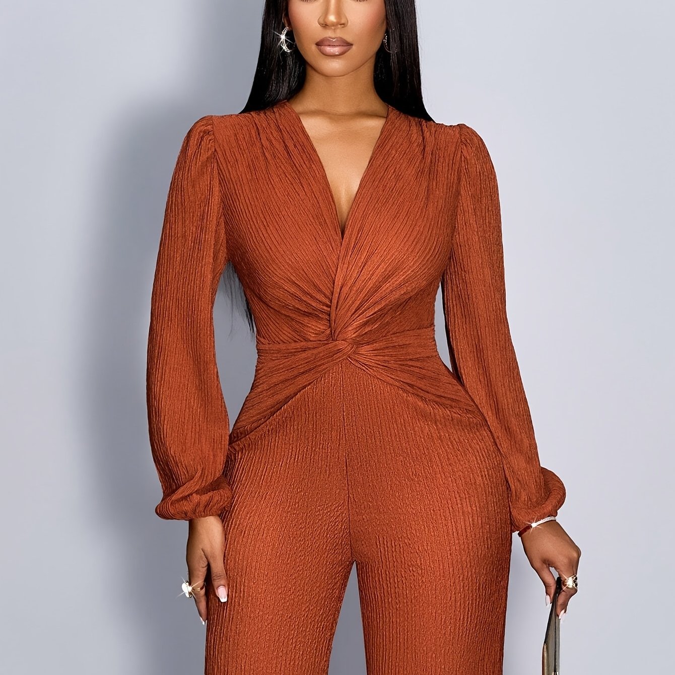 Elegant V-Neck Long Sleeve Jumpsuit for Women, 100% Polyester Knit Fabric, Twist Detail Side Zip Closure, Solid Color All-Season T-Shirt Style Jumpsuit