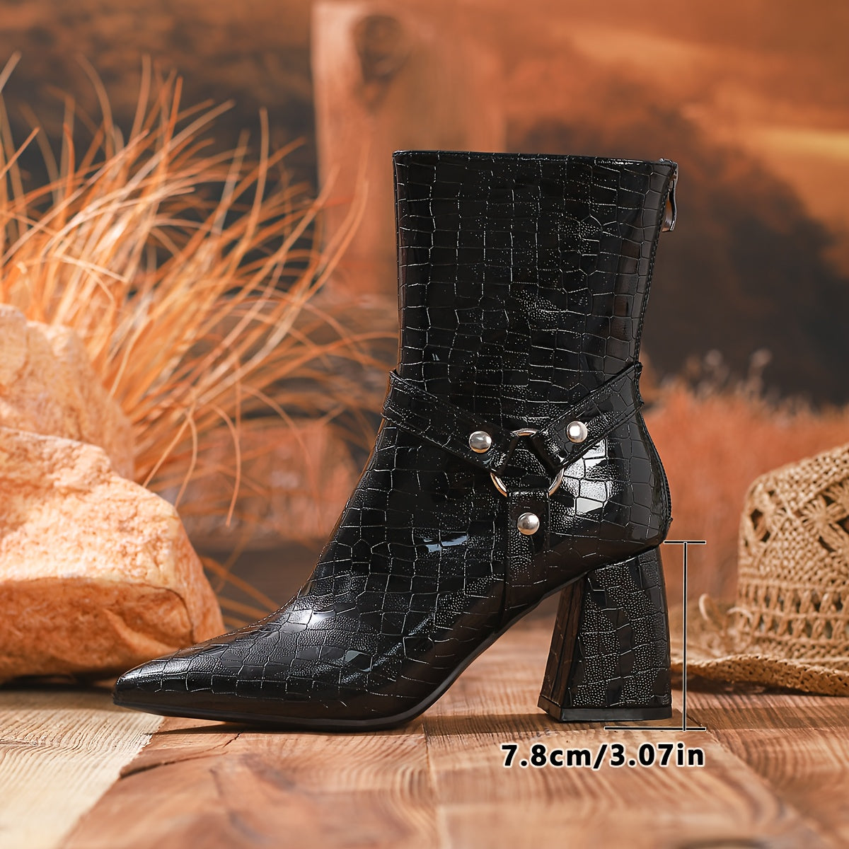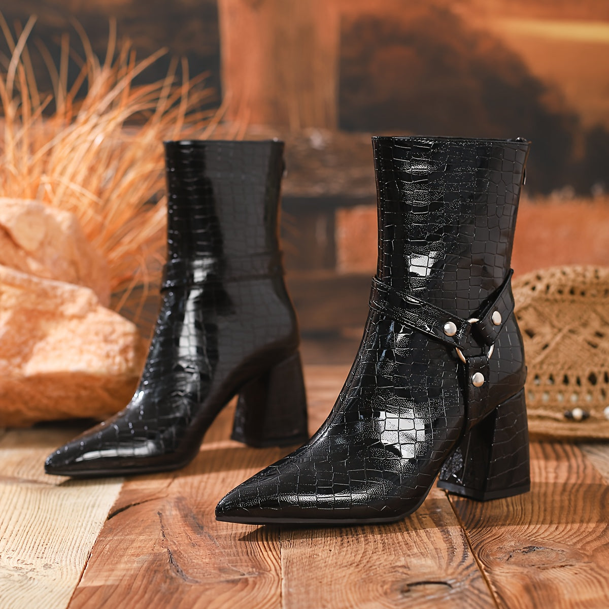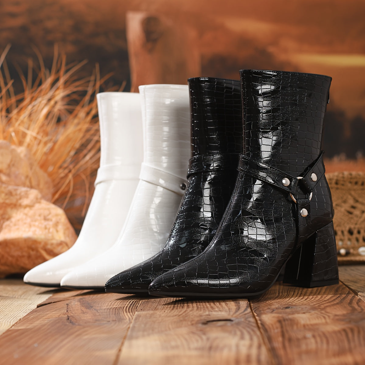 Elegant Women'S Fashion Chunky-Heeled Ankle Boots in Black And White, Featuring a Faux Crocodile Pattern And a Pointed Toe, Comfortable And Versatile Mid-Calf Boots.