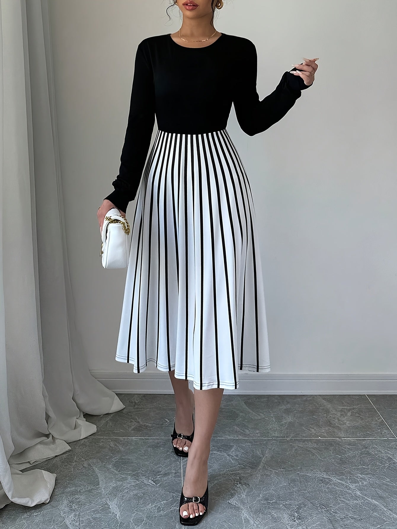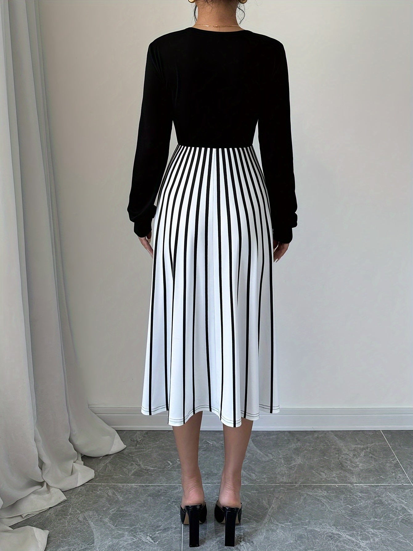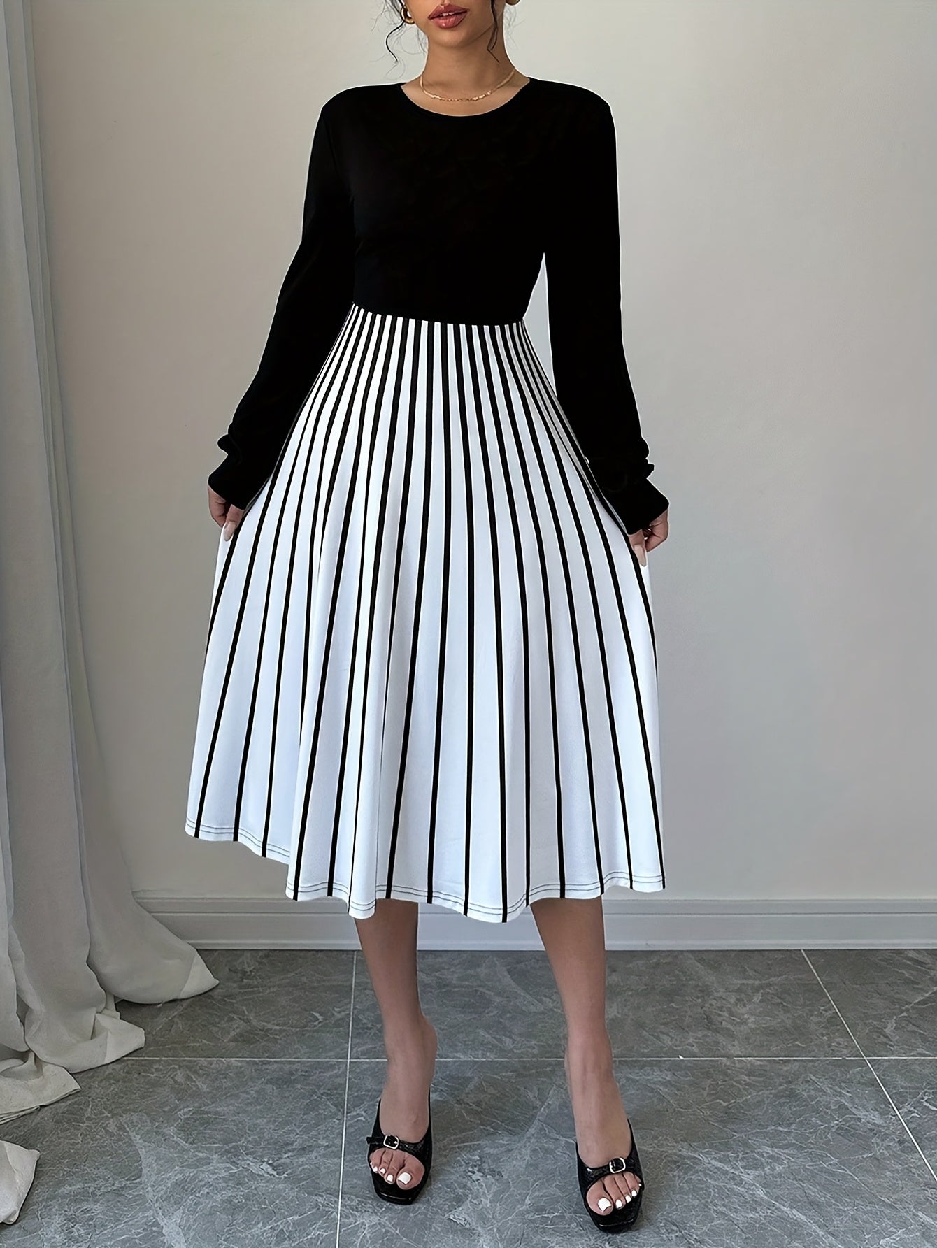 Elegant Women's Long Sleeve Striped Dress, Polyester 95% Spandex 5% Knit Fabric, Crew Neck Fit and Flare Style for Fall/Winter