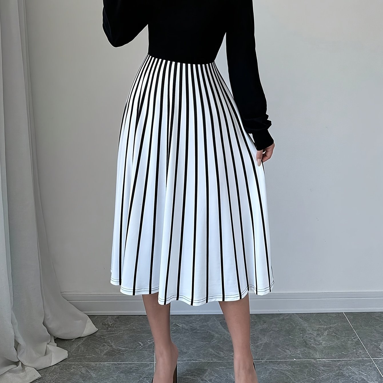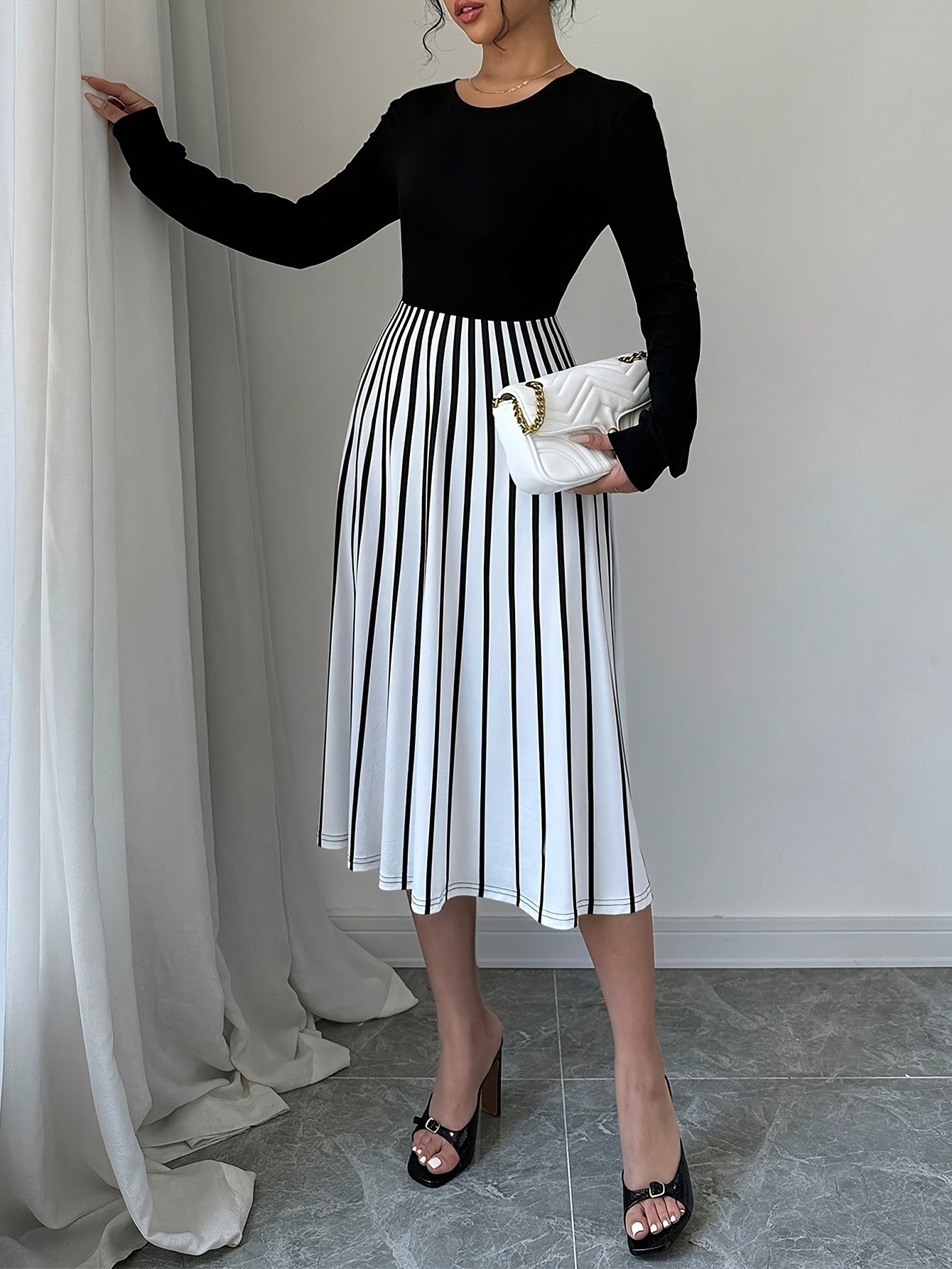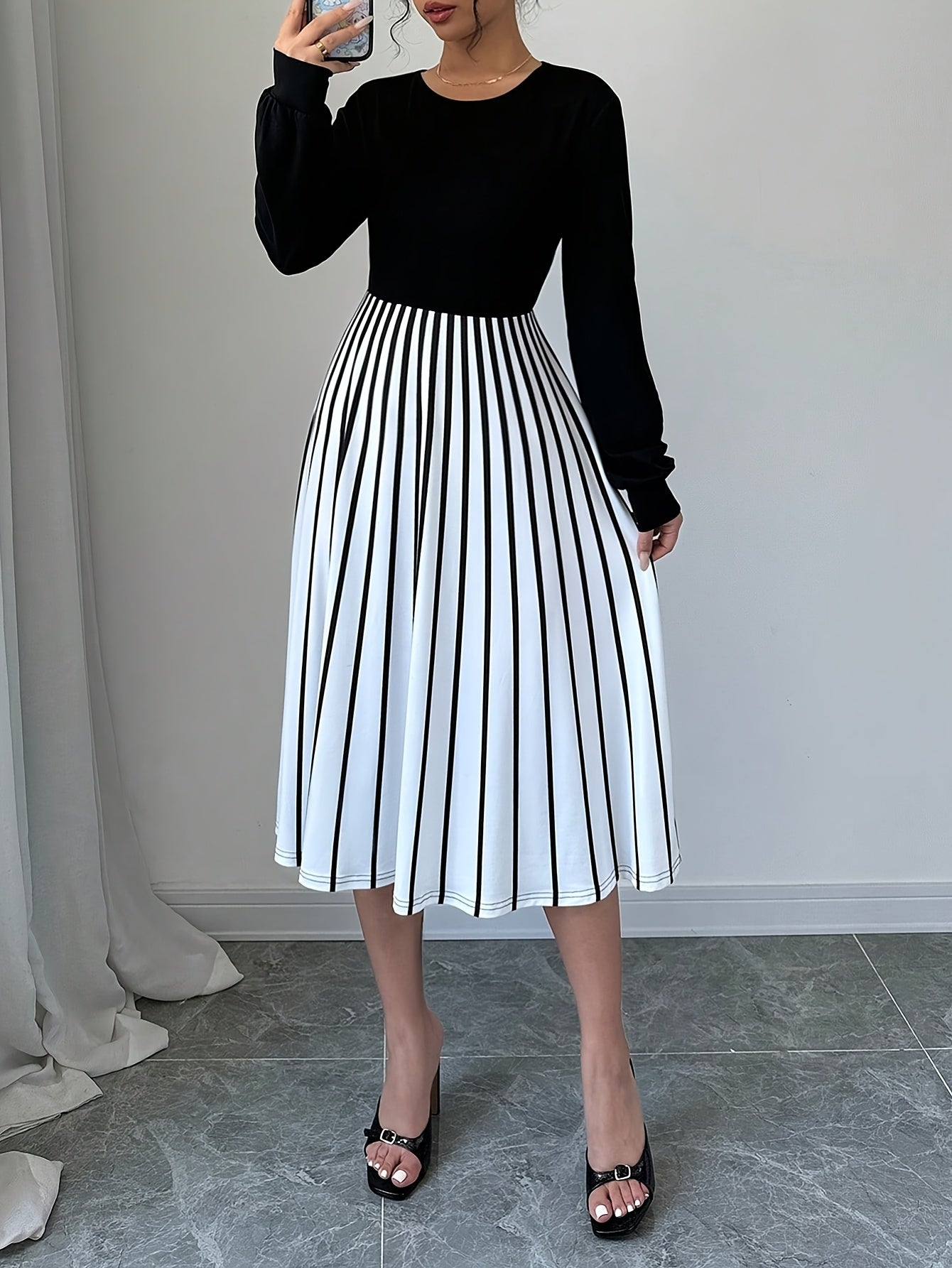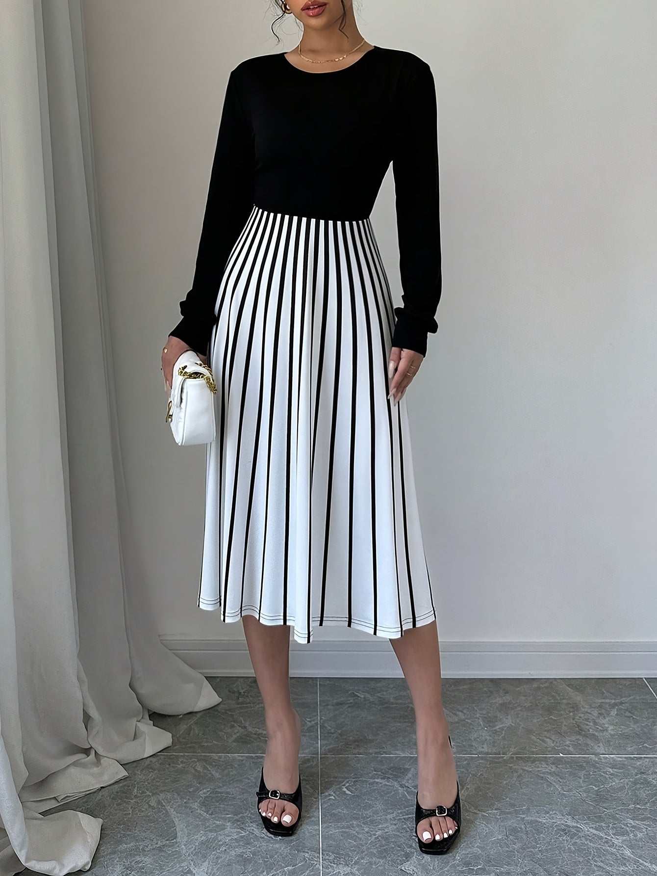 Elegant Women's Long Sleeve Striped Dress, Polyester 95% Spandex 5% Knit Fabric, Crew Neck Fit and Flare Style for Fall/Winter