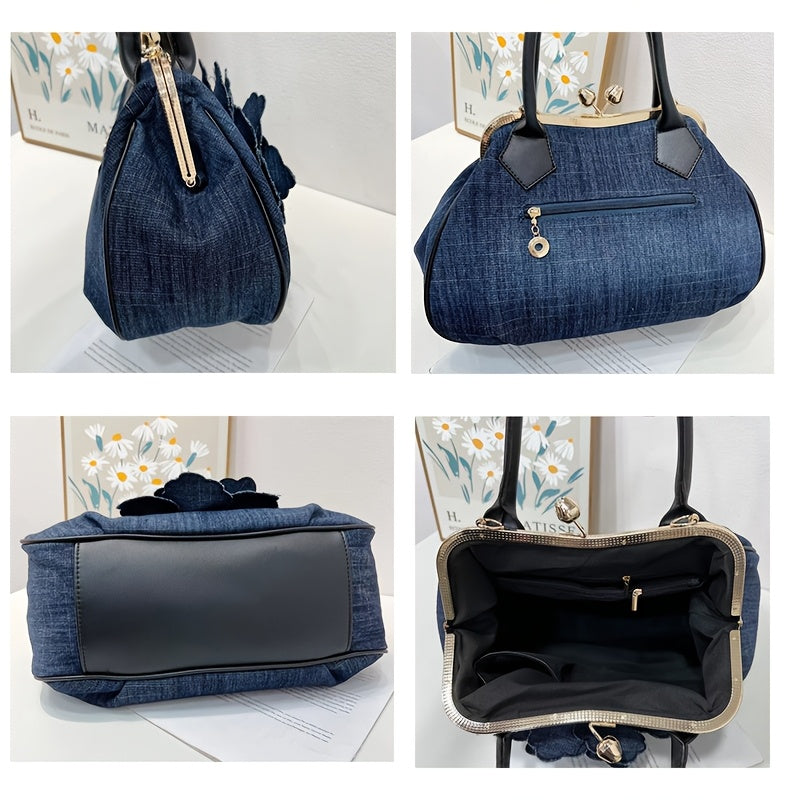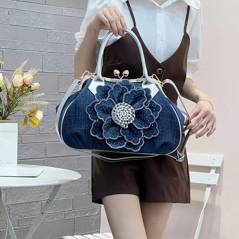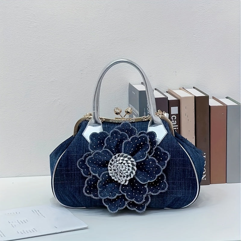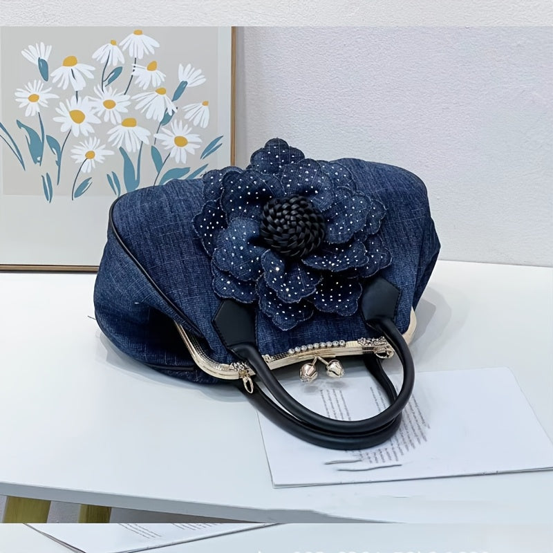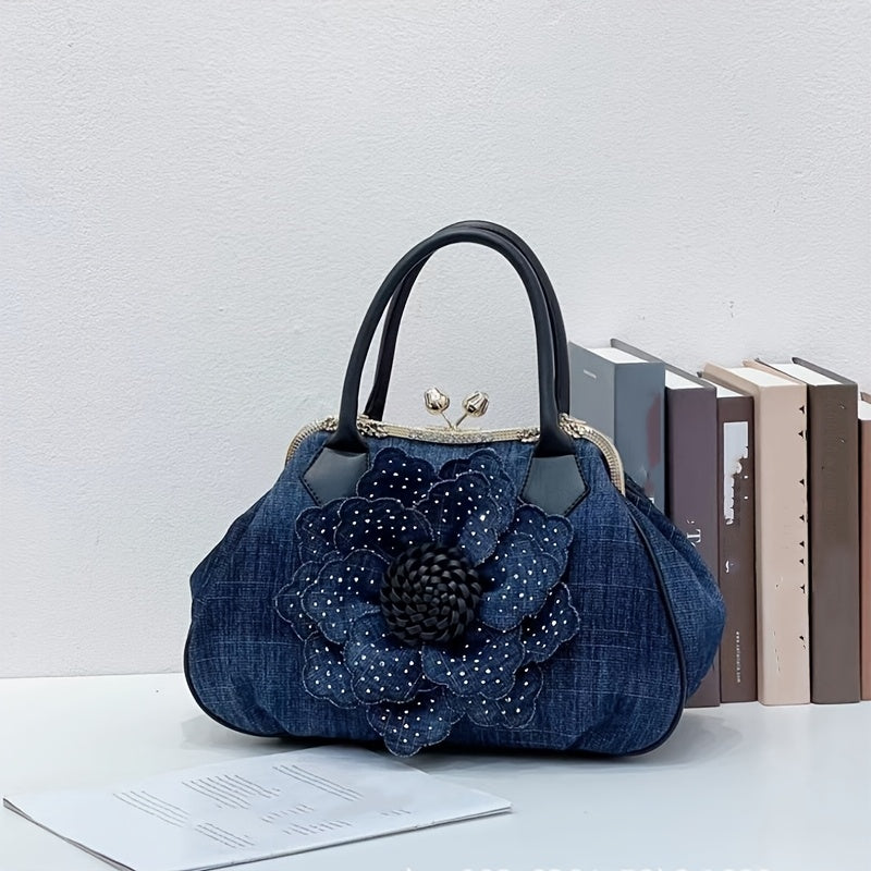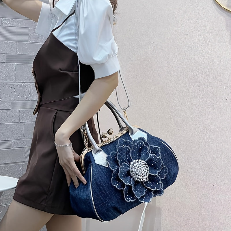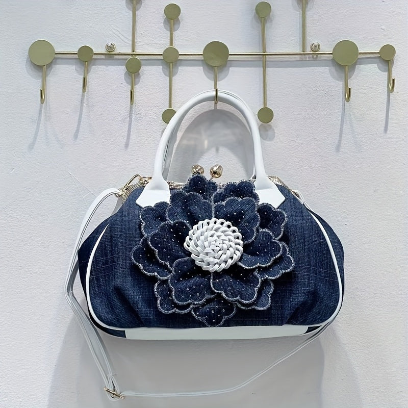 Elegant Women'S Top-Handle Handbag with Floral Design, Large Capacity, Diamond Embellishments, Adjustable Strap, Polyester Lining, Buckle Closure - Black And White, Purse