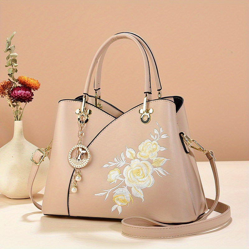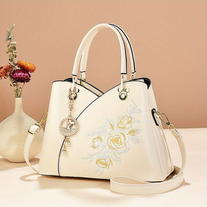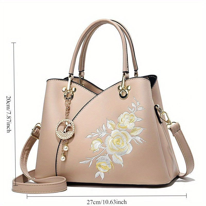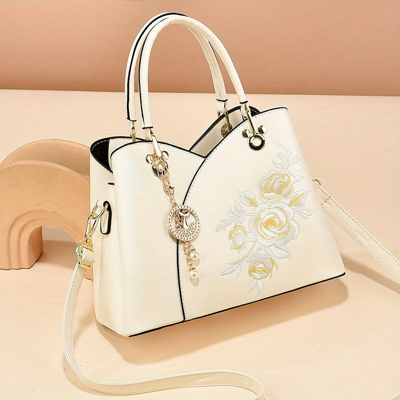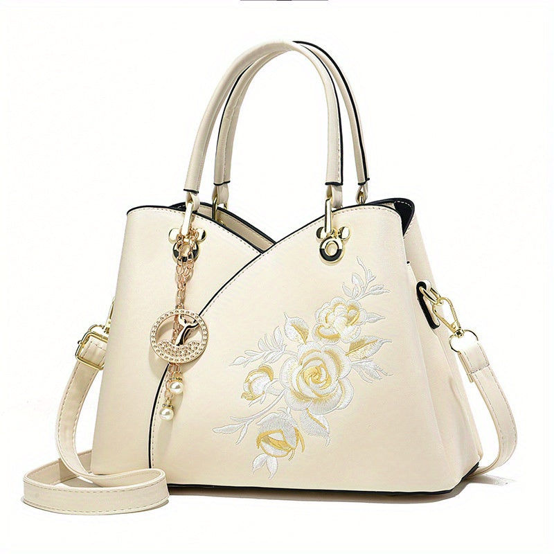 Elegant Women'S Tote Handbag | Large Capacity | with Floral Embroidery | Detachable Shoulder Strap | Versatile Commuter Bag | No-Closure Design | Available in White, Blue, Green, and Black | Perfect for Everyday Use