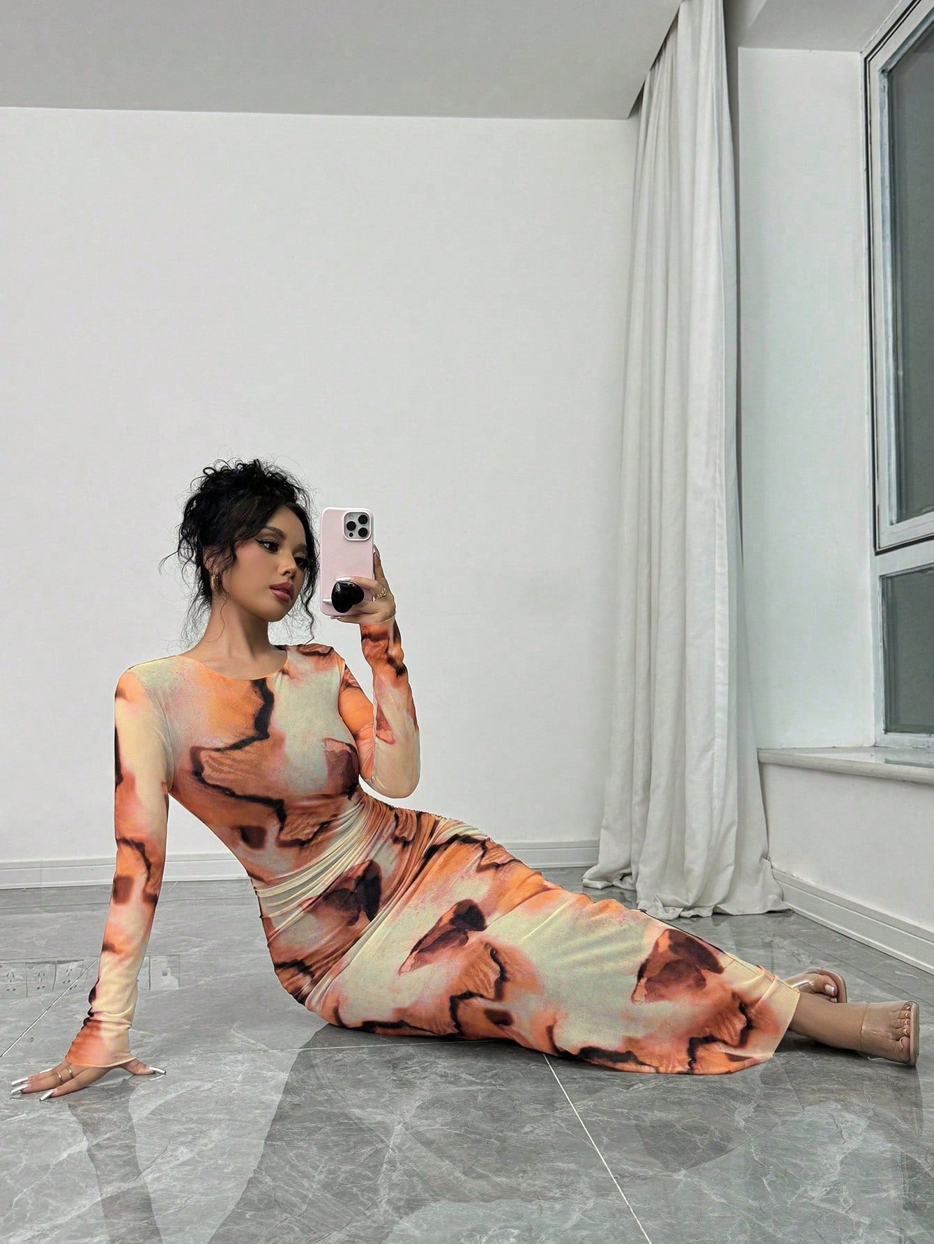 Elenzga 1pc Women Elegant Ombre Long Sleeve Slimming Dress Maxi Women Outfit