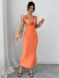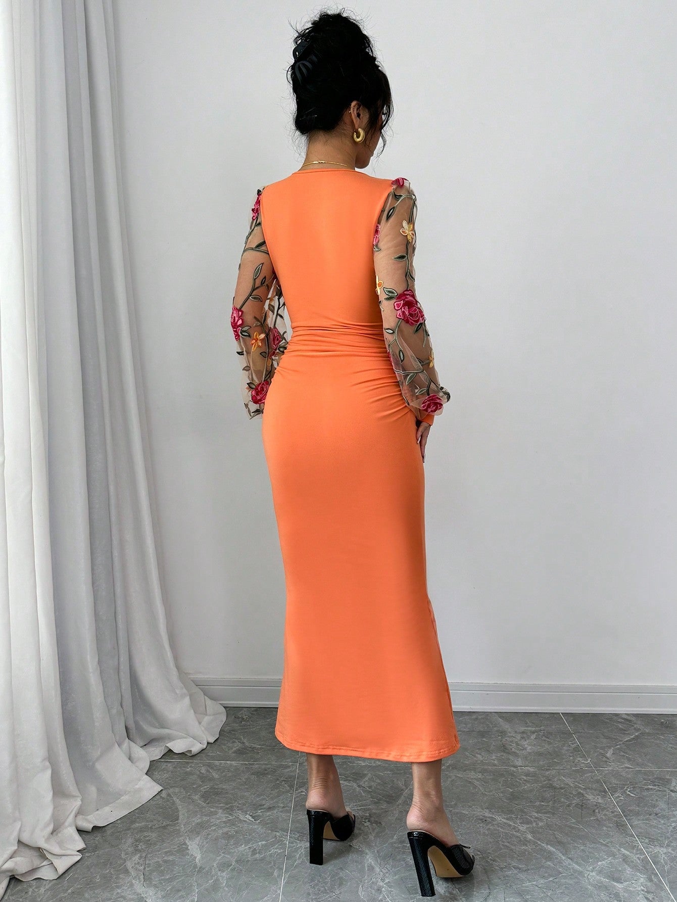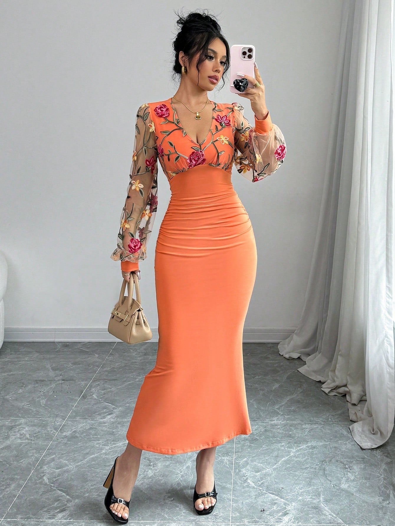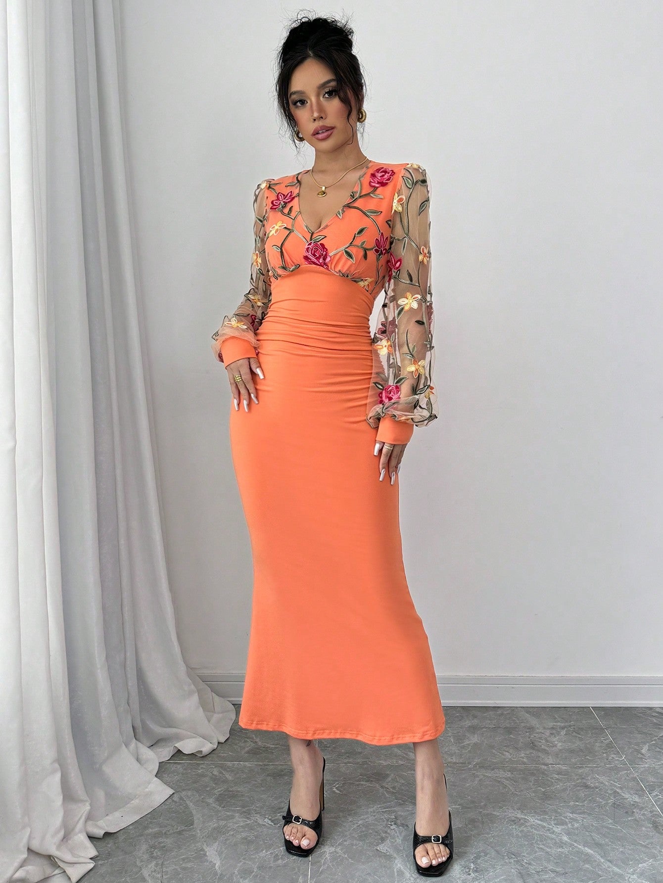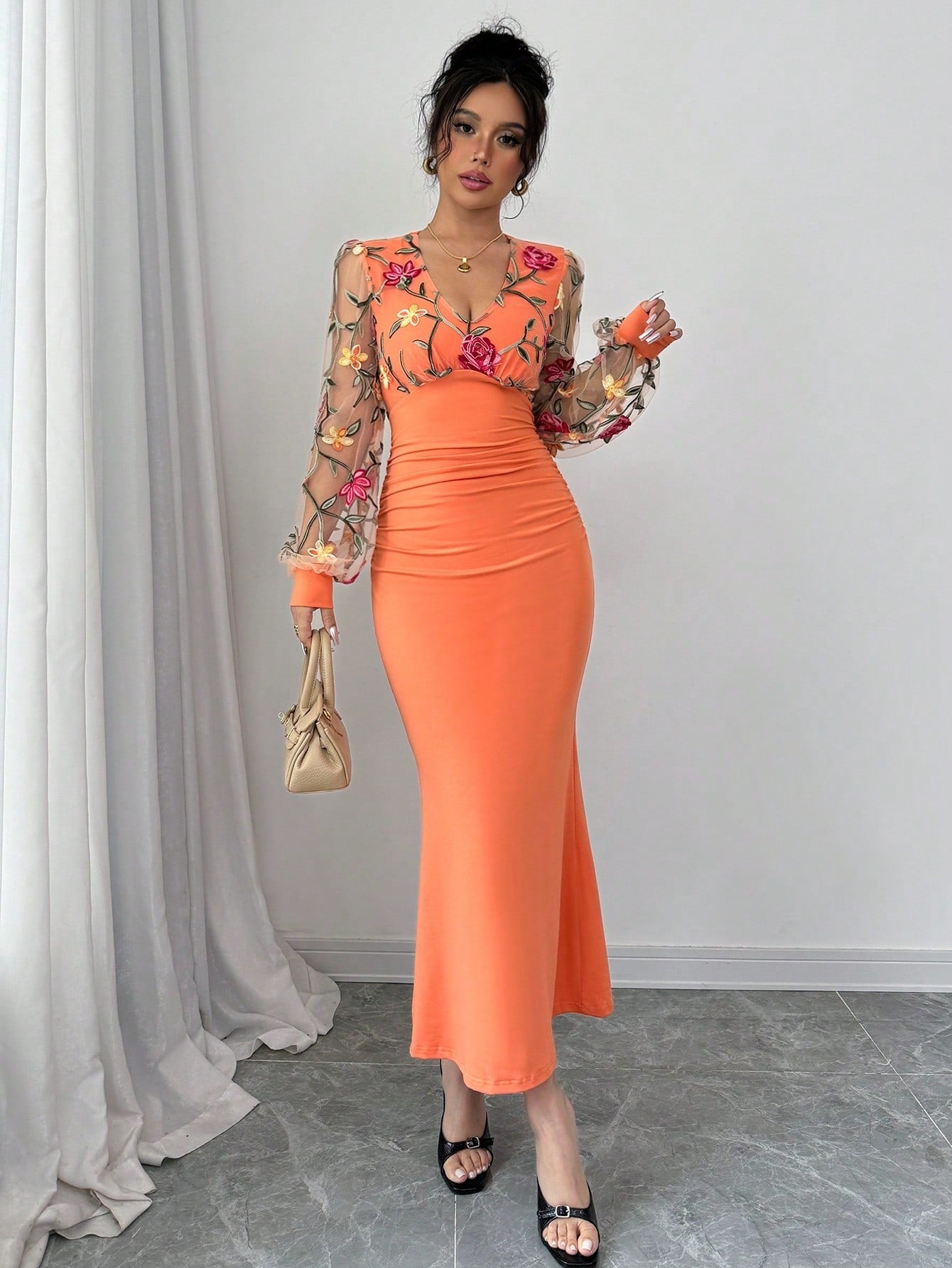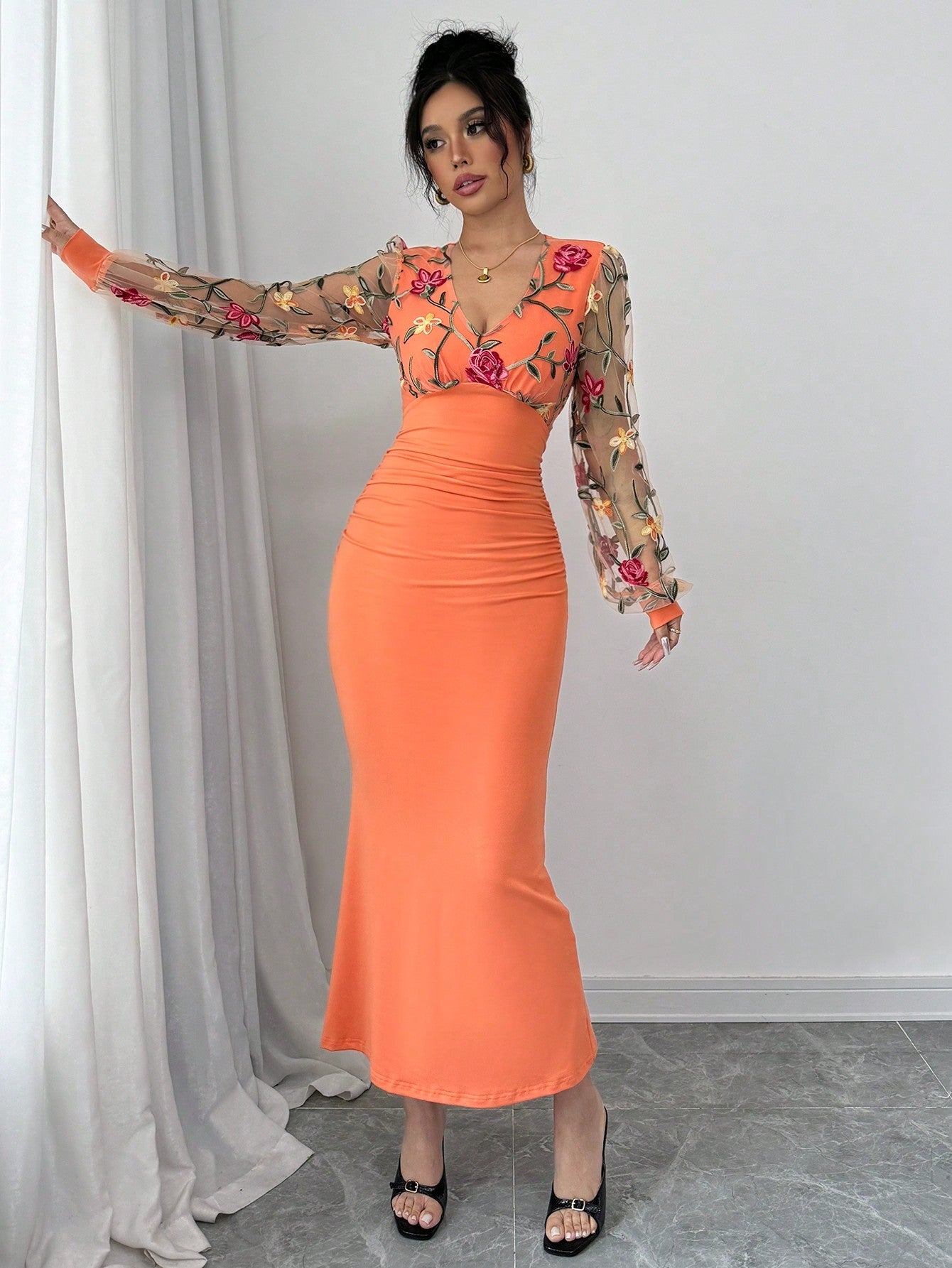 Elenzga 1pc Women's V-Neck Floral Embroidery Mesh Contrast Ruched Elegant Long Sleeve Dress Maxi Women Outfit