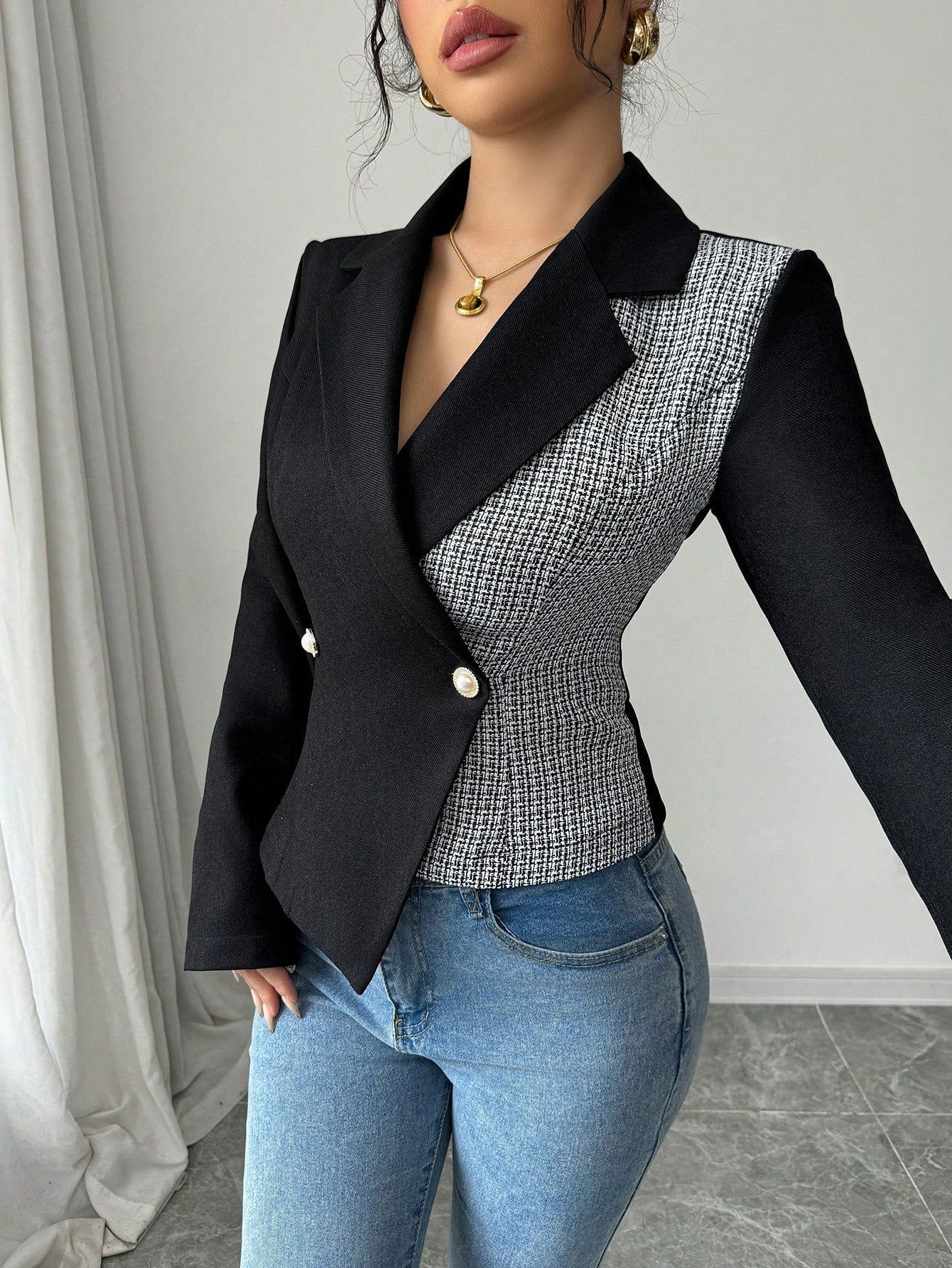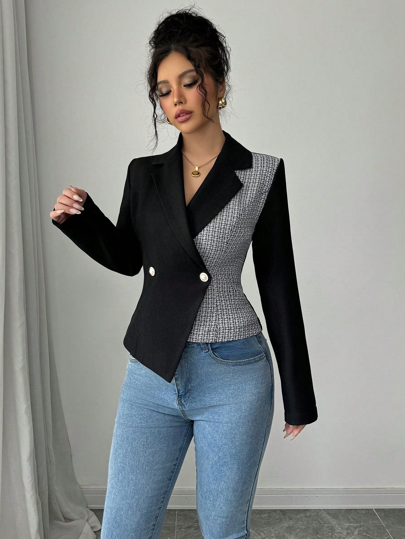 Elenzga Asymmetric Color Block Short Notch Collar Elegant Lady Blazer Jacket