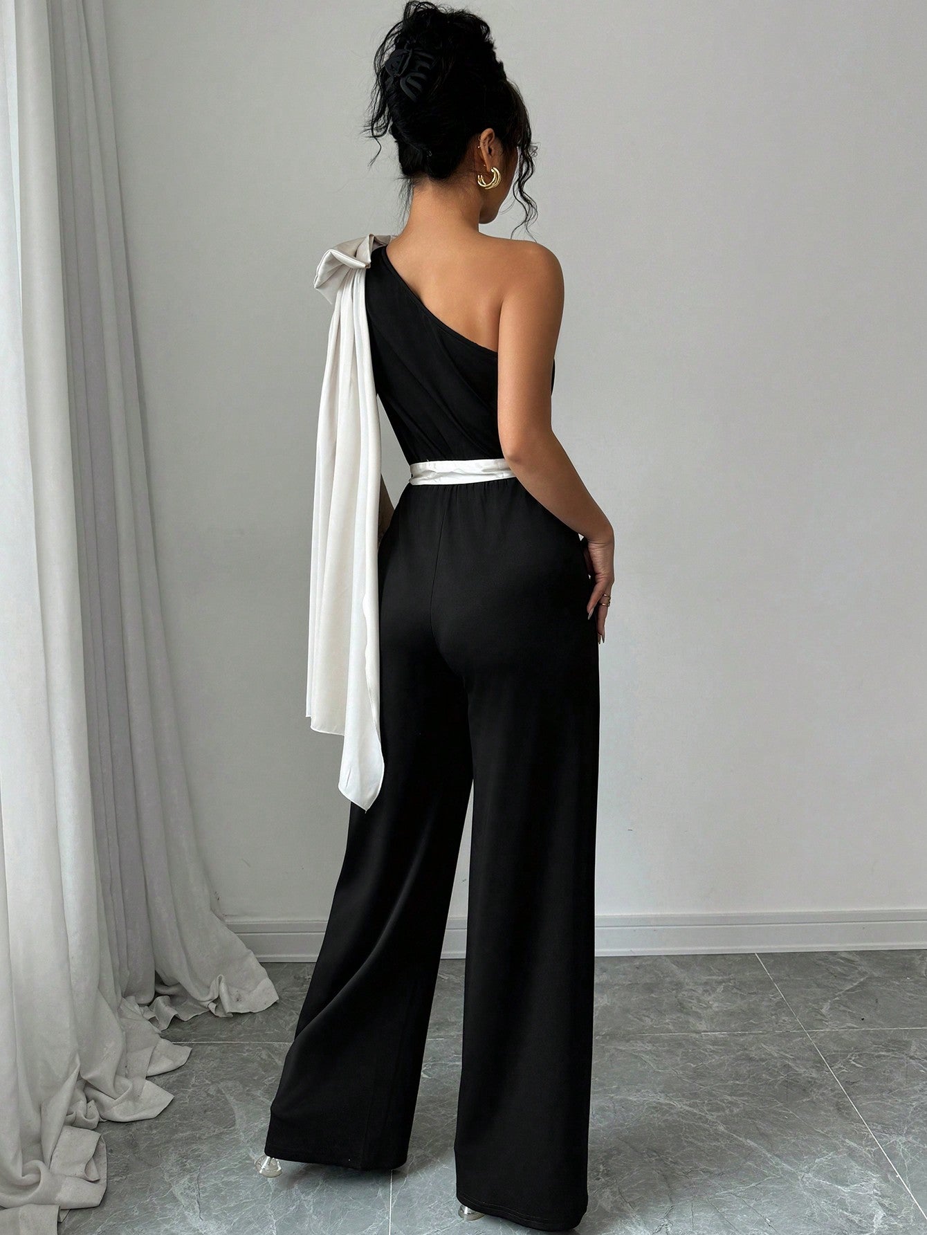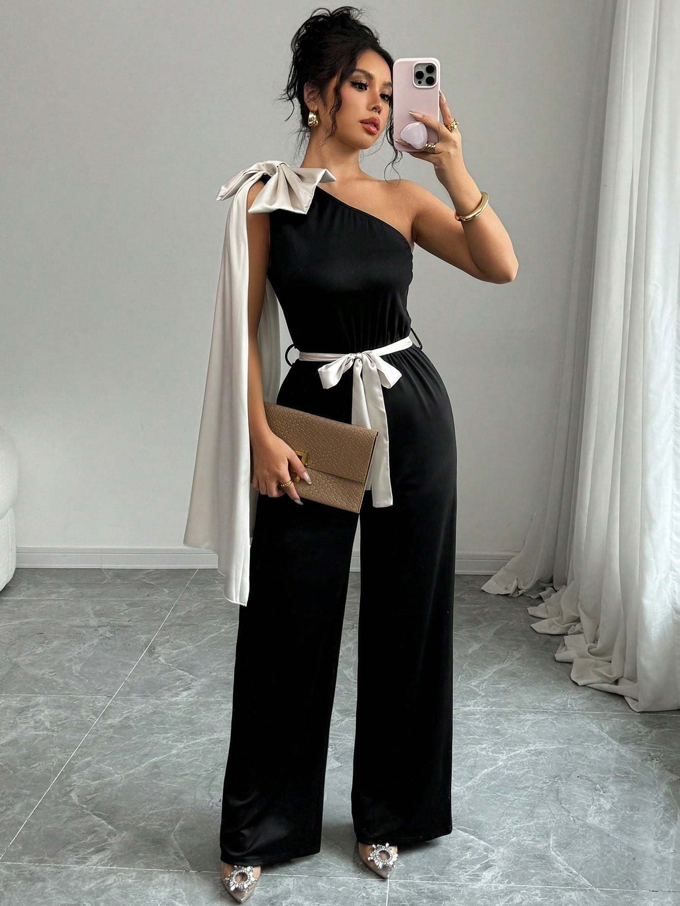 Elenzga Elegant Color Blocking Ribbon Bow Decor Romper