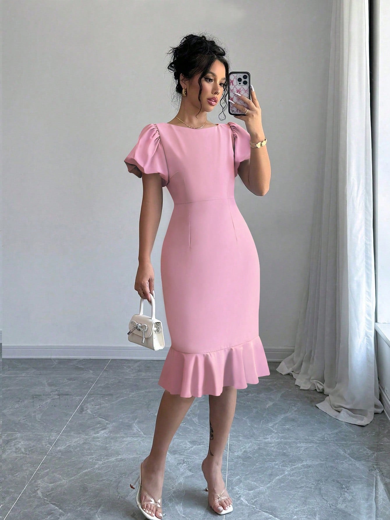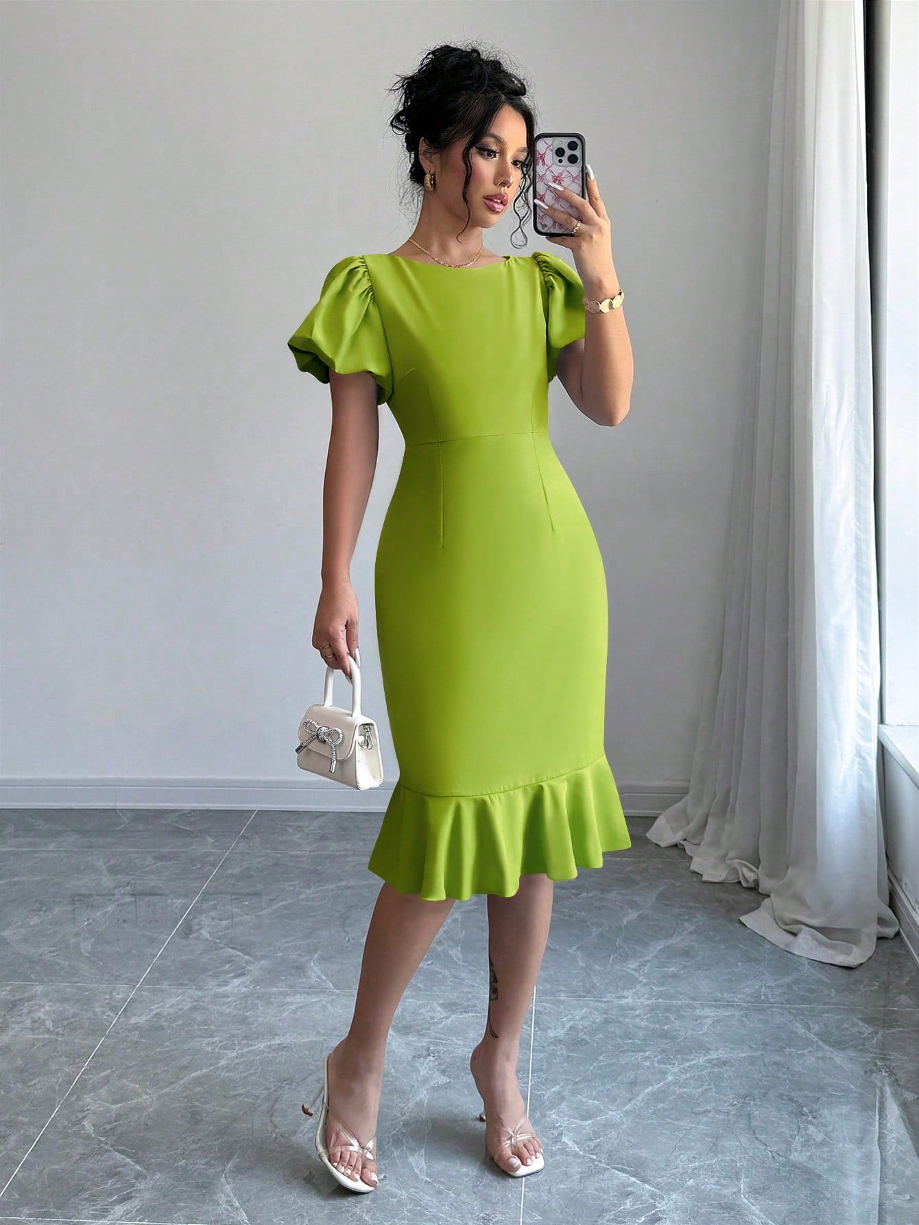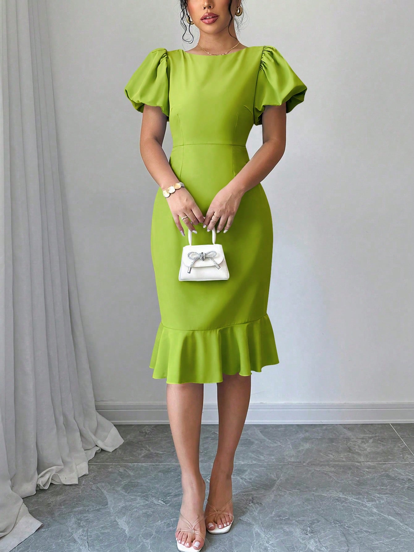 Elenzga Women's Solid Color Round Neck Elegant Petal Sleeve Ruffle Hem Dress