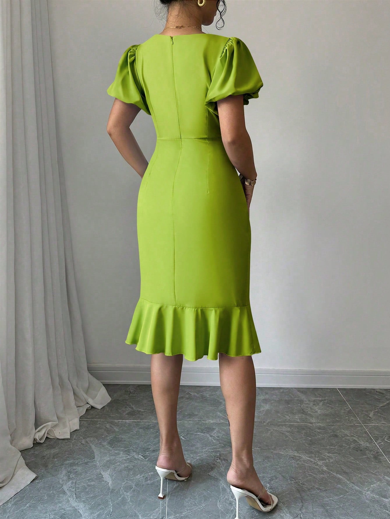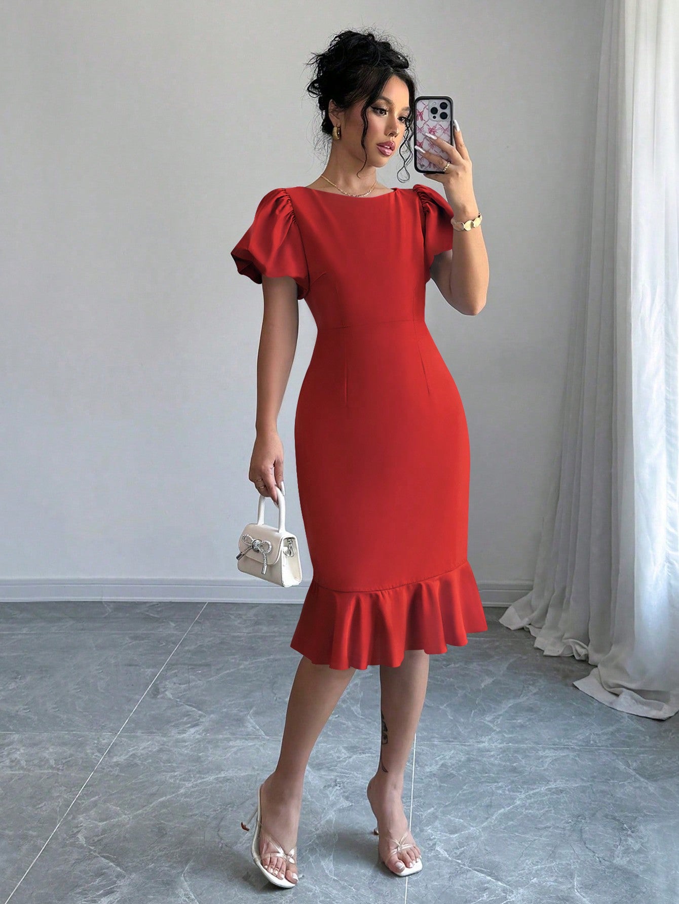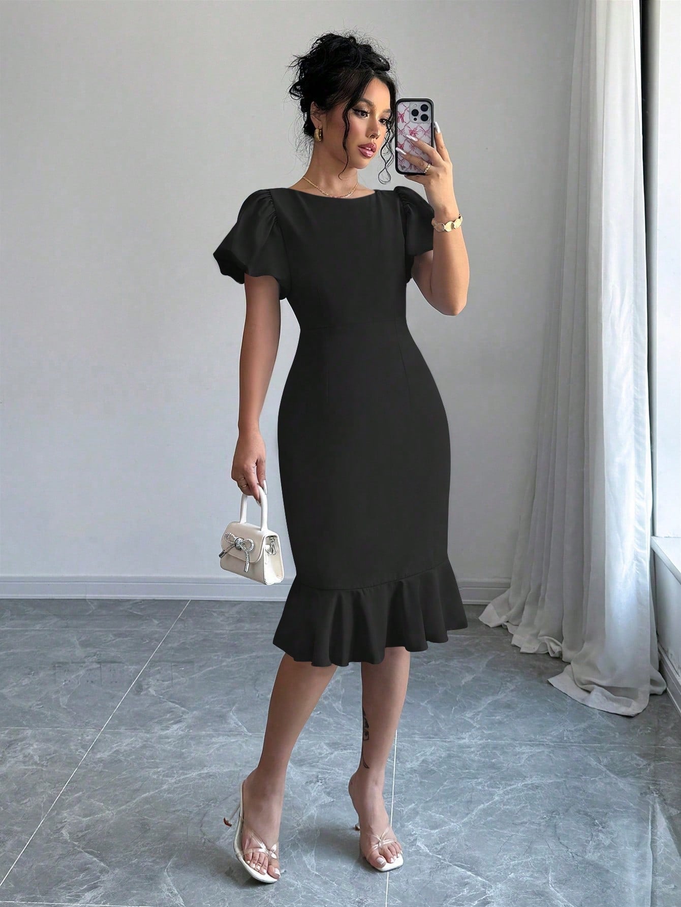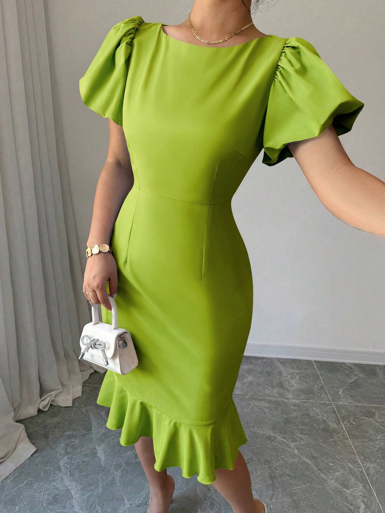 Elenzga Women's Solid Color Round Neck Elegant Petal Sleeve Ruffle Hem Dress