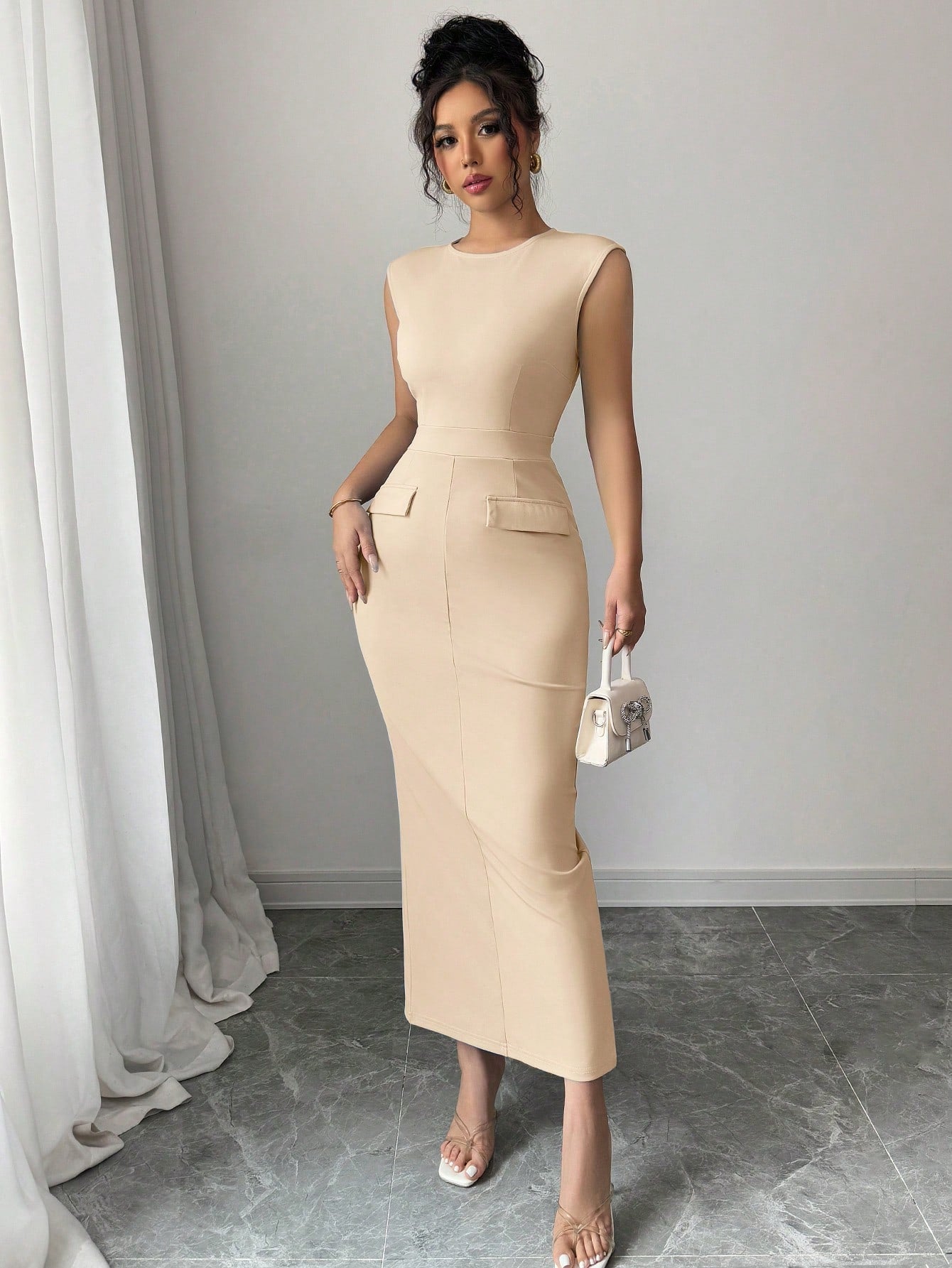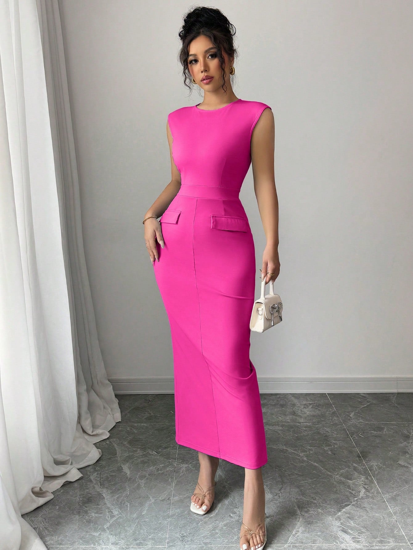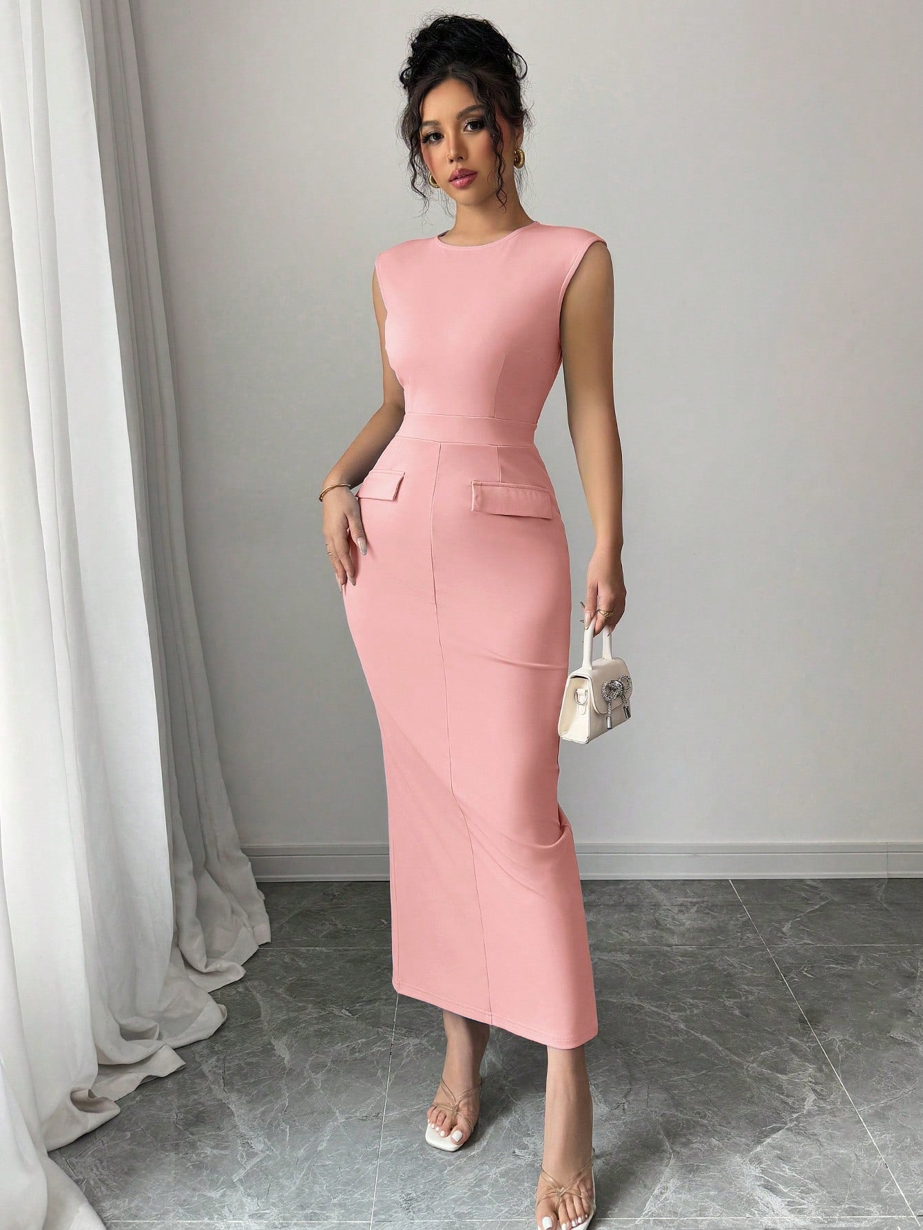 Elenzga Women's Spring/Summer Chic Elegant Knitted Blue Round Neck Sleeveless Side Slit Fitted Midi Dress, Suitable For Dating, Dining, Outdoor Trips, Valentine's Day, Wedding