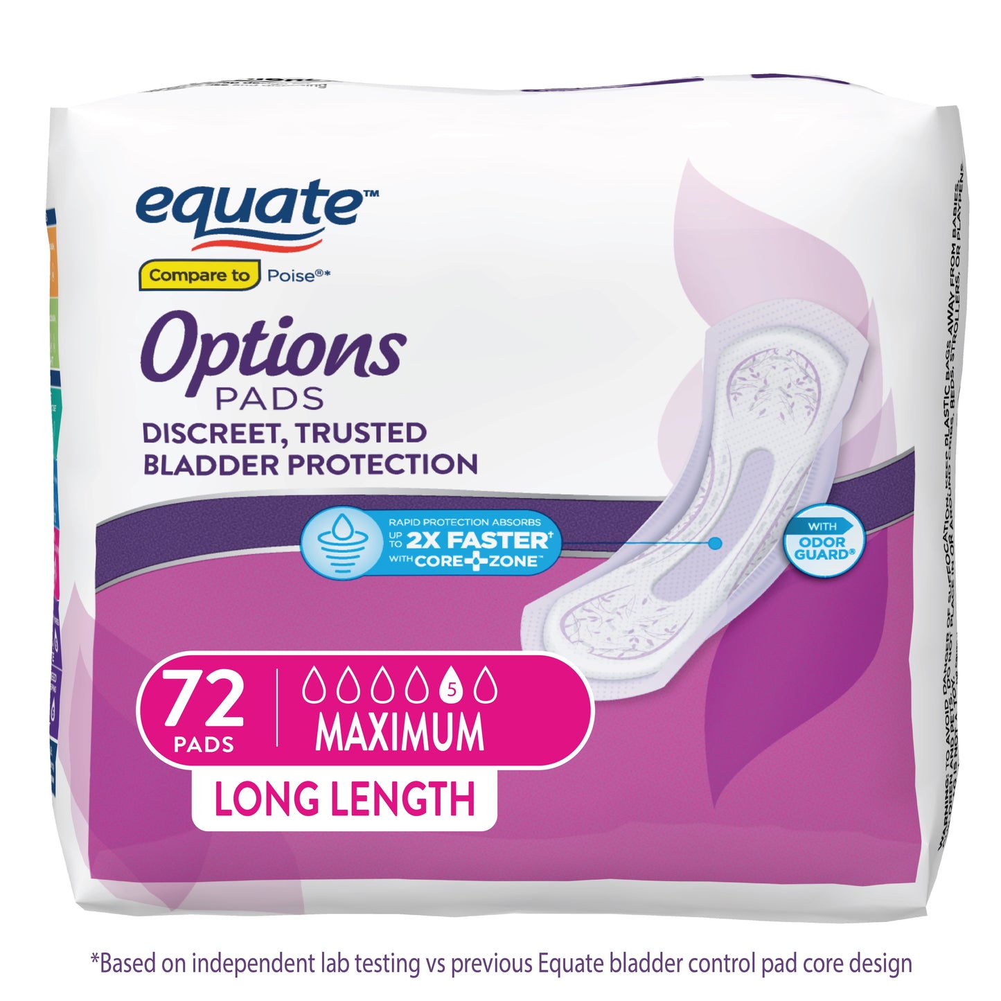 - Equate Options Incontinence Pads for Women, Maximum Absorbency, Long Length, 72 Count