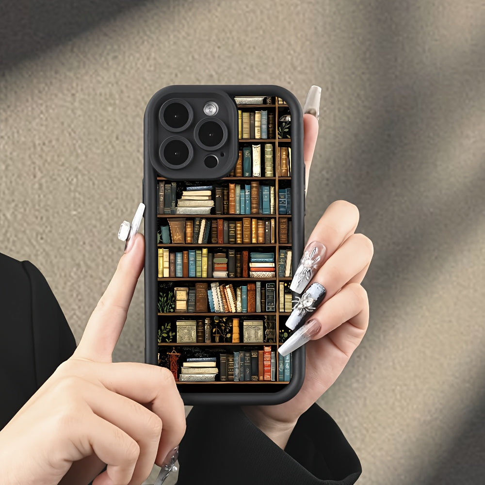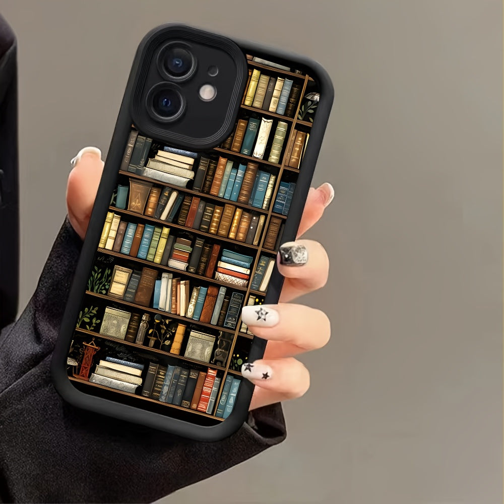 Étui pour téléphone présentant un design imprimé de bibliothèque, compatible avec les modèles iPhone 16, 15, 14, 13, 12 et 11, offrant une protection des lentilles et fabriqué en matériau TPU durable et résistant à la saleté.