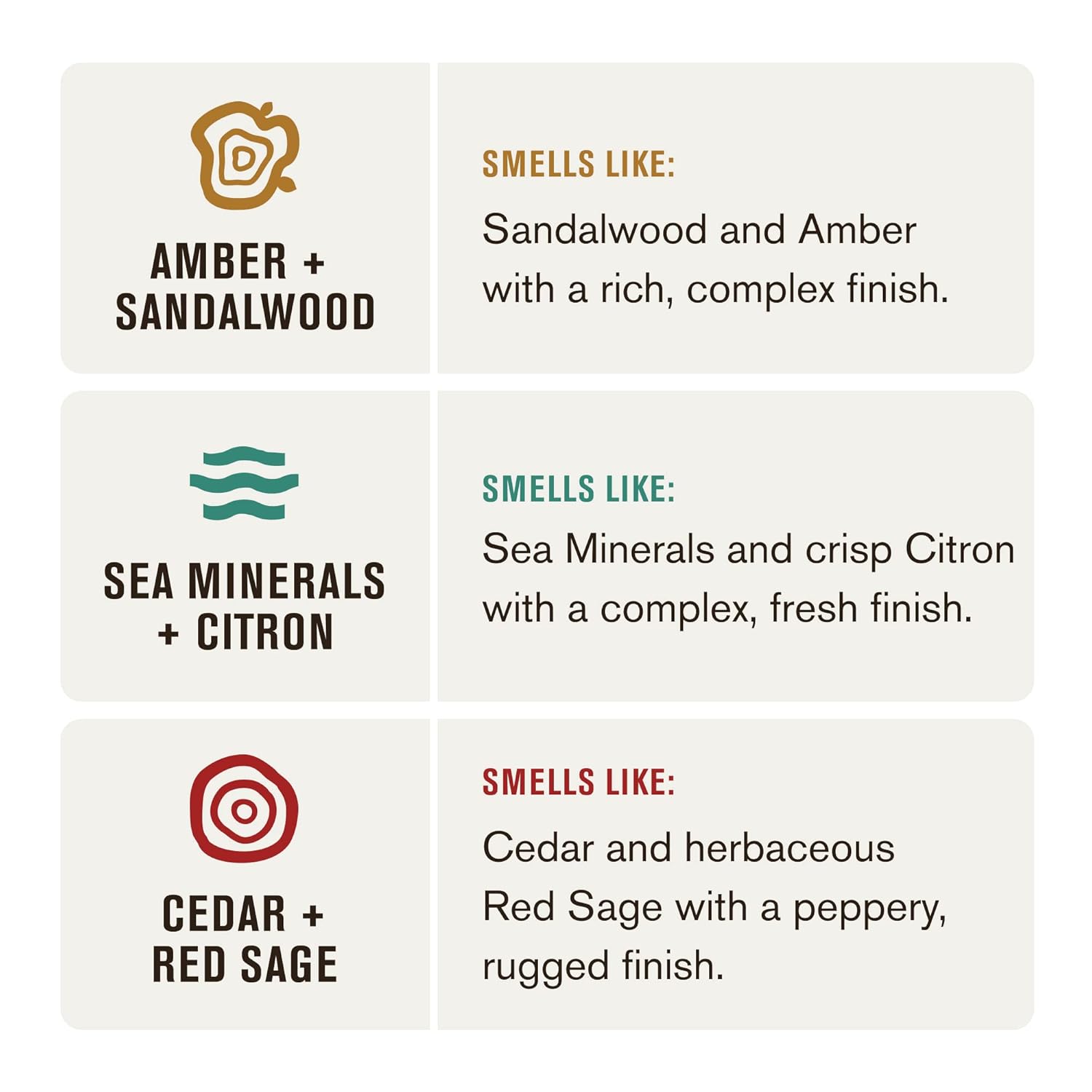 OUTDOOR INSPIRED SCENTS: A warm amber and sandalwood scent complemented by vetiver and vanilla; a woodsy cedar and red sage scent complemented by rosemary and sage essential oils; a refreshing sea minerals and citron scent complemented by bergamot and rosemary essential oils