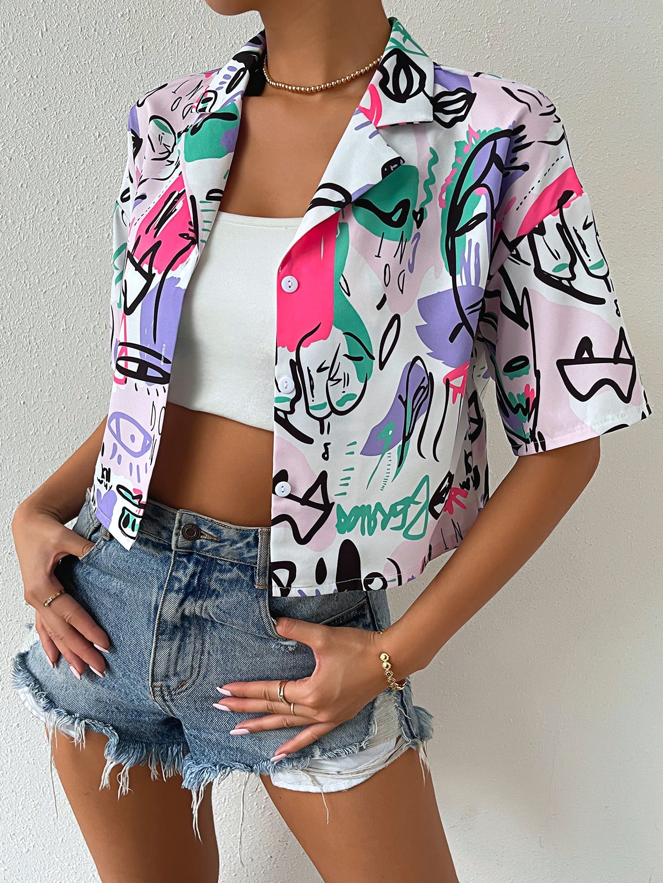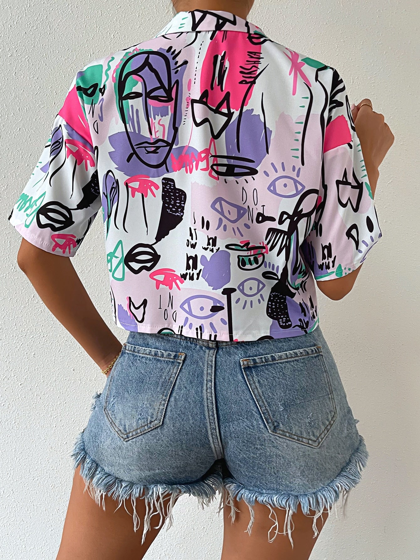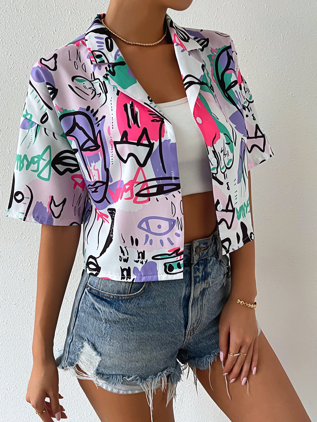 EZwear Women's Short Sleeve Collar Drop Shoulder Crop Top Figure Graphic Button Down Shirts Blouse